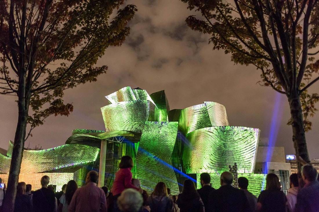 Let’s celebrate the 20th anniversary to the event that has changed the world of architecture in our time, Frank Gehry’s Guggenheim Museum in the Basque country’s city of Bilbao. It has become the most glamorized, sensational, and publicized building of our era, often described as the first building of the twenty-first century, and credited for opening the way for those practicing the architecture of spectacle. I can summarize its innovation in two themes. First, this singular building came to demonstrate the power of architecture to bring an entire city into a global prominence; second, it has brought 68-year old Gehry, whose reputation until then was of an architect of unpolished, often unbuildable architecture world fame, securing his place in the history of architecture. It was an enormous challenge to adapt modern building materials to Gehry’s distorted, sculptural shapes, but it was praised by all critics, becoming a popular tourist destination. 59 productions transform the Museum with Reflections, celebrating its 20th anniversary today. Photos by Justin Sutcliffe.