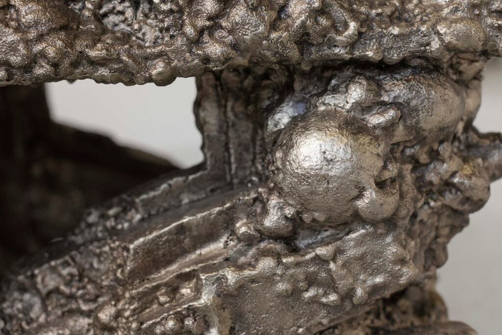 It is always surprising to discover the eclectic range of vocabulary that falls under this umbrella. The pieces in soft metallic platinum-color feel at home at David Gill Gallery whose glory and influence in contemporary design was built around these talents. The curator, Francis Sultana has made his name with signature interiors in homes of art collectors, where he has undisputed expertise in collectible furniture and objects.