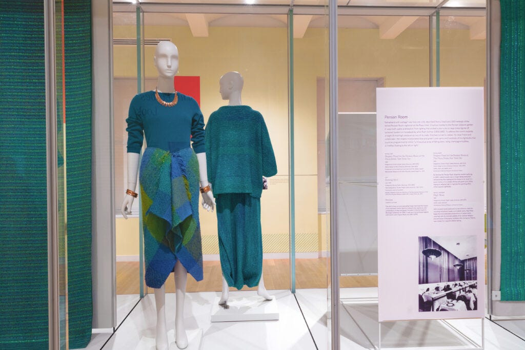 This exhibition is not only fascinating for the newly unearthed information but is also enjoyable and beautiful to look at. Regarding the colorful jeweled tones, Liebes famously said, “all people love colors.” The wooden panels of the museum—the former home of industrial magnate Andrew Carnegie—serve as the perfect backdrop for the gems to be presented. The exhibition and wonderful publication are largely based on the extensive papers which Liebes left for the Smithsonian’s Archives of American Art, which reveals the amazing scope of her collaborations with architects, industrial designers, fashion designers. She contributed the textiles to many of the most iconic American interiors of all time, including Adrian’s Hollywood Salon, Doris Duke’s Shangri-La, the Frist Class Observation Lounge of the SS United States and American Airlines Flagship 747, the Persian Room at the Plaza Hotel, the Marco Polo Club at the Waldorf Astoria and endless more.