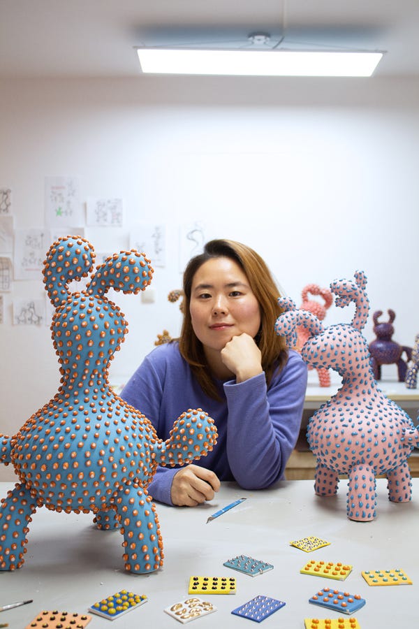 It’s hard to believe that when Korean ceramicist Ahryun Lee started her career, her work was rooted in the Korean tradition. She was inspired by the iconic Moon Jars—the historical unadorned white porcelain vessels in the shape of waning moons—which embodied Confucian ideals, meant to bring a sense of purity and peace. Lee’s early, colorless work could not have been more different than what she creates today. Her most recent work is currently exhibited in a solo show entitled ‘Hoppy Marvels’ by J. Lohmann. The clay sculptures on display are whimsical, playful, and enriched with candy-like colors, signifying a journey of evolution.