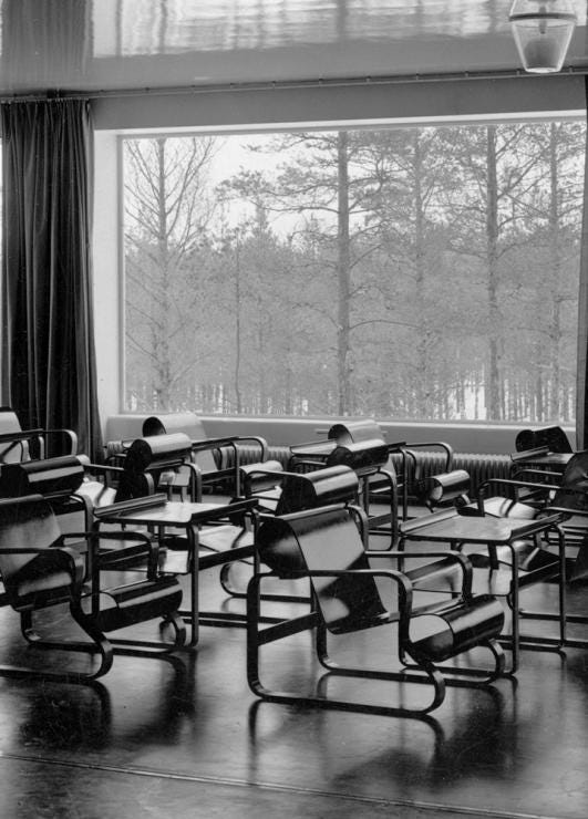 It wasn’t only a design icon, but the Paimio Sanatorium, which Finnish architect Alvar Aalto’s (1898-1976) completed in 1933, has come to capture the intersection of the Modern Movement with Nordic aesthetic sensibility. This icon also came to symbolize the power of modernism to shape a new type of architecture, and in this case, the architecture of the sanatorium. Now, the Designmuseum Danmark devotes an exhibition to this magical building, examining this institution, the Sanatorium, which has since passed from the world. It was highly popular during the age of tuberculosis, a widespread disease, which was the fear of the generation living in the interwar years. The formula of light, air, and cleanliness, combined with a sense of renewal and radical language, had quickly become the mantra of those years. Aalto built his white, pristine building, situated in the middle of the Finnish forests, according to these principles. With white airy spaces, molded plywood furniture crafted in flexible birch to fit to the human body, in aiding the tuberculosis patients to easily breathe, and the allure of a spa, the Paimio Sanatorium has become an icon of 20th-century design and architecture. .