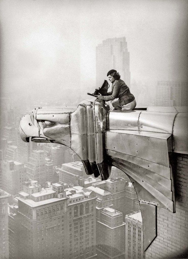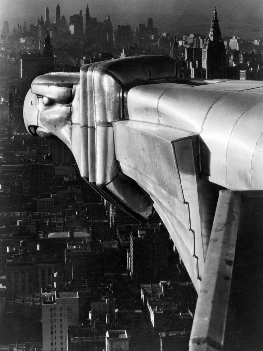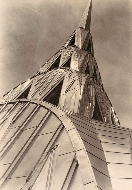 The talk of the day in the architecture/real estate world: Amazon is close to signing a lease for at the Chrysler Building. What has made this skyscraper a New York City architecture icon, and an example of the finest building of its time, or as described by the NYT, “the single most important emblem of architectural imagery on the New York skyline”? The fact that it was the world’s tallest tower when it was completed in 1930, is just a minor detail in the myth of this ambitious tower, initiated by legendary estate developer William H. Reynolds, constructed by Walter Chrysler as the Chrysler’s headquarters, and designed by William Van Alen. The Chrysler Building is one of the greatest manifestations of Expressionism in architecture, and not as many refer to as Art Deco. The metal-and-glass dome with its sharp triangular ornaments came to represent a jeweled crystal, the symbol or hope, victory, and purity. The emotional effect, the symbolic expression of the glass, and the romantic notions of lightning, crystal and rock formations, are all represented in the Chrysler Building. The material, stainless steel, was first utilized in this enormous scale in all exterior ornaments, window frames, the crown, and the needle. The building’s position as a popular cultural icon was further established by the number of films such as King Kong, The Wiz, and Armageddon. I have chosen to illustrate this post by the famed photos by Margaret Bourke-White, who was commissioned by Walter Chrysler himself in 1929, and the famed photo taken by her partner Oscar Graubner “Margaret Bourke-White atop the Chrysler Building”, which depicts her taking a photo of the city’s skyline while sitting on one of the 61st-floor eagle ornaments, recently auctioned by Christie’s (below). Amazon at the Chrysler: visionary company in a visionary building.