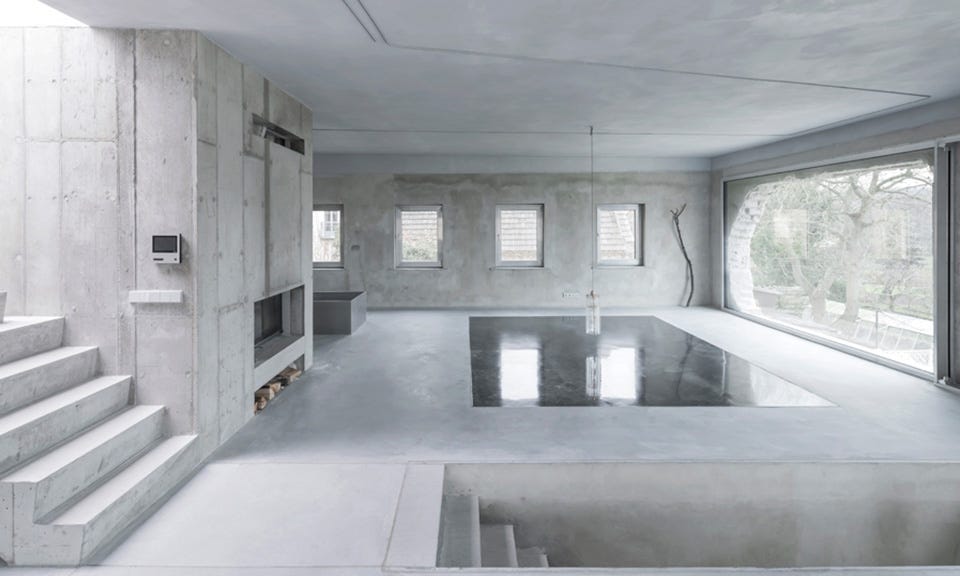 Revisiting Eastern German old architecture and transforming existing buildings while utilizing cost-effective methods, is where architect Arno Brandlhuber has found his most fulfilling creativity. His work has recently been discovered and his Antivilla was filmed by the NYT. In this concrete structure, a former lingerie factory building in Potsdam, originally designed without central heating, he has made his own weekend house, a fully sustainable residence. Its giant windows that Brandlhuber carved out of the massive, heavy concrete walls are standing out for the way the coarse openings are broken through the exterior. In the town, traditionally known for its neoclassical legacy, as the residence of the Prussian king and the German Kaiser (until 1918) and for its cultural landmarks and palaces, this house stands out as the antithesis of the traditional villa, called Antivilla.