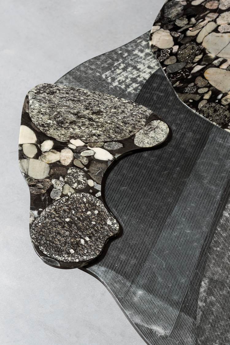 The new furniture series, ‘Archeo Black,’ that Italian interior architect/sculptor/designer Vincenzo de Cotiis has created for Carpenters Workshop Gallery embodies contradictions, standing on the line between the polished and the rough, the new and the ancient, the elegant and the raw, the perfection and the imperfection, reflecting his fascination with the notion of the passing time. The forms are reminiscent of the work of Gio Ponti, though stretched into asymmetrical, expressive compositions, while the materials and the fresh way of combining them are De Cotiis’ regular signature. To him, material always plays a central role in the narrative of the object, as he constantly utilizes those materials that show the signage of time: oxidized metals, salvaged wood, reclaimed leather, recycled fiberglass. It is those materials that have become his tools in creating a sense of time that passed. De Cotiis has become known for the interiors that he didd for Milan’s luxurious stores, and particularly that of Excelsior Milano, an old cinema converted by Jean Nouvel. Just like in his furniture, his interiors promote the aesthetics of raw, rough materials, exposed stone, aged concrete, wheathered metal. In the new collection, the pieces are all in black, white, and shades of gray, crafted of painted glass, ceramic accents, marble, resin, and stones. The exhibition opens this week at the New York location of Carpenters Workshop Gallery.