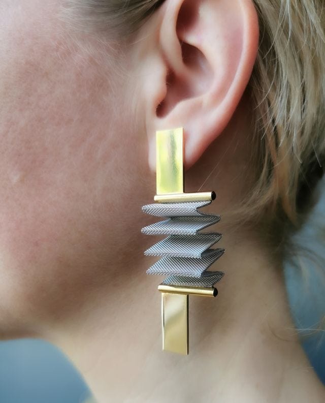 The solo show, presented at Galerie MiniMasterpiece in Paris, includes earrings, rings, and bracelets, where the key material is pleated metal mesh, an unusual material that bestows the collection with a crispy, modernist, and constructivist look. Mesh is also a central material in the duo’s buildings and has been introduced by them not only as a building material, but also as a poetic expression in their architecture, utilizing mesh in defining architecture boundaries and spaces while also using it as a tool to bring light into a space. In fact, mesh has become their signature material.