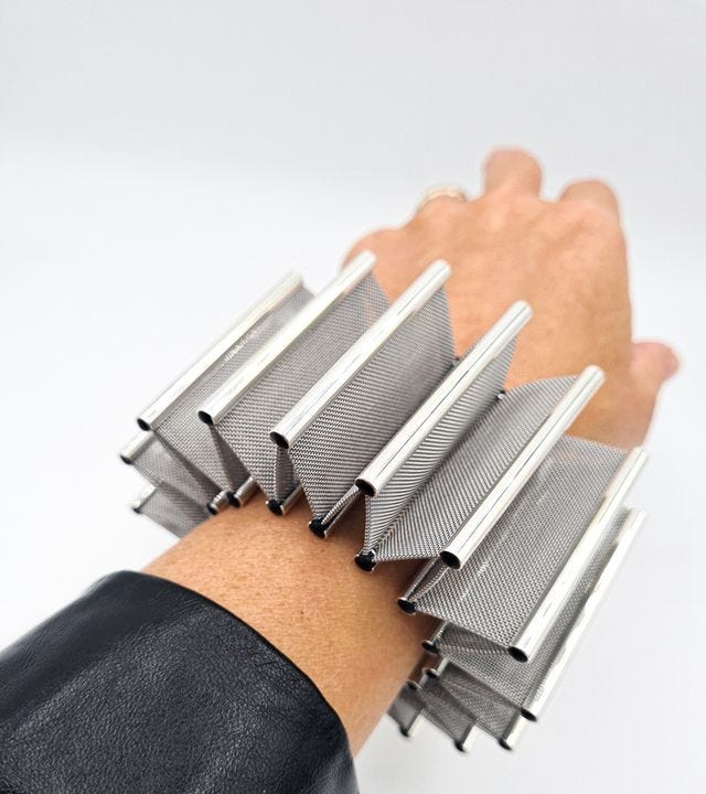 In Gaëlle Lauriot-Prévost’s new collection of jewelry, mesh is receiving a new interpretation, embodying her architectural thinking along with allowing mesh to become a refined and sophisticated material for jewelry. To produce this collection, she collaborated with GKD, the world’s renowned maker of metal mesh for façades and interiors, known for its bespoke wire mesh systems which are often utilized as buildings’ envelopes, solar and acoustic solutions, and a variety of architectural elements. To create this series of jewels, the company introduced new tools that enabled them to shift in scale and materials from buildings to jewelry, thereby bridging between architecture and jewelry, which comes to engage the body in a chic way. It is the type of jewelry that is not adding decoration as in traditional jewels, but rather a special character and expressiveness to a minimalist fashion.