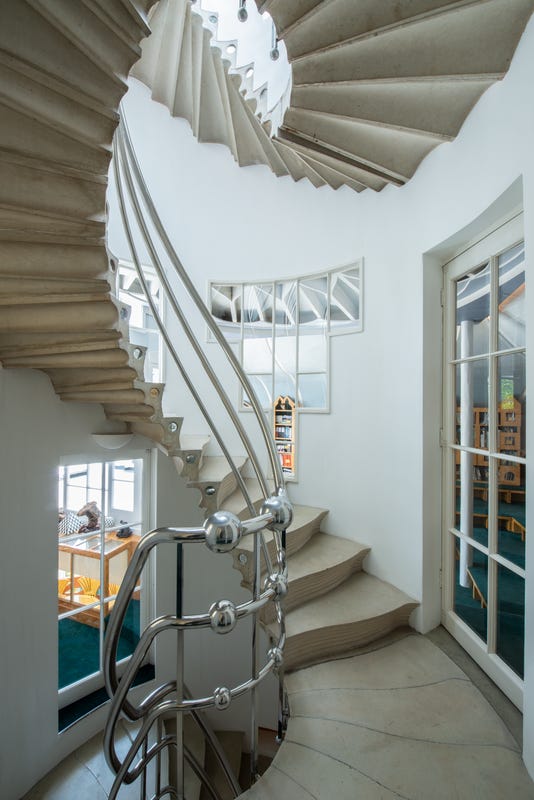 As you walk through the house, you are walking between the rational and the irrational, between fantasy and reality, and you feel as if you are inside of a theatrical set. You can clearly identify Jenck’s sources: Charles Rennie Mackintosh, ancient Greece and Rome, Regency. The spaces are characterized by multiple changes in levels, shifted axles, fragmented forms, and a wealth of symbolism. A circular concrete staircase features 52 steps (representing the weeks in a year), and the large steel balls of its rail represent the sun, earth, and moon. The library’s bookcases are designed to look like the iconic buildings of the past, like pyramidal for Ancient Egyptian, domed for Ancient Roman, and stepped gables for the Medieval era. In Jencks’ words, “a city within a house within the city.”