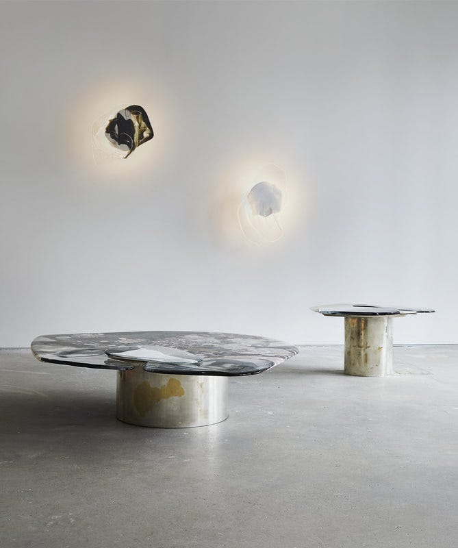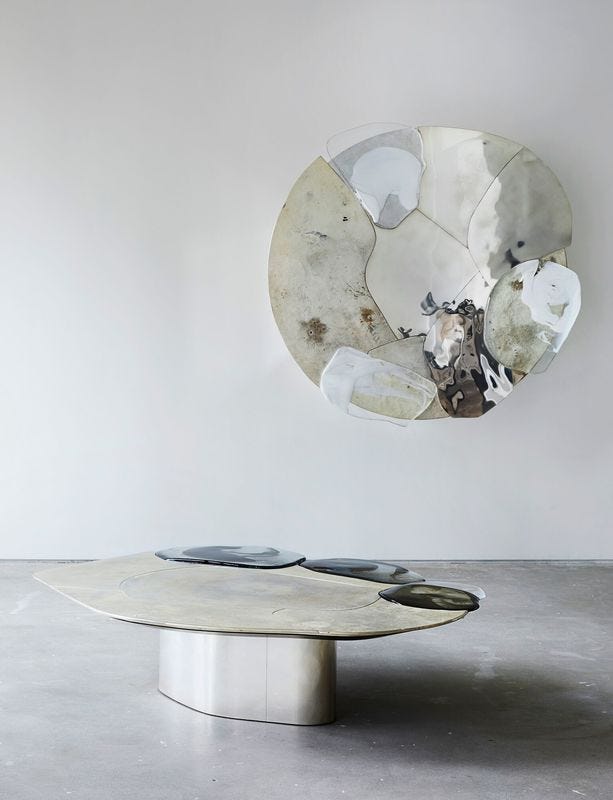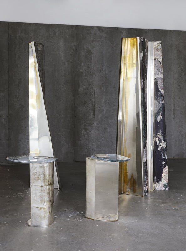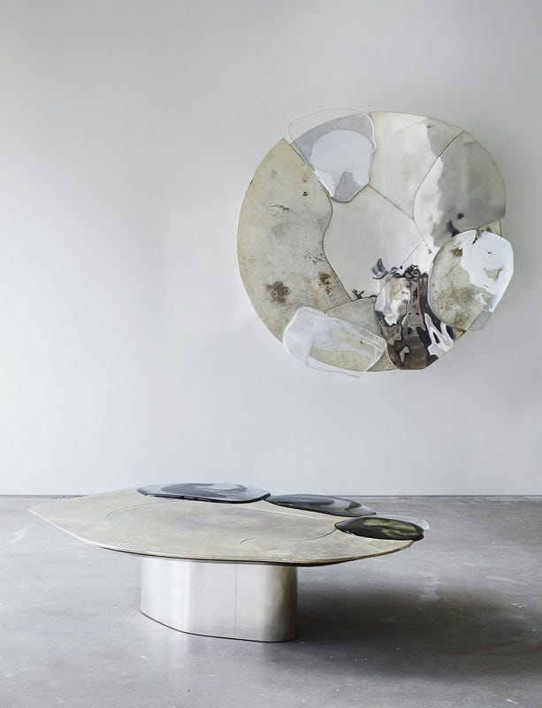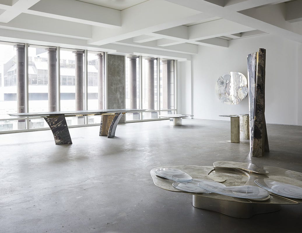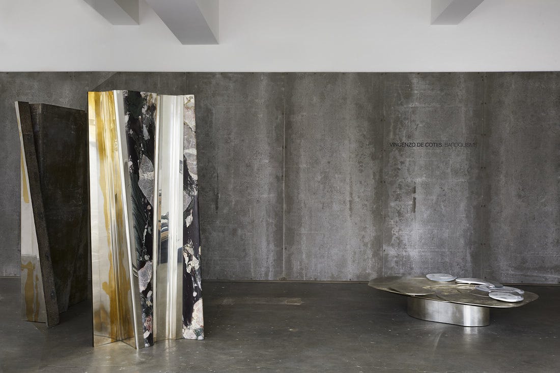 I was first introduced to his furniture design at Design Miami a couple of years ago. I was familiar with the the work of Italian architect Vincenzo De Cotiis in interiors, where he has not only turned raw buildings into contemporary hotels and restaurants, but has also formulated a signature for utilizing reclaimed materials. Both in his interiors and furniture, De Cotiis has made his name for merging the decay and the minimal, the crafted and the found, the aged and the sleek, deconstruction and construction, the architectural and the decorative. The furniture I saw in Miami was crafted of found fiberglass panels along with blown glass exquisitely made into unique objects of fabulous scale and forms. Now, that he has opened a new solo show, ‘Baroquisme’ at Carpenters Workshop, De Cotiis is showcasing the evolution of his art and language, which is more settled, more mature, and the craft is more sophisticated in the line of Carpenters Workshop Gallery. The pieces in the show are strong in their materiality, combining silvered brass, marble, fiberglass, cast glass all beautifully infused into rich and shimmering surfaces. The language is particularly successful in the tables where large surfaces allow better play and layering with the materials. The furniture pieces are baroque in their dramatic fantasy, in their ability to transform interiors, in their dazzling forms, and after all, De Cotiis’ work always carries a strong Italian identity. The exhibition at Carpenters Workshop Gallery will close on June 23rd. Images courtesy of Carpenters Workshop Gallery; photo Matt Harrington.