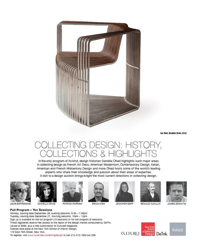 I am pleased to announce that registration to the fall 2016 edition of the program Collecting Design: History, Collections, Highlights is open now. The only program of its kind, it comes to educate architects, interior designers, decorators, and art collectors in one of the most fascinating territories—the international marketplace of modern and contemporary design. This season, I will be hosting some great friends and colleagues, sharing their expertise and the story behind the scenes. With Dr. Jennifer Goff, Curator of Furniture, Silver, Music, Science and the Eileen Gray collection at the National Museum of Ireland, foremost scholar on Eileen Gray, and author of Eileen Gray Her Work and Her World, I will converse on the history of collecting Gray’s furniture; Louis Bofferding, contributing editor to Architectural Digest and a dealer known for his academic approach to 20th-century design, will speak about legendary collector and couturier Jacques Doucet; Patrick Parrish, dealer, writer, curator, blogger, specializing in vintage and contemporary furniture will present his program of collectible contemporary design; Brian Kish, the most distinguish scholar/dealer on mid-century Italian furniture and lighting, will illuminate various chapters in this territory; Renaud Vuaillat, Director and founder of Twenty First Gallery will discuss his own program in representing, producing, and promoting French contemporary design; and James Zemaitis, curator and dealer will speak about his passion for American modernism of the interwar years.