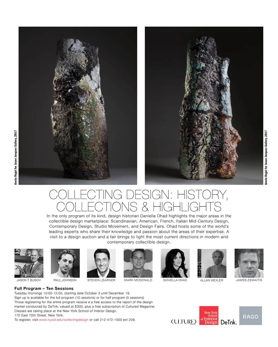 I am pleased to announce that registration to the fall edition of my program Collecting Design: History, Collections, Highlight (opens on October 3rd) at the New York School of Interior Design is open now. This season, I will host friends and colleagues who will share their expertise on various aspects of the collectible design market. Curator James Zemaitis will speak about Plywood and Modernism: Straight, Bent, and Laminated in celebrating the seminar show at the Victoria and Albert Museum ‘Plywood: Material of the Modern World,’ curated by Christopher Wilk; Steven Learner, founder of Collective Design Fair on the growing power of design fairs and the stories behind the scenes; artist Allan Wexler on the blurring boundaries between art and design; legendary dealer Mark McDonald, on his personal experience with legendary designers Ray Eames, Isamu Noguchi, Eduard Wormley, Sam Maloof, and Otto Natzler; Paul Johnson on contemporary design; Jason T. Busch on the moment of contemporary and vintage ceramics. In addition to classes taking place at NYSID, we will be visiting a design fair, a preview at an auction house, and a gallery, gaining hands-on experience in the fascinating world of collectible design.