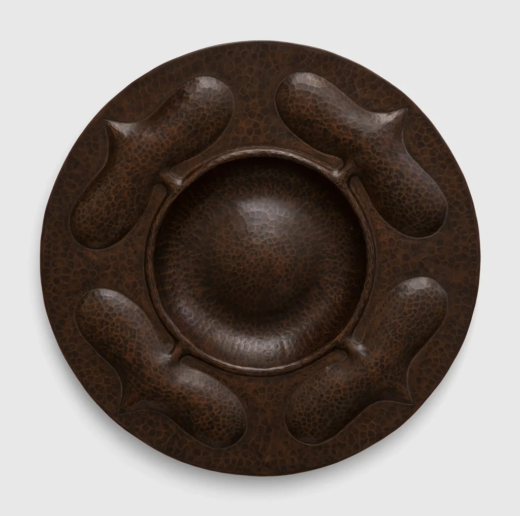 What makes Stickley’s furniture great? According to Kaplan, it is his ability to fully capture the ideal of the movement: simplicity of form, honesty in construction, and quality of craftsmanship, especially in his structures using mortise and tenon joints, quarter-sawn oak, and other natural materials like leather and rush. But ultimately, Stickley’s greatness lies in his gift for scale and proportion. These characteristics are captured in a copper wall plaque that Kaplan showed us, which was produced in 1905, when Stickley first launched his metal workshop. It’s one of Kaplan’s favorites from his collection and was highlighted in the 1988 publication Treasures of the American Arts and Crafts Movement, authored by Beth Cathers and Tod M. Volpe.