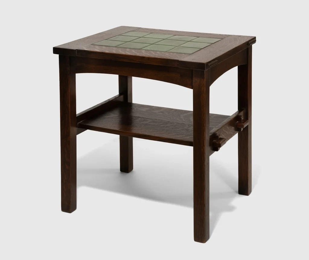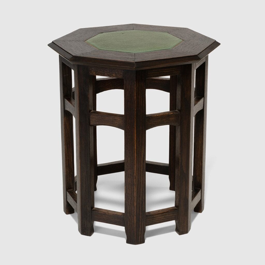 Born in Wisconsin, Stickley launched his career manufacturing furniture in the popular Victorian styles of the day, first through a company founded with his brothers in Michigan and later through his company Stickley & Simonds in New York. His vision changed in 1900, during a visit to England, where he discovered and fell in love with the progressive ideology of the Arts and Crafts Movement. He returned home determined to inject his own production with handcraft processes and the aesthetic principles of simplicity and honesty. That same year, Stickley unveiled his “New Furniture” at the annual trade show in Grand Rapids, marking the beginning of a new experimental direction. One exceptional example that Kaplan shared was the Damasus Plant Stand from 1901, which features features a green ceramic tile crafted by Boston-based pottery company Grueby.