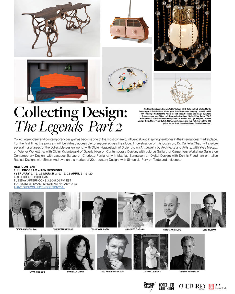 Since initiating the flagship program ‘Collecting Design,’ 10 years ago, it has always been an exciting moment when introducing the guests of the season. This moment has just come today and I am thrilled to announce the content of the Spring 2021 season of ‘Collecting Design: The Legends (Part II)’ with the Center for Architecture/AIA. It will be the second and last edition that will be offered virtually, where I will be hosting some of the world’s leading pioneers and proponents of the design world: curators, collectors, tastemakers, dealers.