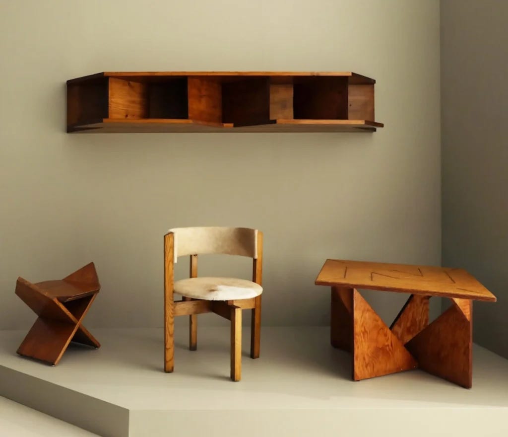 Another case study in Magen’s precocious eye for untapped value: his early investment in the work of Hervé Baley (1933-2010), a French architect and architecture professor active in France in the 1960s and 70s and later in Morocco in the 1990s. Influenced by Frank Lloyd Wright’s principles of harmony between habitation and the natural world, Baley built residences that nestled organically into the landscapes that surrounded them and filled the interiors with his own essentialist furniture designs, typically constructed in plywood and reminiscent of Wright’s Usonian collection. Unlike Chapo, Baley’s furniture was always site-specific and never serially produced. When Magen first encountered Baley’s work, he told us, he couldn’t identify the designer but he recognized the greatness right away.