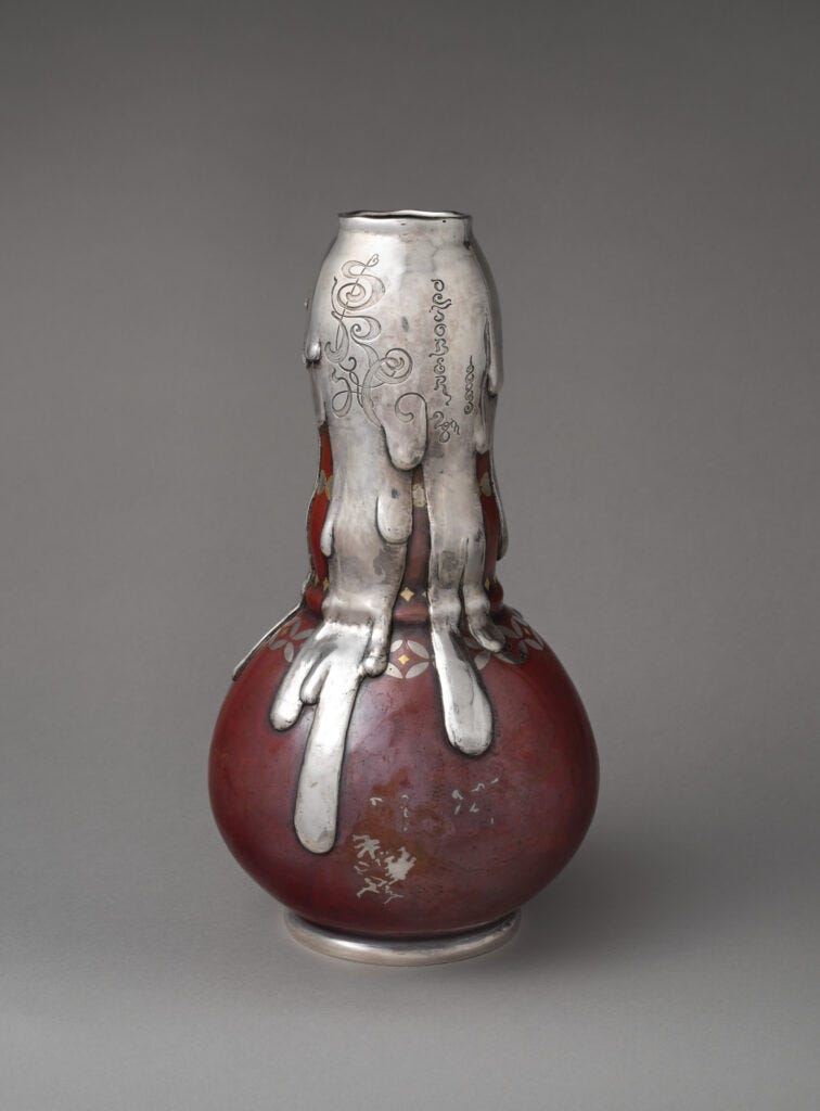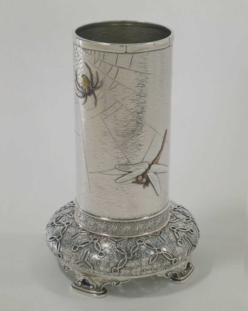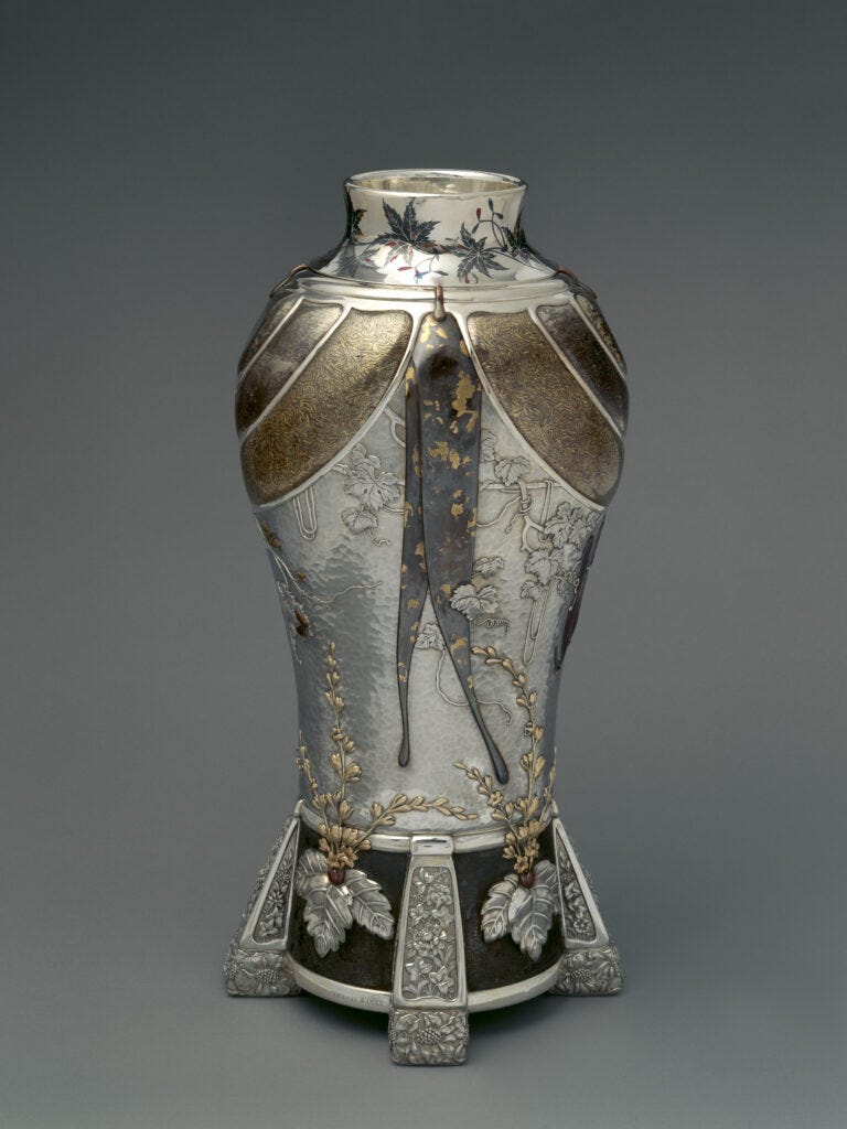 I particularly loved seeing the 19th-century Japanese metalwork, which served as the inspiration for Tiffany’s most famed silver of the Aesthetic Movement period, as well as having the privilege of seeing the legendary Magnolia Vase, which was completed after Moore’s death. Near the end of his life, he was deeply involved in planning for the 1893 Chicago World’s Fair. One of his last designs was an enormous centerpiece embellished with enameled magnolia blossoms, inspired by Pueblo pottery. while the the ornament refers to various regions of the United States, with the magnolias representing the South and West, a truely accomplished objects filled with national narratives.