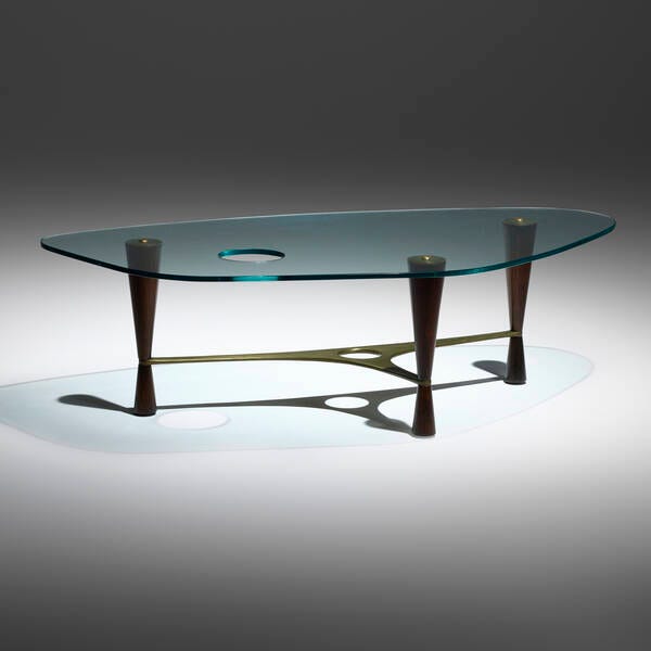 Weinberg’s selection of Paul Mayén (1916-2000) was surprising. The Spanish architect and industrial designer, with a bachelor’s in Fine Arts from the Cooper Union in New York City, and a master’s in architecture from Columbia University, became known for designing the visitors center at Frank Lloyd Wright’s Fallingwater. He also designed furniture and lighting. In the 1950s, Mayén met fellow art student Edgar Kaufmann Jr., with whom he would have a personal relationship and work partnership that would last until Kaufmann’s death in 1989. His unadorned lamps and tables were made with modernist industrial materials—aluminum, glass, chromed brass, and Plexiglas— and were produced by his company, Habitat. The forms are structural, minimalist, functional, with geomantic precision, clean lines, and structural honesty. His pieces, often offered by Wright Auction, typically sell for a fraction of their production cost.