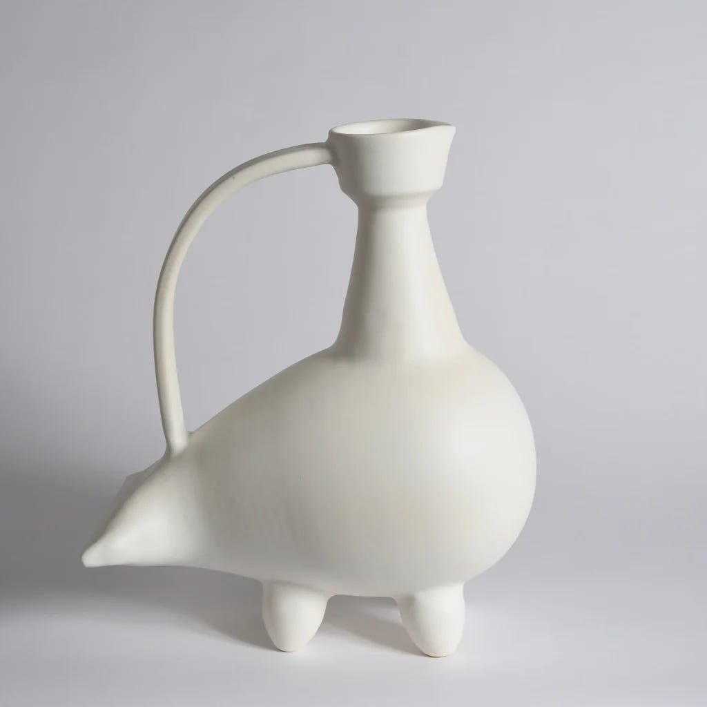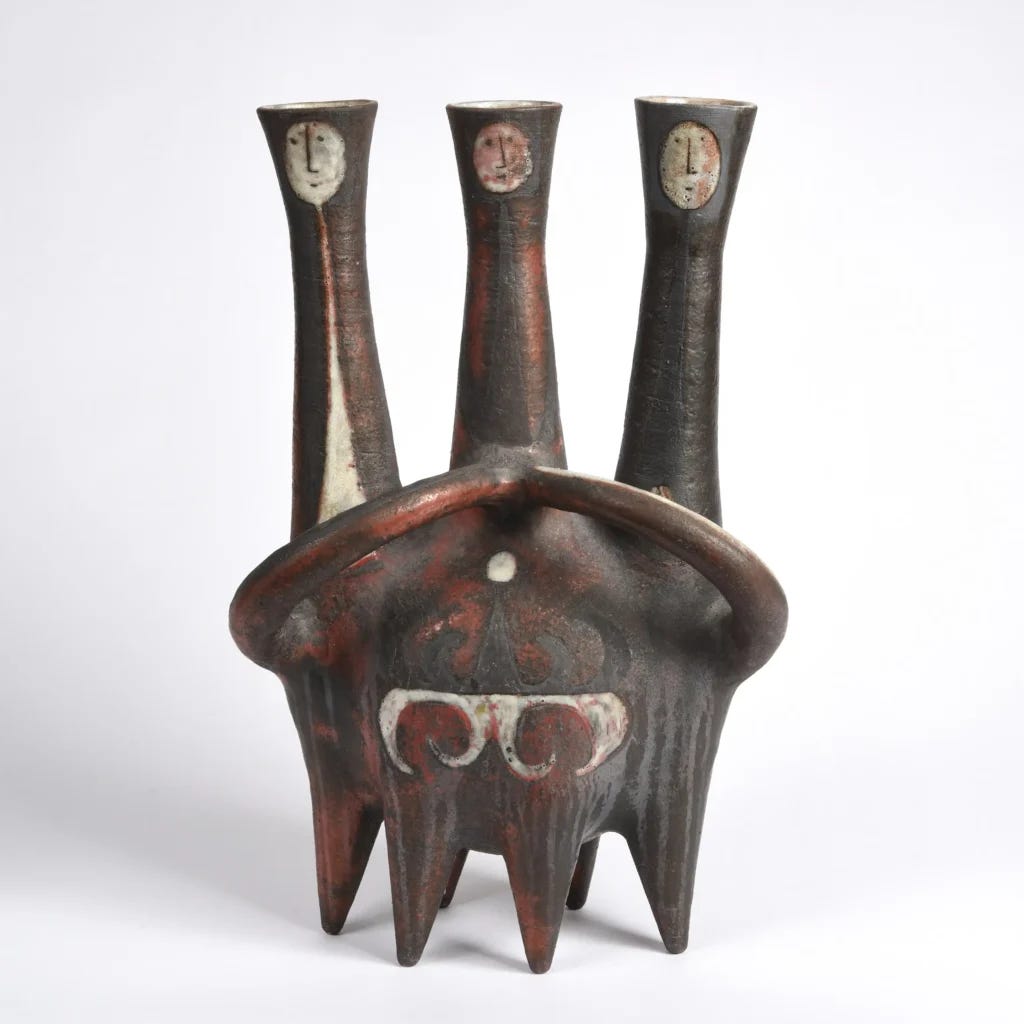 Mehanna and Lebreton discussed two additional ceramic artists active in Vallauris in the postwar era: François Raty (1928-1982) and Jean Derval (1925-2010). Raty specialized in stylized, abstract animal sculptures that were labor-intensive, often taking months to complete. His signature was adding painted details to the surfaces after firing. Derval trained in graphic design at the Ecole des Arts Appliqués and worked for Christofle before discovering his affinity for clay. In 1947, he joined his two friends, Robert Picault and Roger Capron, in Vallauris, where the three established a shared workshop. Soon after though, he left to work at Madoura, and then went on to found his own studio called Le Portail. He became known for both abstract and figurative clay sculptures, favoring one-off rather than serial productions. Picasso called him the “technician” because he had a talent for crafting impressive volumes. To ensure his forms were fully resolved, Derval would sketch for weeks before putting his hands to clay.