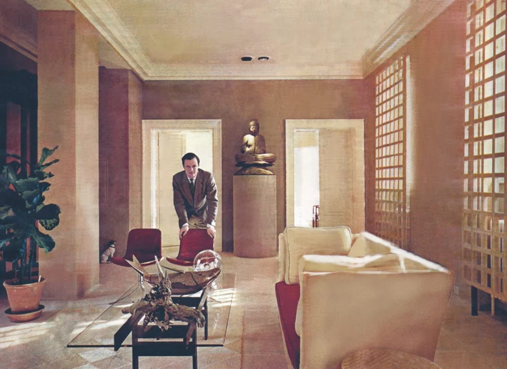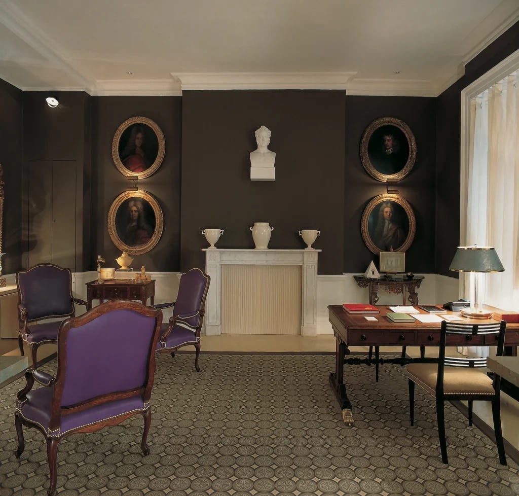 In London, Hicks famously lived in Albany, an 18th-century mansion in Piccadilly that was converted into a super prestigious apartment complex in the 19th century—the setting of many novels and films as well as the real-life home to such luminaries as Lord Byron and Sir Norman Foster. Hicks was introduced to Albany when was invited to a dinner by a tenant, photographer Antony Armstrong-Jones. David’s home in Albany was situated behind the main house of the complex, in one of the units originally intended for bachelors. David decorated the interiors of his Albany home twice. In the 1960s, he emphasized vibrant colors. In the 1990s, he opted for more neutral tones, in line with the tastes of the time.