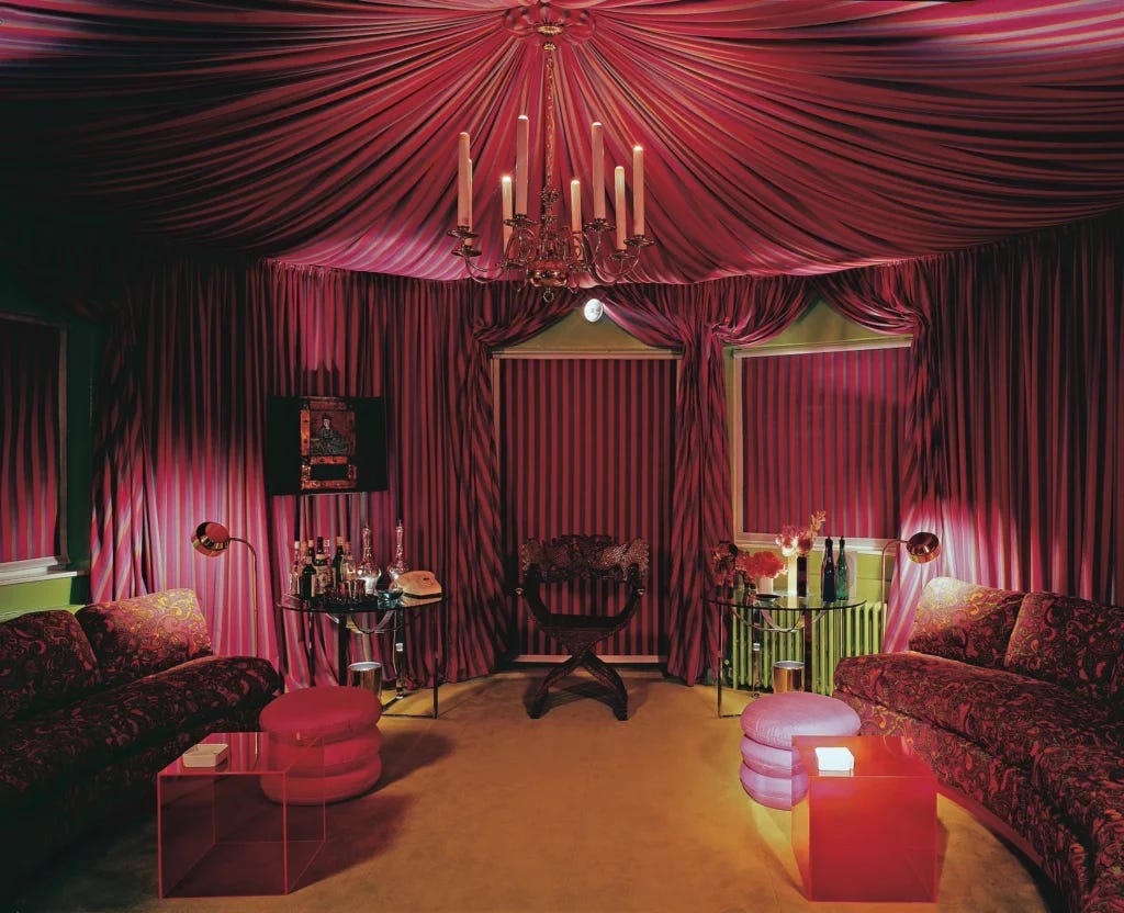 Packed with archival materials, personal photographs, journal and scrapbook entries, and behind-the-scenes stories, Ashley’s newly reissued publication is not only an encyclopedic reference for understanding David’s life and work, it’s also an exemplar of what a design history book should be. The book’s cover art is a photograph taken by Derry Moore that presents David looking majestic, elegant, and gratified, seated on an antique gilt swan chair in an all-red room in his London home. Ashley revealed that serendipity rescued from obscurity most of the photos reproduced in the volume. Towards the end of David’s life, Spragg, a long time collaborator, called him to say he could no longer keep the transparencies of the photographs he had shot over this years—the primary documentation of David’s portfolio. David told him to throw it all away. Thankfully, Spragg thought to call Ashley before carrying out the flippant request.