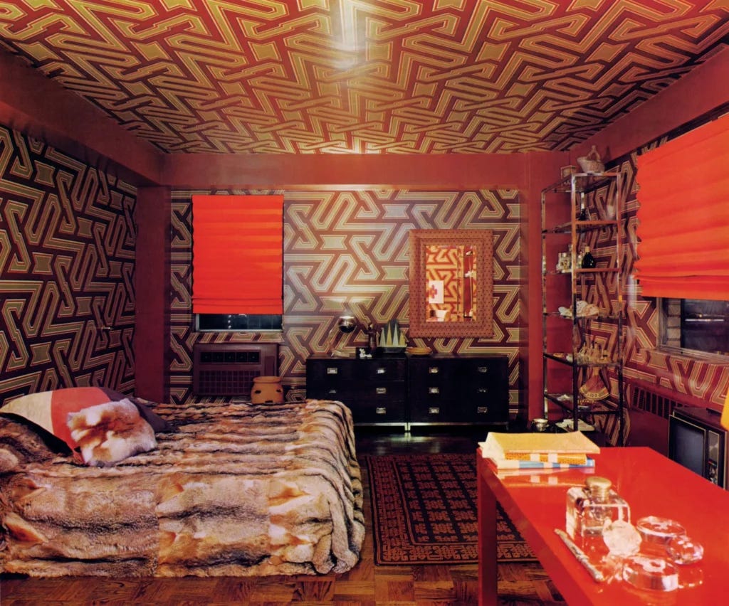 David’s signature design language fully emerged in the 1960s and ’70s, at the height of his career, when his unique sensibility most strongly resonated with the wider zeitgeist. This is when his hallmark electrifying color palettes, bold patterns, and unconventional combinations of old and new rose to the forefront. This is also when David Hicks became a lifestyle brand, complete with a line of textile and furniture designs available to the public through his eponymous shops around the world. With a keen understanding of both his audience and the power of publicity, David promoted his lifestyle and professional persona as one in the same. Beyond Helena Rubinstein, his elite client roster included Vidal Sassoon, Condé Nast, Douglas Fairbanks, Jr., the King of Saudi Arabia, and the Prince of Wales, to name a few.