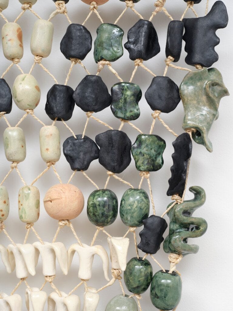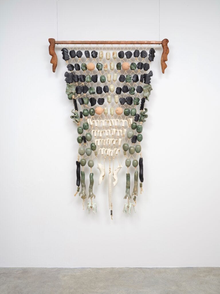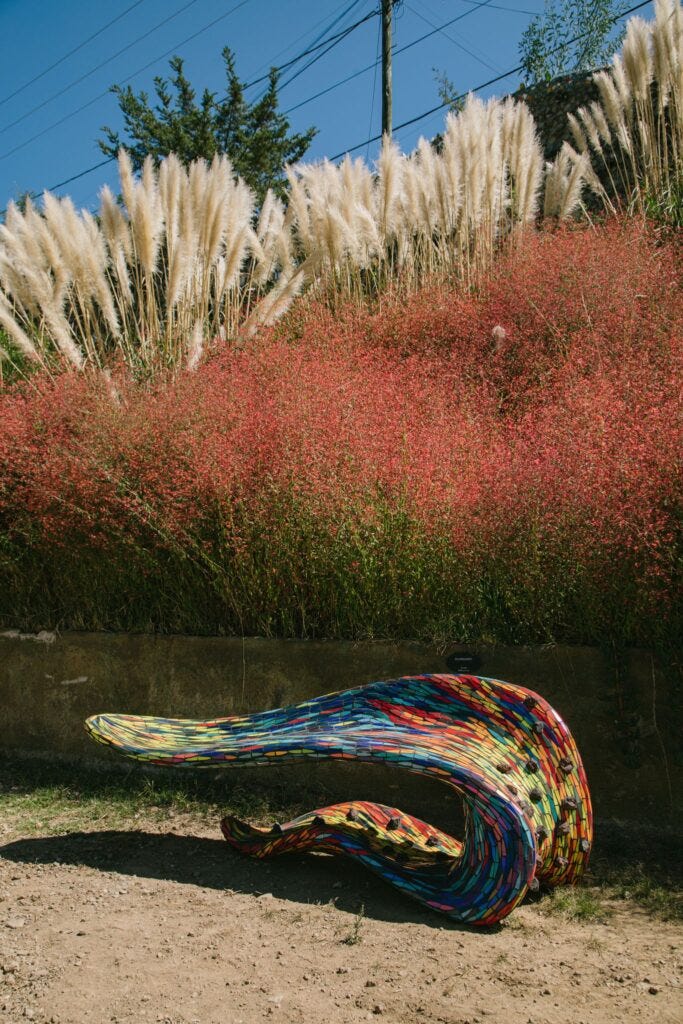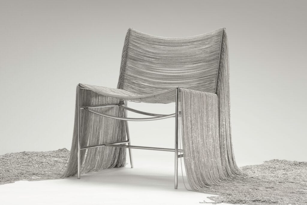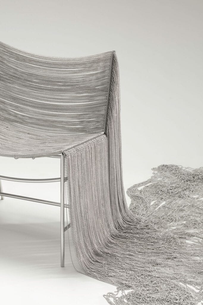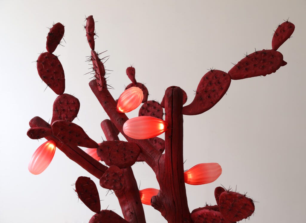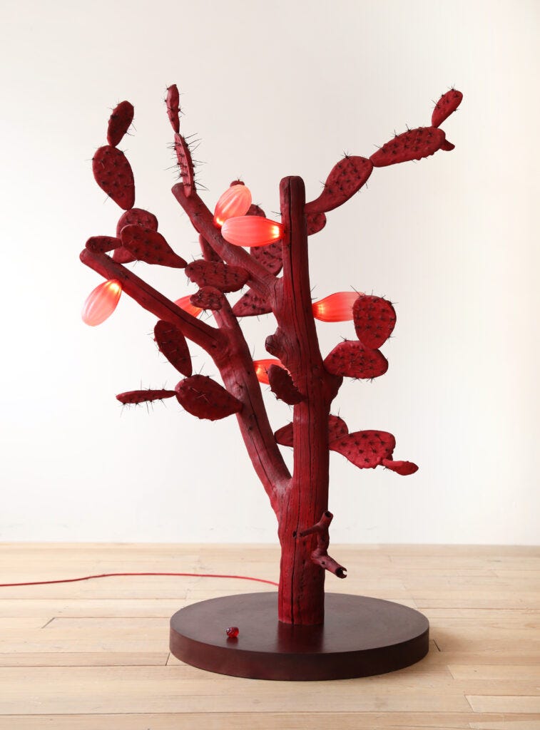 Each piece included in the show is imbued with powerful narratives and demonstrates a refined craftsmanship, beautifully made with rich and interesting materials from this part of the world. When you walk into the gallery, you feel like you are entering an exotic territory and are drawn into the space as you seek to connect with the objects. According to Ballesteros, “Every viewer will find their own self in the rich narrative.” A few pieces I particularly loved include the hanging piece by Lorena Ancona (b. 1981) entitled Water Dance, where she wove handcrafted ceramic beads on a net; as well as the Creek Chair by architect Frida Escobedo (b. 1979), crafted out of metal chain to evoke a creek flowing in lush nature; and Fernando Laposse’s Cactus Lamp, which is a deep red cactus tree crafted from cactus tree and thorns, matched with stained beech wood and 3D printed resin lights—all painted in deep, illuminated red.