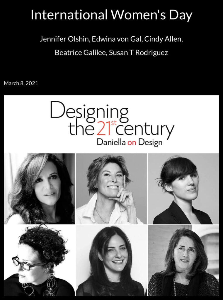 These amazing women are champions of design, whose work I admire, and who will open my new podcast Designing the 21s Century on International Women’s Day, Monday, March 8th. Join me to celebrate the spectacular achievements of women, and let’s not forget that that legal restrictions have kept 2.7 billion women from accessing the same choice of jobs as men. Less than 25 per cent of politicians and decisions makers are, and one in three women experience gender-based violence, still. Now, you can listen to Designing the 21st Century.