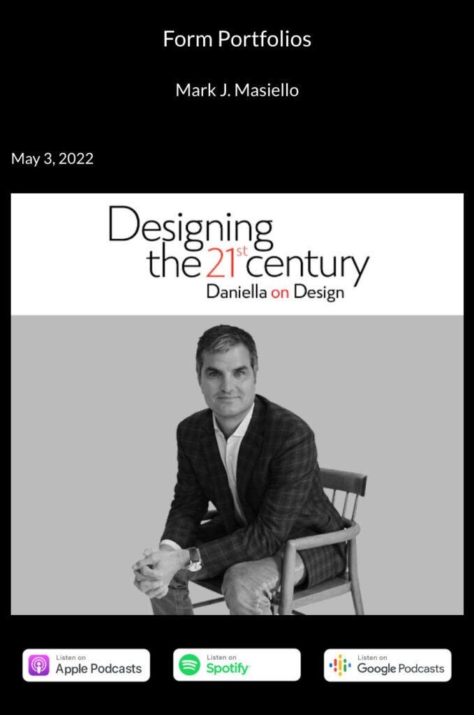 Mark Masiello knows the answer. He has turned his expertise in the music world to design. Whereas in the music sector, publishers typically manage copyrights and royalty, and by that helping musicians to protect their work, designers have been left generally unprotected. Mark founded a company called Form Portfolios. Its mission is to preserve, guard, and advance furniture through licensed reeditions. His passion for design has brought him to revisit legacies of the past, and to breathe new life into their work. To provide advisory that gives designers what musicians have. I spoke to him in the podcast Desgining the 21st Century.