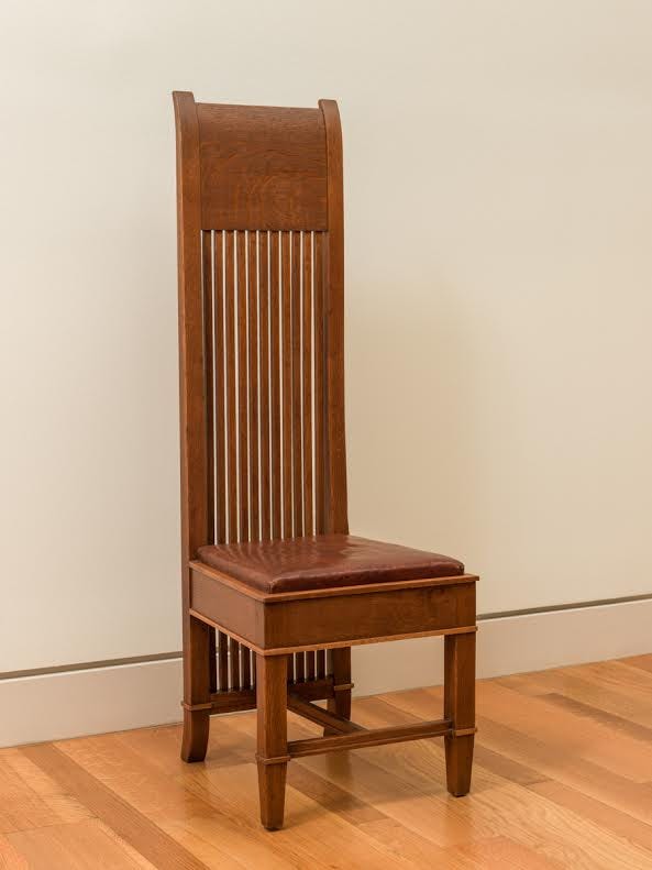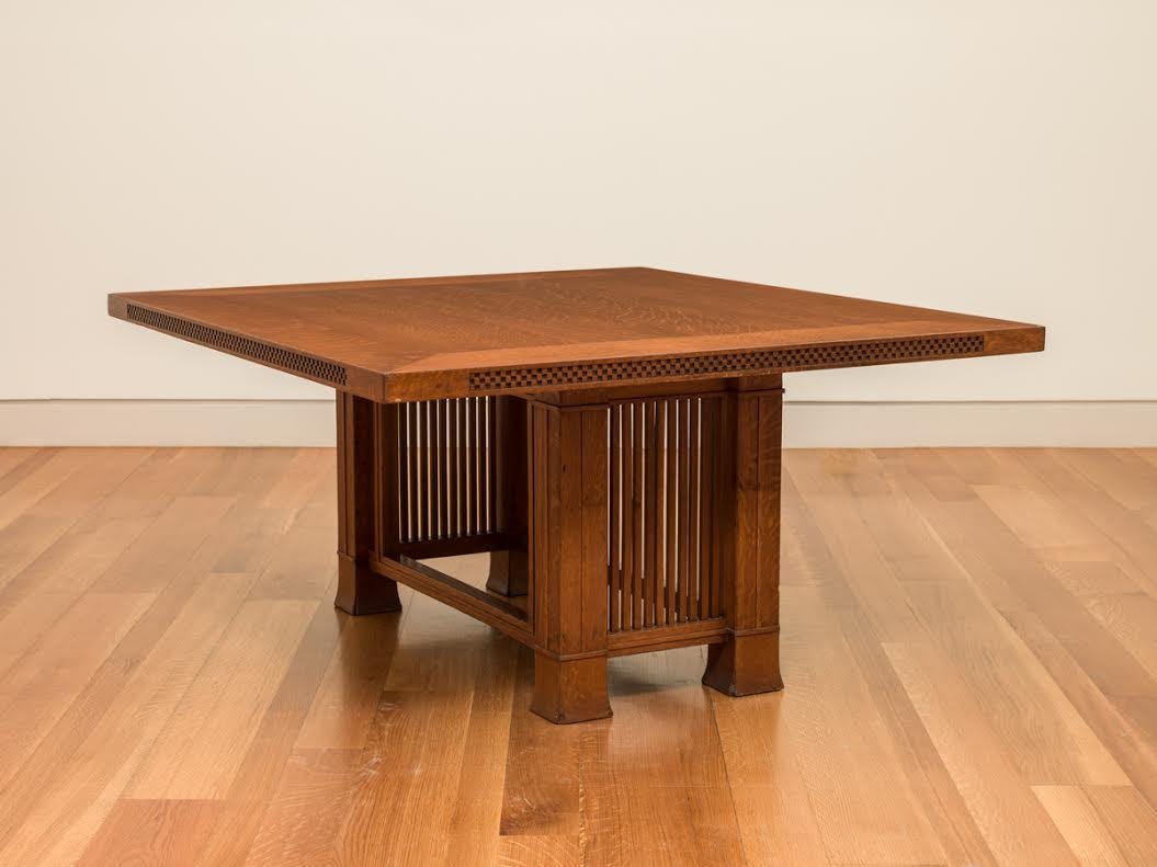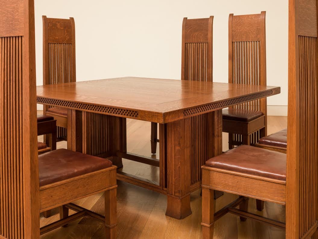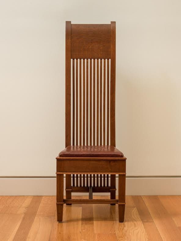 While the house Frank Lloyd Wright designed for Joseph Husser on a lot overlooking Lake Michigan in Chicago had marked a significant moment in his career for its radical and open floor plan, based on spectacular polygonal volumes, it was demolished by 1924. Completed in 1899, the so-called Husser House was the last project where Wright used Louis Sullivan’s ornamentation before converting into pure geometrical decorative elements. Typically to his early projects, most of the furniture pieces Wright designed for the house were not removable; the dining room table and eight chairs made in golden oak, were among the items survived the demolition. They were purchased in 1923 at a used furniture shop on the west side of Chicago, have remained with that family until 1987, when sold by Christie’s department of Decorative Arts in 1987 to the famed collection of Thomas Monaghan of Domino’s Pizza, fetching a record price; the suite returned to Christie’s six years later and this time was sold to art dealer Daniel Wolf. It was recently purchased from the Wolf Foundation by the Huntington Library in Pasadena, CA, and is now on a permanent view, testimony to the radical way in which Wright perceived the house, with a large communal space centered around a fireplace, with living, study, and dining areas, for which he designed his iconic tall, high-backed chairs, which were meant to provide a sense of enclosure and intimacy in the open space.