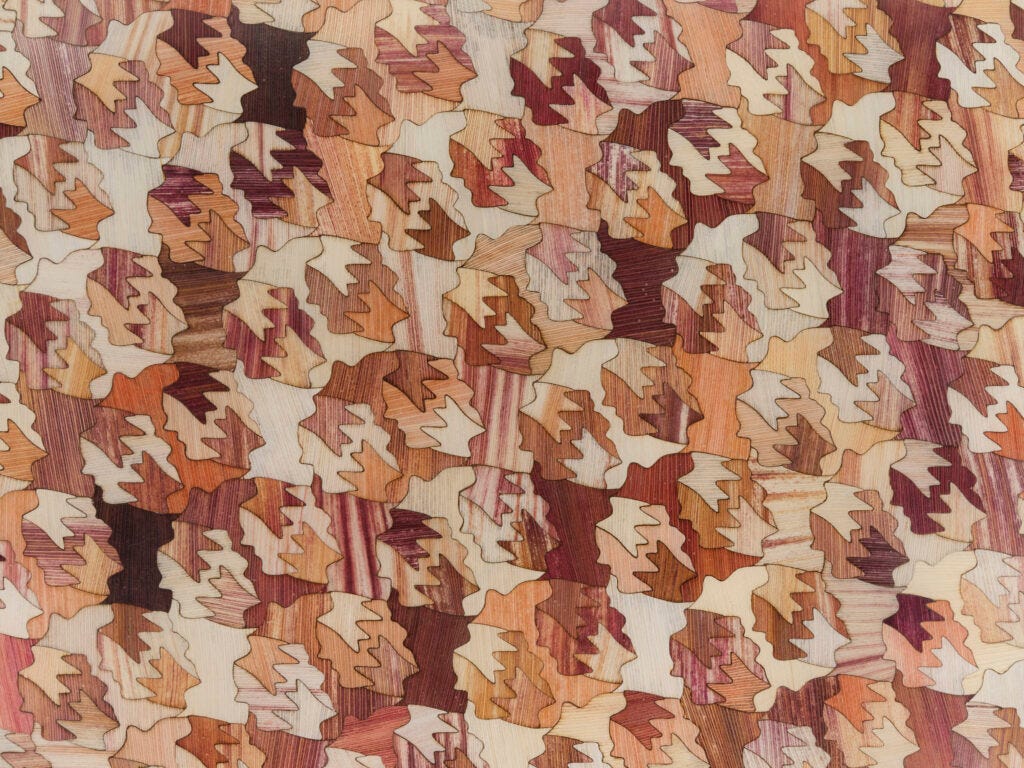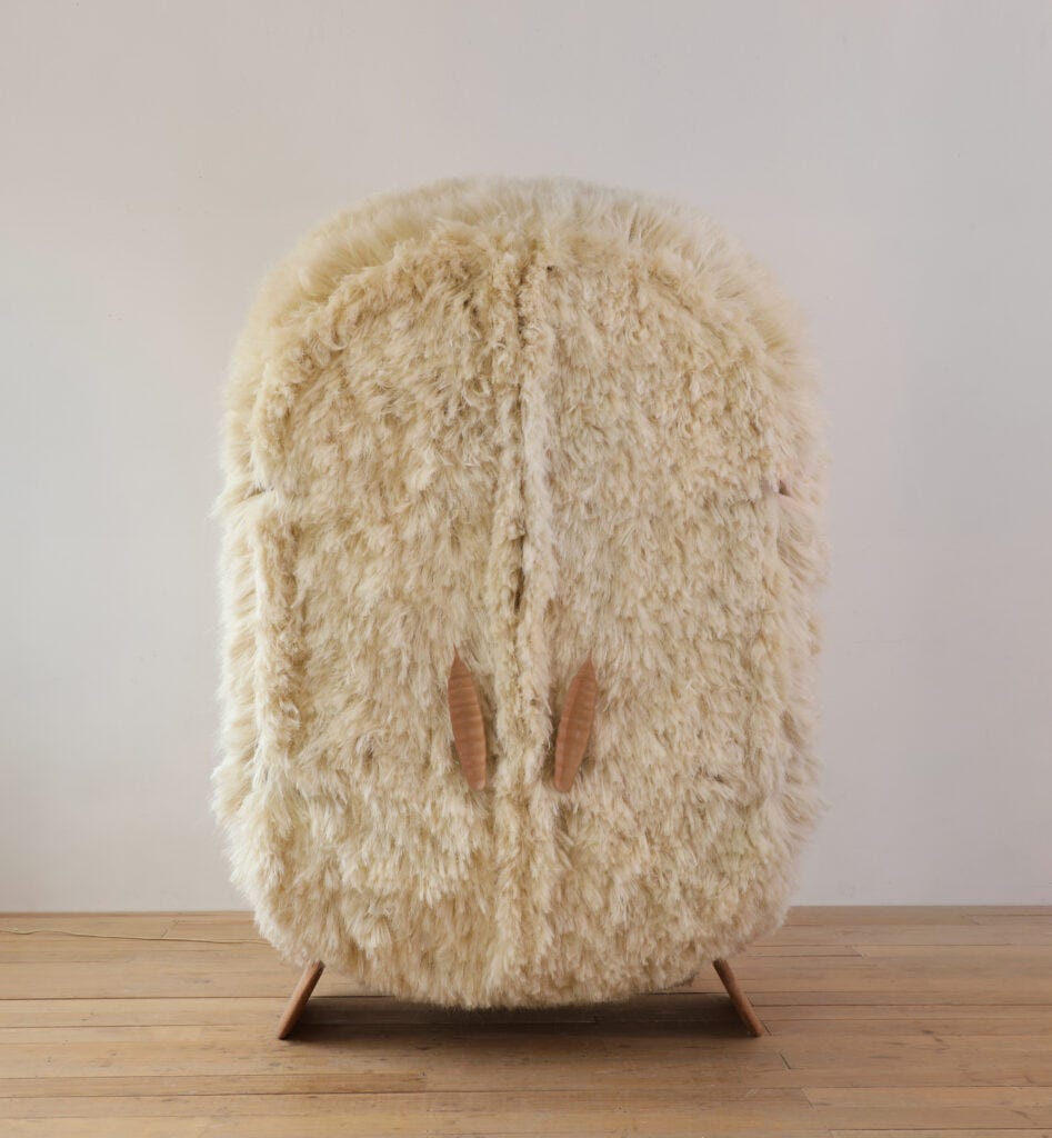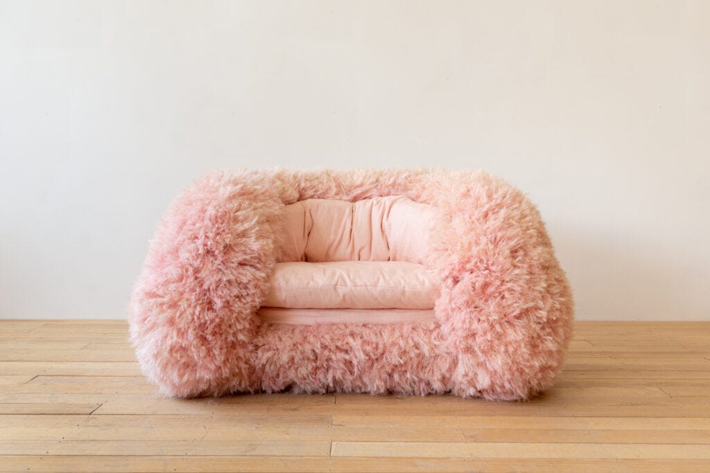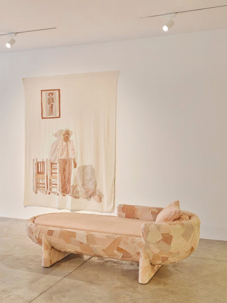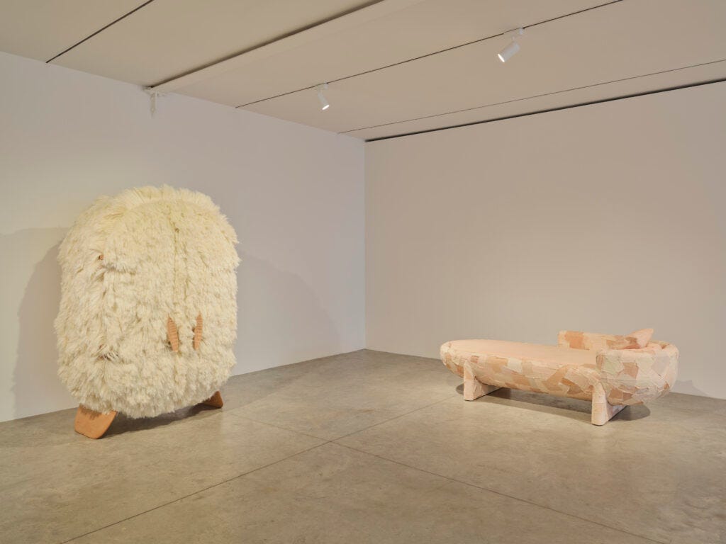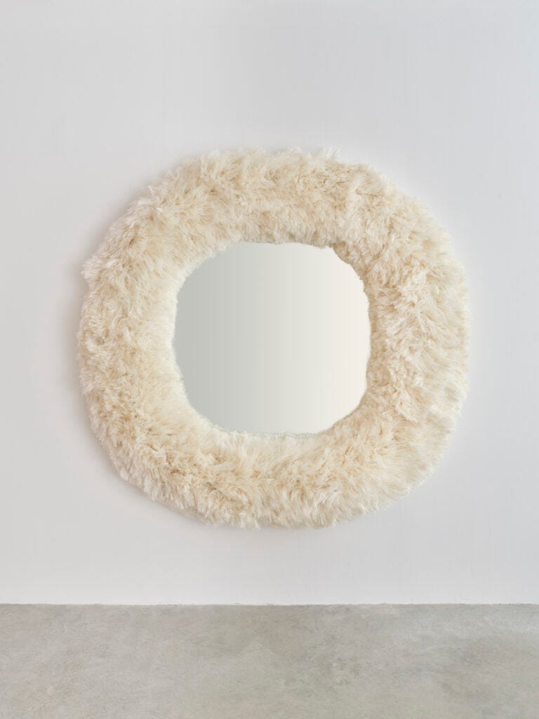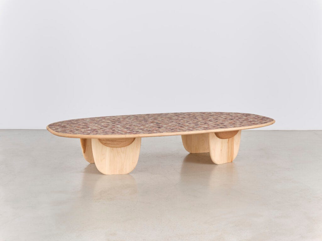 Laposse excels in demonstrating the values that reflect the world of 2020s design like craftsmanship, a strong activist narrative, community employment, recovering traditions, and objects that reflect cultural and national identities. The veneer material that he creates and is included in the current MoMA show Life Cycles: The Materials of Contemporary Design (see below) is an innovative and intriguing way to achieve new vegan fibers. The objects—a wall mirror, armchairs, a chaise, tables, cabinets—are functional and attractive; however, I am looking forward to seeing the next phase in this designer’s career and the way he takes his materials as a point of departure for new forms. After all, Form follows Concepts.