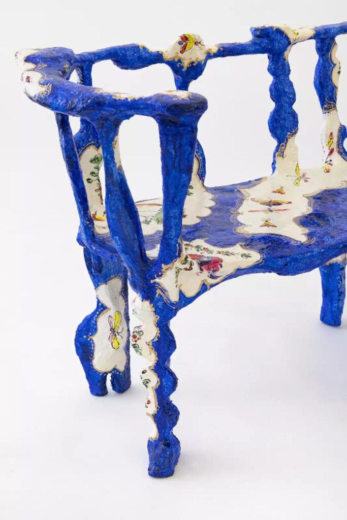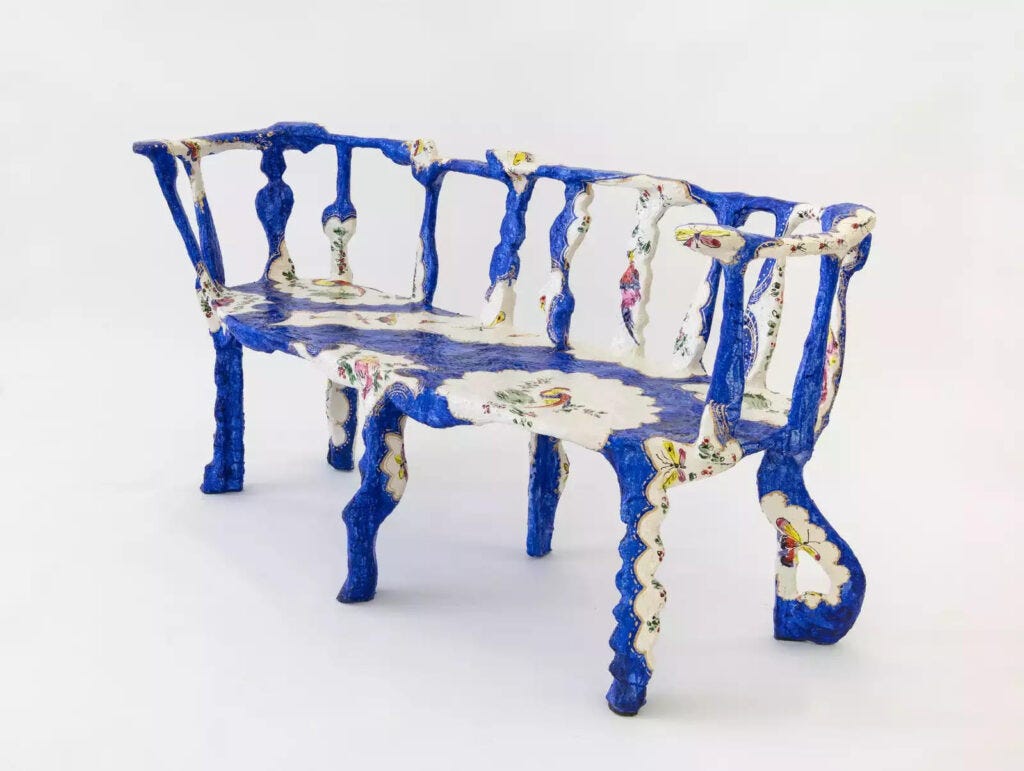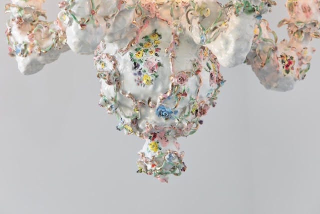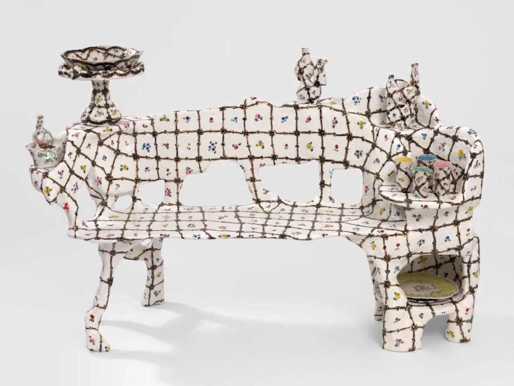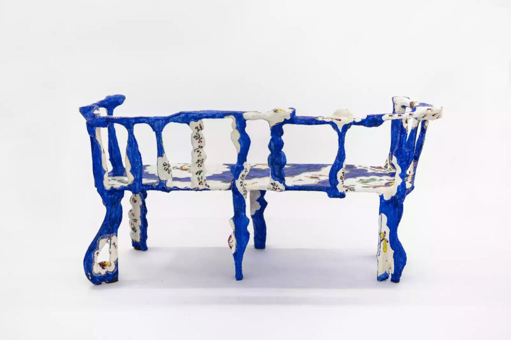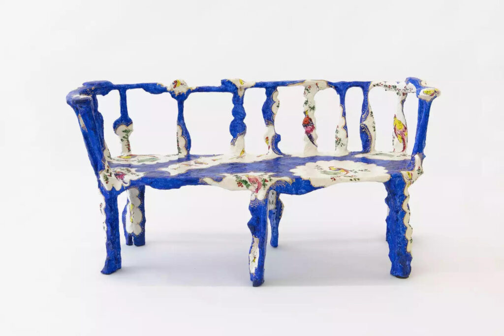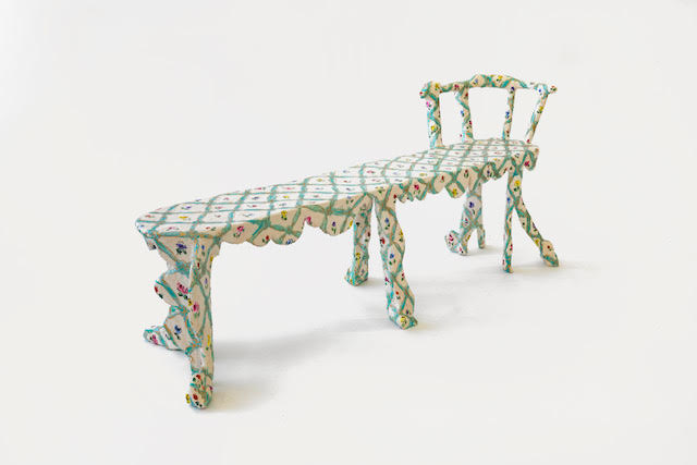 DiMattio was originally drawn to porcelain for its connection to feminine aesthetic and sensibilities, which is attached to its imagery and adornment. Those narratives bring a fresh look to the Rococo style. DiMattio loves porcelain for its instability, as she seeks to craft objects that question any fixed idea of values, beauty, and femininity. At the core of her vision is the notion of contradictions in scale. What was made in small porcelain cups, she turns into sofas and armchairs, and pattern created for porcelain vessels are blown into benches and tables. DiMattio loves playing with distorting the observer’s perception of size, and, like Alice, has created her own wonderland. It is her method of making design dramatic and powerful and to give the decorative a new identity. It is no longer the ornament attached to surfaces as was traditionaly practiced throughout the 18th and 19th centuries, no longer superficial layers that cover buildings, objects, and forms. In her world, the ornament is becoming the form itself and the core of her design. She is on an ongoing quest to push boundaries and bring the decorative to the forefront while giving it a new identity. “Why is a floral pattern sweet and lovely?” she asks. “Shouldn’t it be strong and powerful?”
