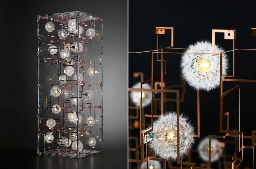 Fragile Future, DRIFT’s most recognizable design, began as the duo’s Design Academy Eindhoven graduation project and continues to encapsulate their shared mission. Composed of dried dandelion seeds adhered by hand to LED bulbs, these modular light sculptures are produced through a labor-intensive process and serve as a metaphor for the fragile future of our planet. Like much of the studio’s work, Fragile Future envisions a way forward by championing a symbiosis—a co-evolution—between nature and technology.