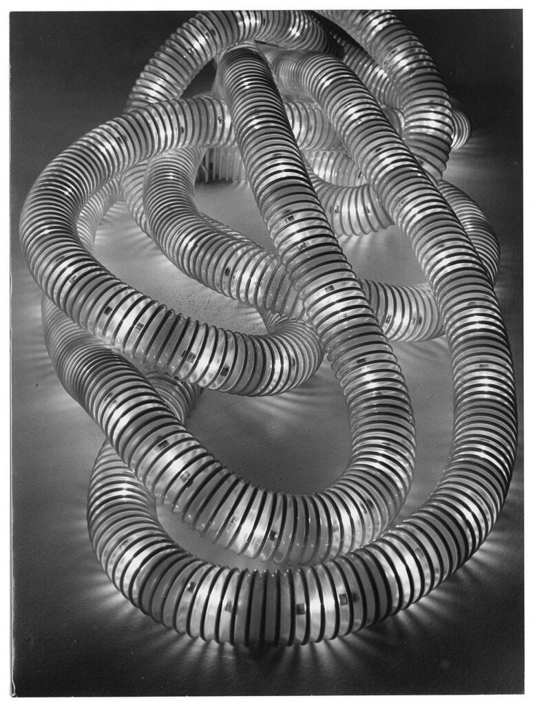 Frattini’s dedication to the process, his ability to work closely with cabinetmakers, upholsterers, artisans, and craftspeople, his love for woodworking, and the workshop space were at the core of his professional identity. He forged partnerships with master craftsmen and, like many other Italian designers of his generation, never lost his ties to Italy’s artisanal heritage in the global postwar design movements, whereas in America and France, the tendency was to focus as much as possible on industry and to look at craftsmanship as a thing of the past. Frattini loved saying that he was born in a workshop. His designs demonstrate how innovation had become the trademark of the classic Italian design of the postwar era. The Boalum lamp, which he created in 1970 in collaboration with Livio Castiglioni, looks like an extended, flexible, luminous tube knotted like a cord. Its shape and concept are completely detached from traditional lighting design.