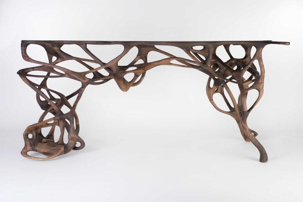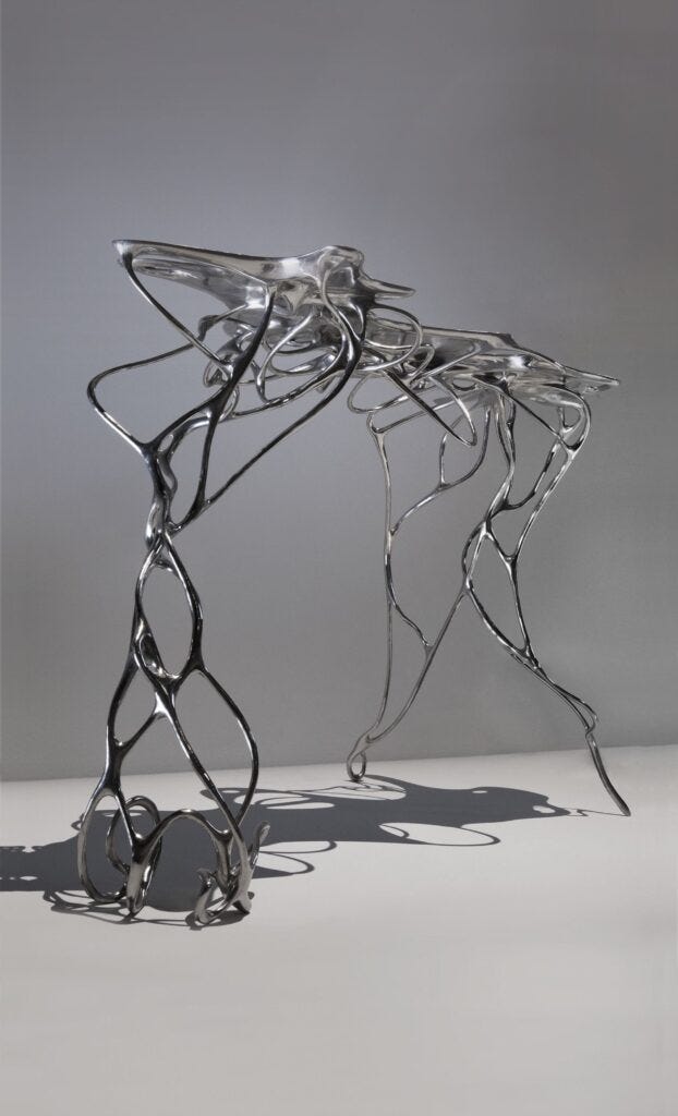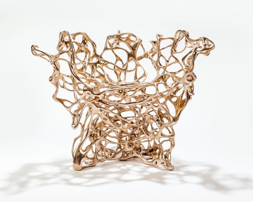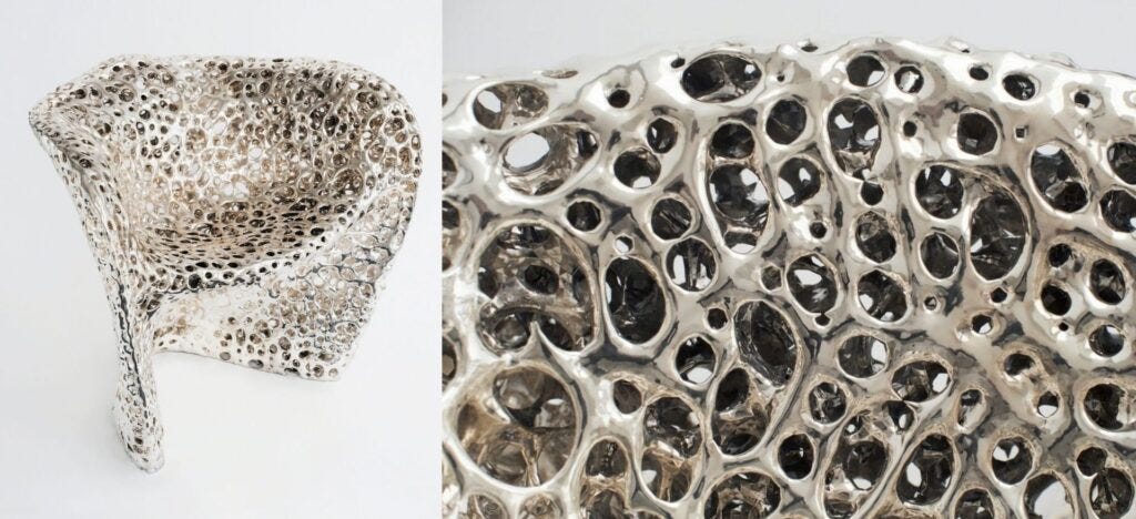 Bengtsson’s Growth series was commissioned by the Centre Pompidou for its permanent collection and was exhibited in the landmark Printing the World exhibition of 2017. The series began in 2012, the result of software developed by Bengtsson’s team to simulate organic growth in nature, wherein algorithms respond to external conditions such as temperature to interpret the natural evolution of one-of-a-kind forms using digital seeds defined by the designer as the starting point. The series now includes sui generis chairs, chaises, tables, and jewelry produced in a variety of materials.