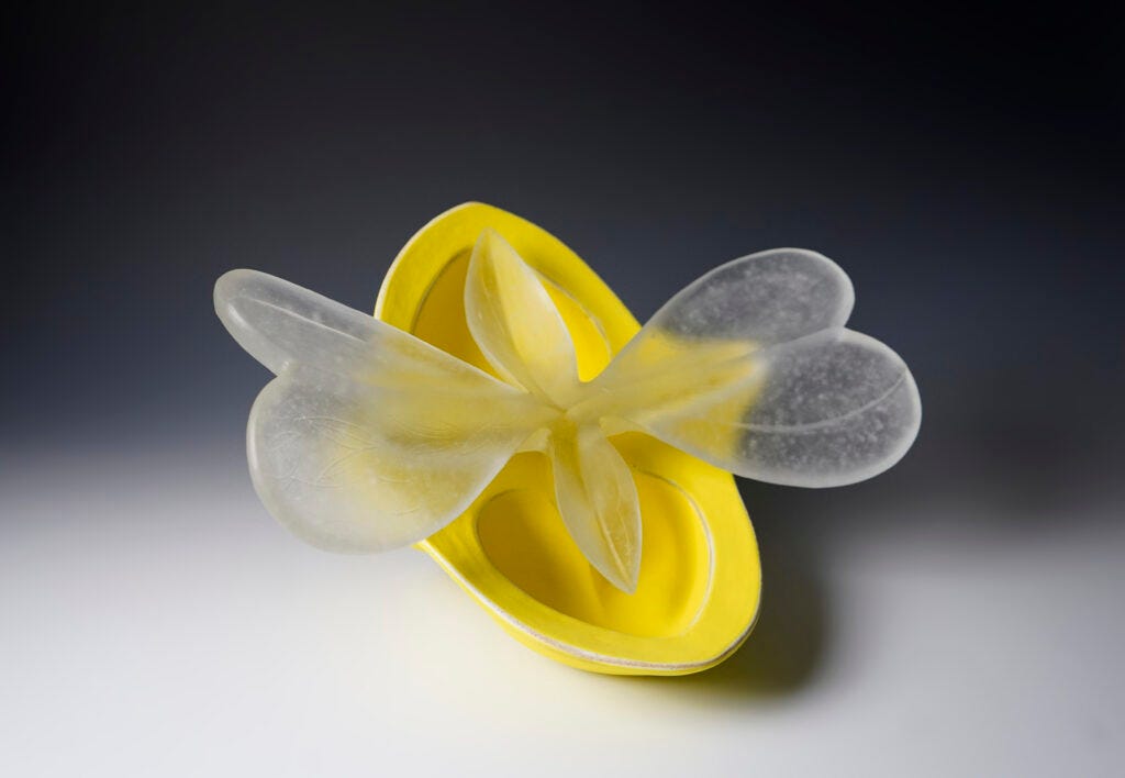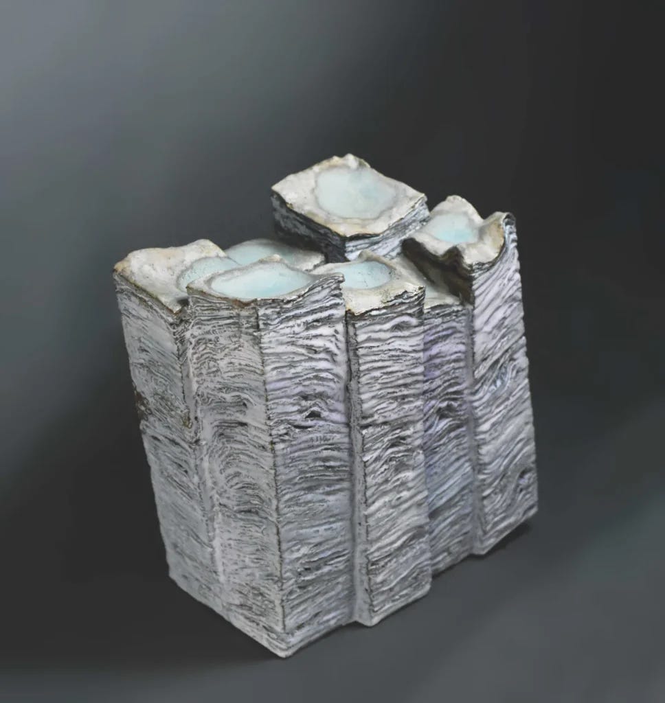 In the show we meet Hiruma Kazuyo (b. 1947), whose training as a graphic designer is clearly demonstrated in her technique. She layers thin sheets of clay horizontally or vertically for months before glazing and firing the sculptures. Matsuda Yuriko (b. 1943) works in the tradition of American Pop Art, creating whimsical works and representing local culture and daily themes in colorful richness. She uses porcelain and enamel glaze. I loved the way she presents Mount Fuji as a vibrant, childish representation of nature. Ayumi Shigematsu (b. 1958) is part of the vanguard generation of highly influential post-war female artists in Japan whose practices are inspired by concepts of female sexuality. Her sculptural forms are influenced by 1970s glamor aesthetics, and her complex forms are created by hand. I found the work of Shingu Sayaka (b. 1979) stunning, and conceptually unique. In her flower series, she recreated cut flowers in black, white, and gray, which gives the colorful flowers a sense of abstraction and calm that is so central to the Japanese experience.