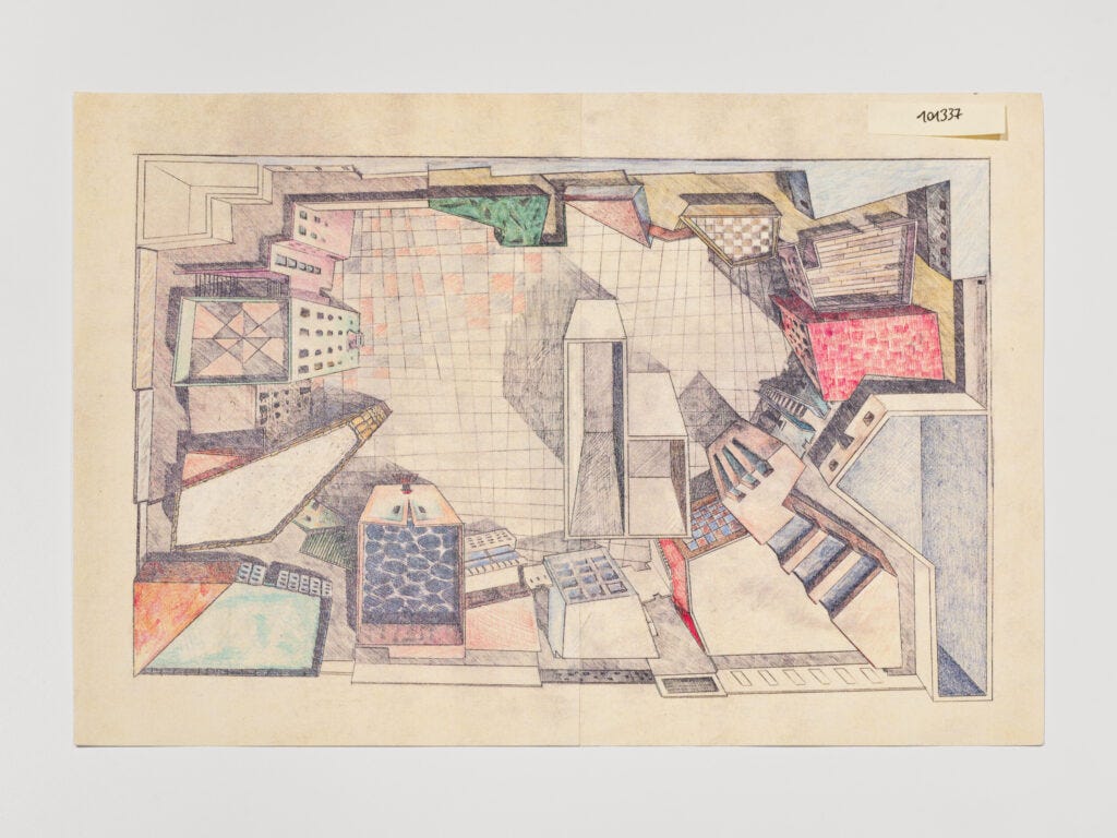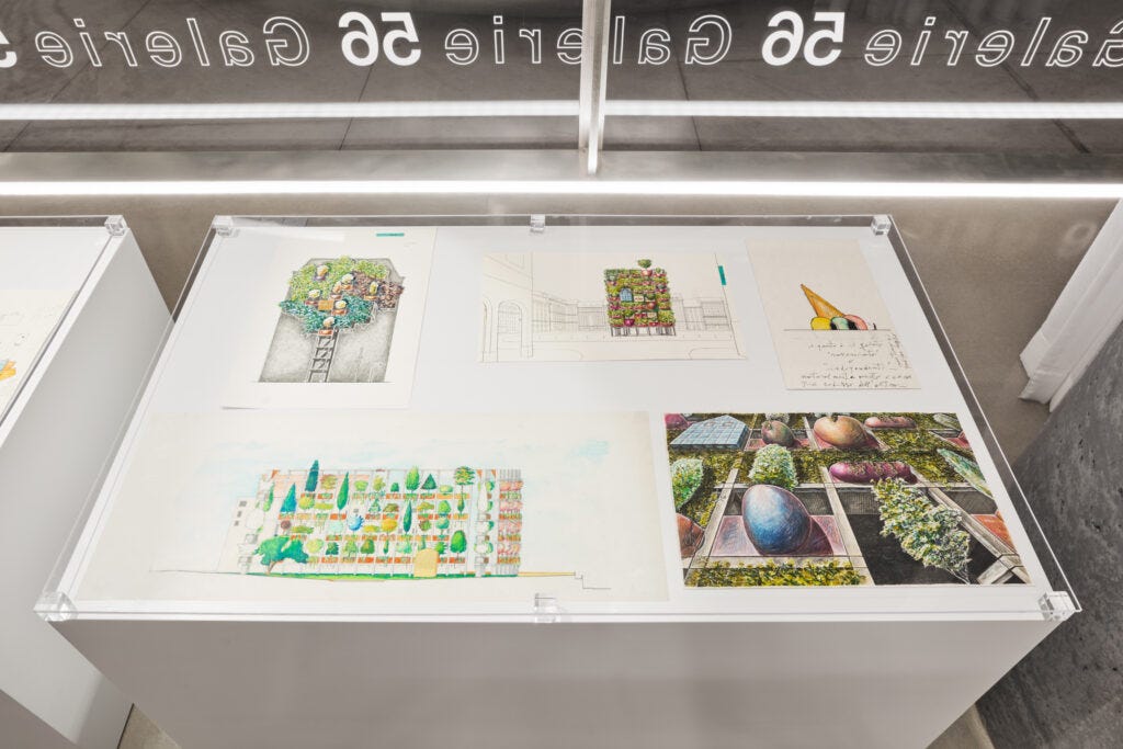 The exhibition is a celebration of Pesce’s exquisite conceptual and personal approach, and the title ‘Unframed’ refers to the artist’s preference for hanging his artwork unframed. The drawings, most of which are bordered with black tape and shown through sheets of clear plastic, are rare documents that reveal the process behind Pesce’s architecture, sculptures, and objects, which we tend to only recognize in their completed state. At the core of every drawing—whether it is of a house, a landscape, an interior, or an object—is a humanoid, often manifested the silhouette of the artist’s own portrait. You can clearly see the lips, feet, and eyes revealed in the drawings and objects; you find yourself seeking them out, as they are the common thread throughout the work on display. Pesce’s drawings and objects are manifestations of his dreams. In the words of Mindel, the 83-year-old architect has a child’s soul that is always present in his dreams and imagination. This is one of the reasons why his work appeals to the child in us and has never ceased to excite new followers and admirers generation after generation.