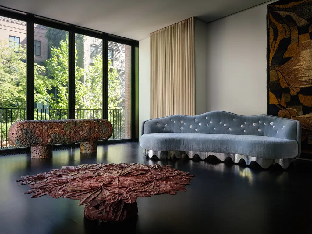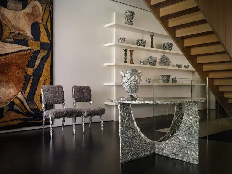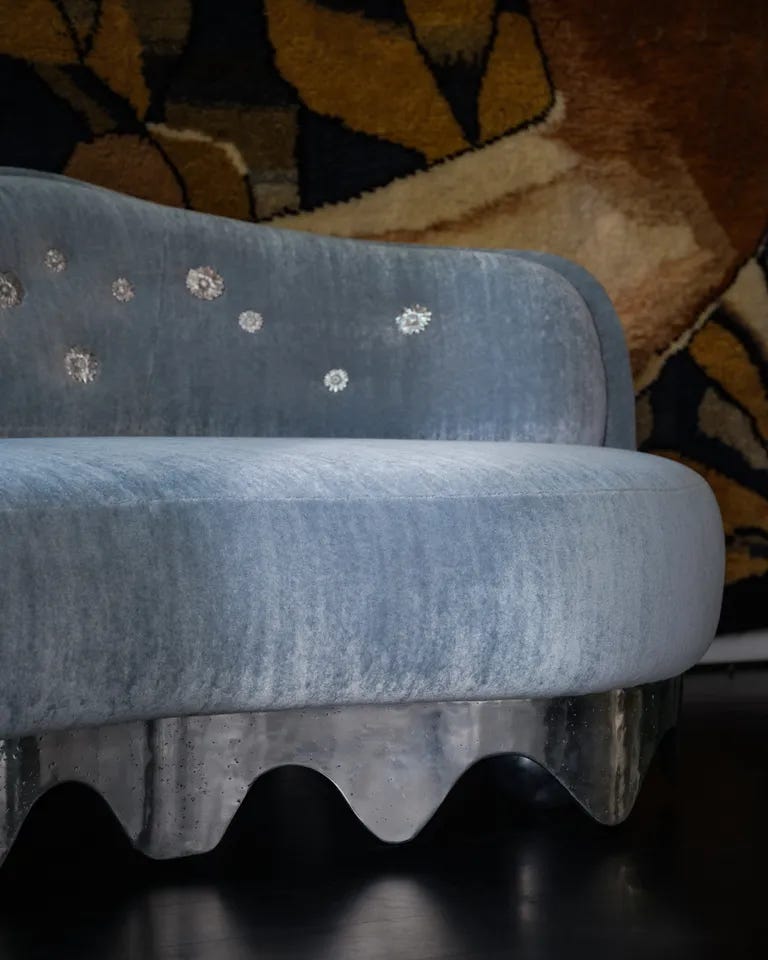 Wolston’s interest in the handmade has taken him across the globe, where he has fabricated the pieces in the show. They represent a fascinating symphony of materiality and crafted techniques, such as sand cast aluminum, lost-wax cast bronze, hand-blown glass, and hand-built clad. The blown glass in the chandelier was crafted in Murano. The clay chairs that were hand-built in stoneware and covered with a patina-looking glaze were created at the University of Arkansas as a part of an experimental project. The tapestries were woven in Morocco, and the central sofa is upholstered in baby blue French mohair and tufted with polished aluminum daisy buttons. Infusing contemporary design with traditional values is central to contemporary design today, and in this, Wolston has succeeded.