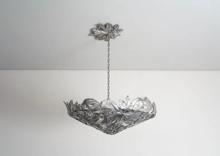 When I visited him hours before the show opened, Wolston told me that the phrase ‘gilding the lily’ is a misquote of a line from Shakespeare’s King John: “to gild refined gold, to paint the lily… is wasteful and ridiculous excess.” It means to spoil what is already beautiful to perfection by adding unnecessary ornamentation and embellishment. To him, it is about loading forms with an exaggeration of ornamentations that go beyond their function and instead bring a sense of fantasy. His bold pieces are dominated by embellishments, layered textures, decoration, patterns, and ornaments. Wolston is not afraid to call himself a maximalist. In this show—which opens just weeks before the opening of his upcoming solo show at the Dallas Contemporary—his pieces are inspired by various expressions in the Art Nouveau Movement, where nature plays a central role. But his pieces are monochromatic and therefore tend to be quiet and restrained in their own way. I believe that this balance and infusion of two contradictory directions is the core of their greatness.