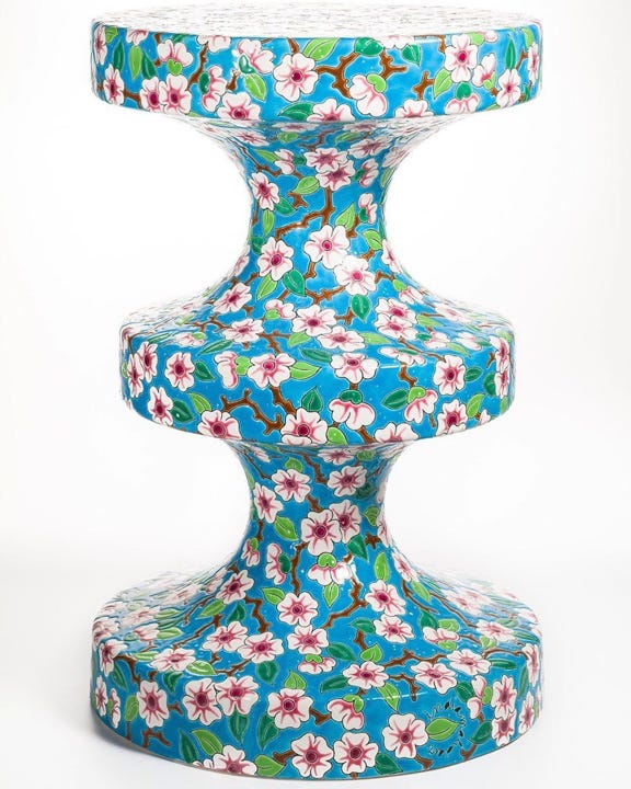 Over the years, Mahdavi has expanded her interiors career to include designing furniture, lighting, and home accessories, which are offered through her own showroom in Paris and in the US through Ralph Pucci. Ralph, she says, has a special intuition to know what is right, and his enormous showroom, with its high ceiling and brick walls, cast her objects in a new and different light. Every piece that she creates is crafted in France and fully resolved. Each has a name that tells its story. Her signature design is Bishop, named after the chessman that is confined to diagonal movements with no restriction on distance. Mahdavi’s Bishop is both a stool and a side table, originally made in wood but now available in ceramic in a rainbow array of soft, satin glazes. The new variation decorated in an apple blossom pattern is particularly magical.