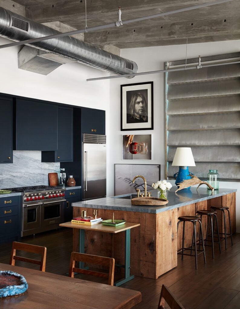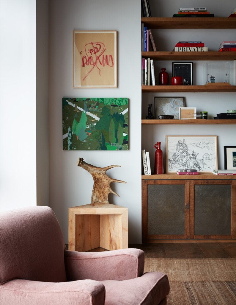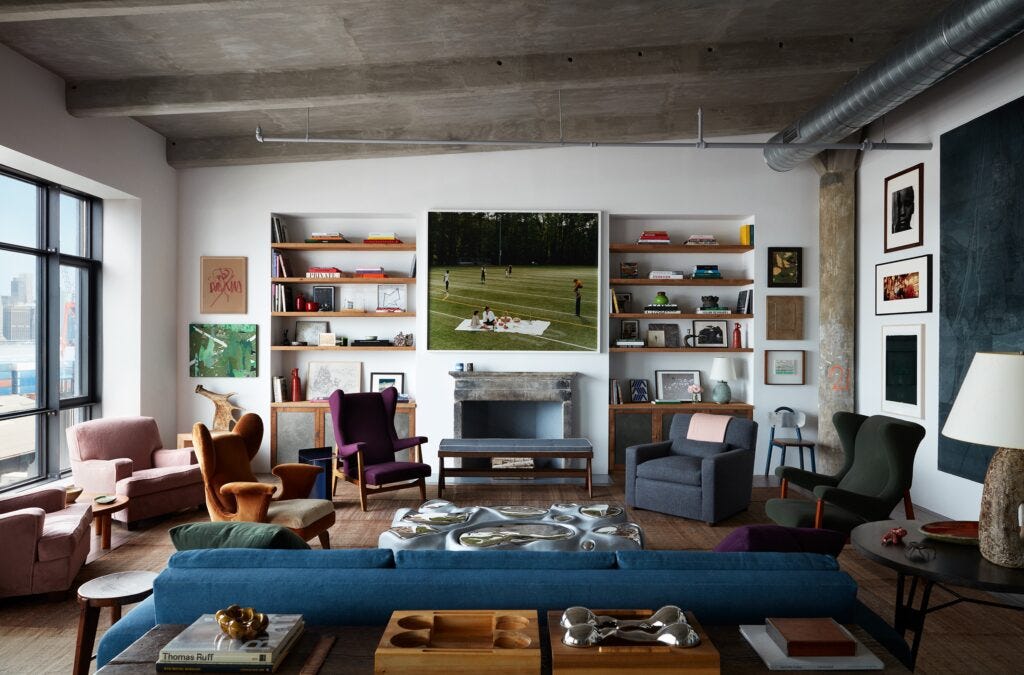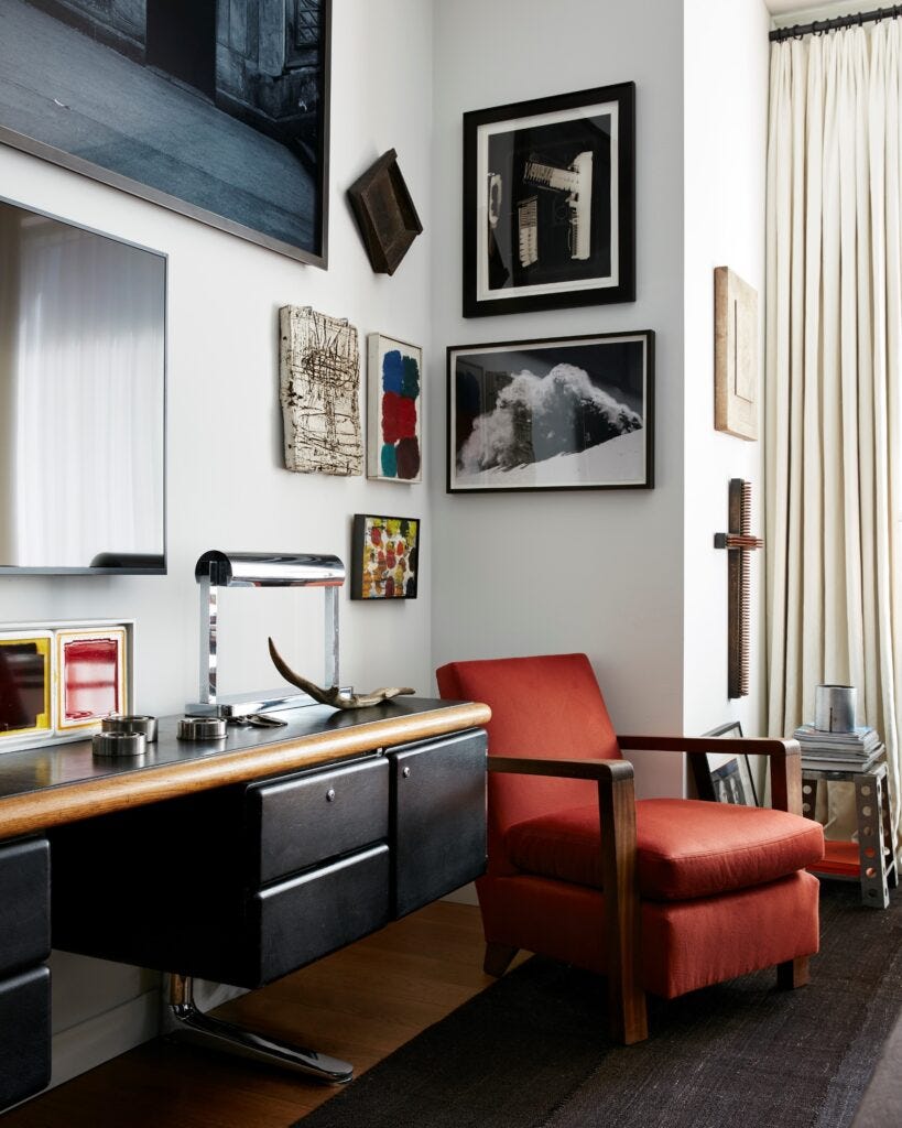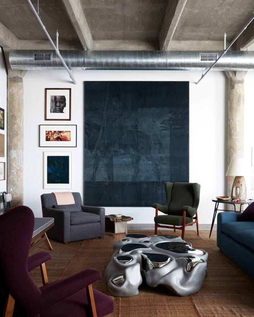 We started the talk with a virtual visit to Stilin’s own home, a loft overlooking the harbor in Brooklyn’s Red Hook neighborhood to which he has recently moved from Manhattan. Here, he has demonstrated the most ambitious, mature, and substantial expression of his oeuvre. ‘Stilin,’ Mayer Rus says in the introduction to his monograph, ‘arranges the elements of his craft more like players in a drama than mere objects in space.’ His ability to create scenery, just like a film director or an opera stage designer, is his tool for transforming spaces and forging fresh, unexpected, and dramatic rooms. The exposed concrete ceiling and pipes not only exemplify the authentic loft experience, but also act as the perfect backdrop for masterpieces by Pierre Chapo, Pierre Guariche, Jean Prouvé, Gino Sarfatti, and Franco Albini, which live in harmony with contemporary pieces by Campana Brothers and Rick Owens. The arrangement of the contemporary art on the wall is particularly compelling.