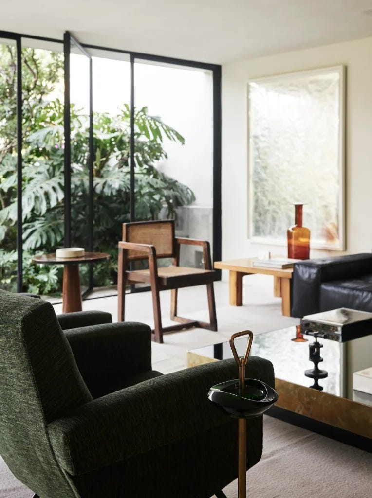 Furniture has always played a central role in Schuybroek’s interiors. Each piece is selected according to form, authenticity, and craftsmanship and then strategically placed within the interior much like sculpture. He fully furnished the S House with pieces designed by Pierre Jeanneret in the 1950s for Chandigarh, but he rarely uses this series now due to the proliferation of copies and fakes in recent years.