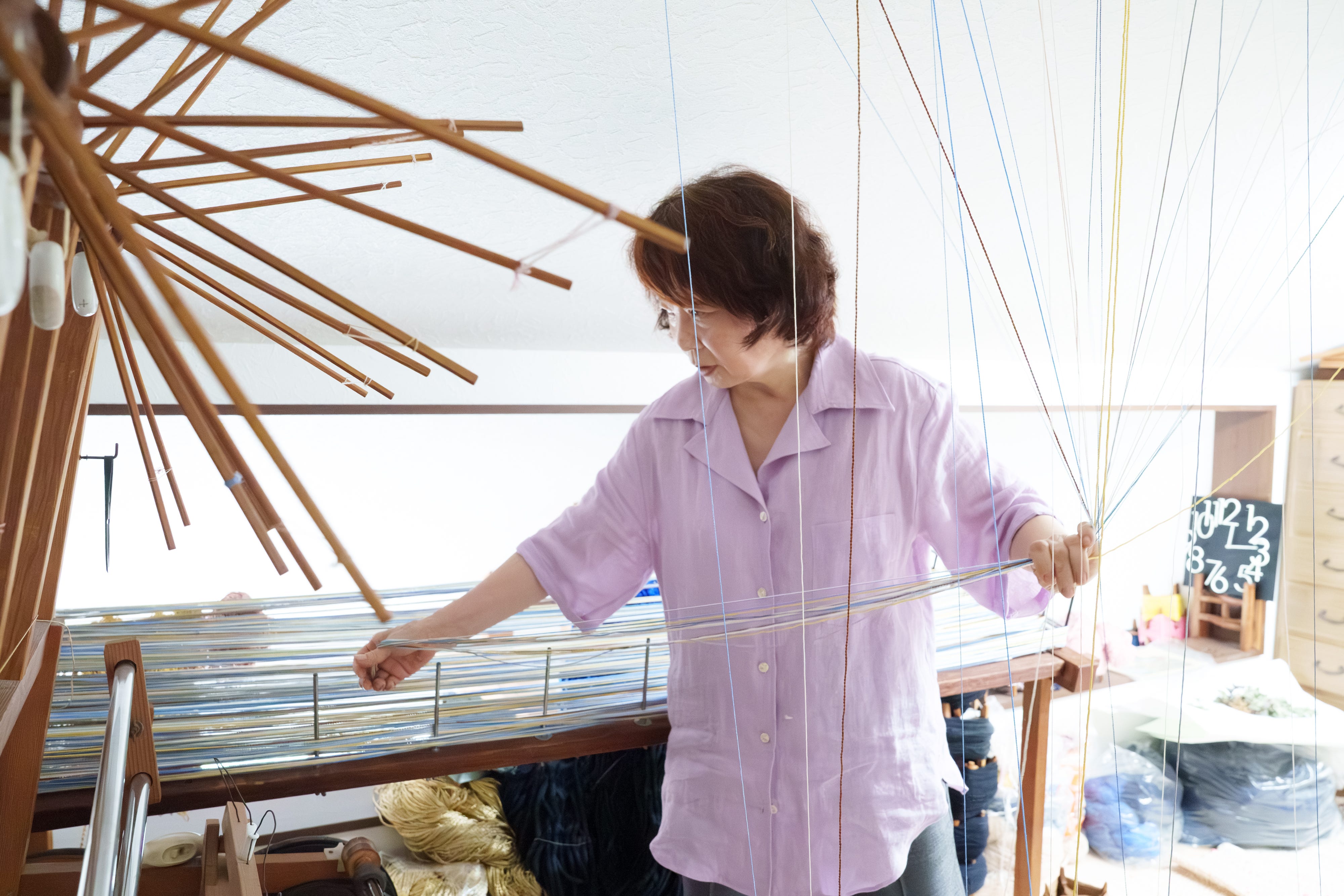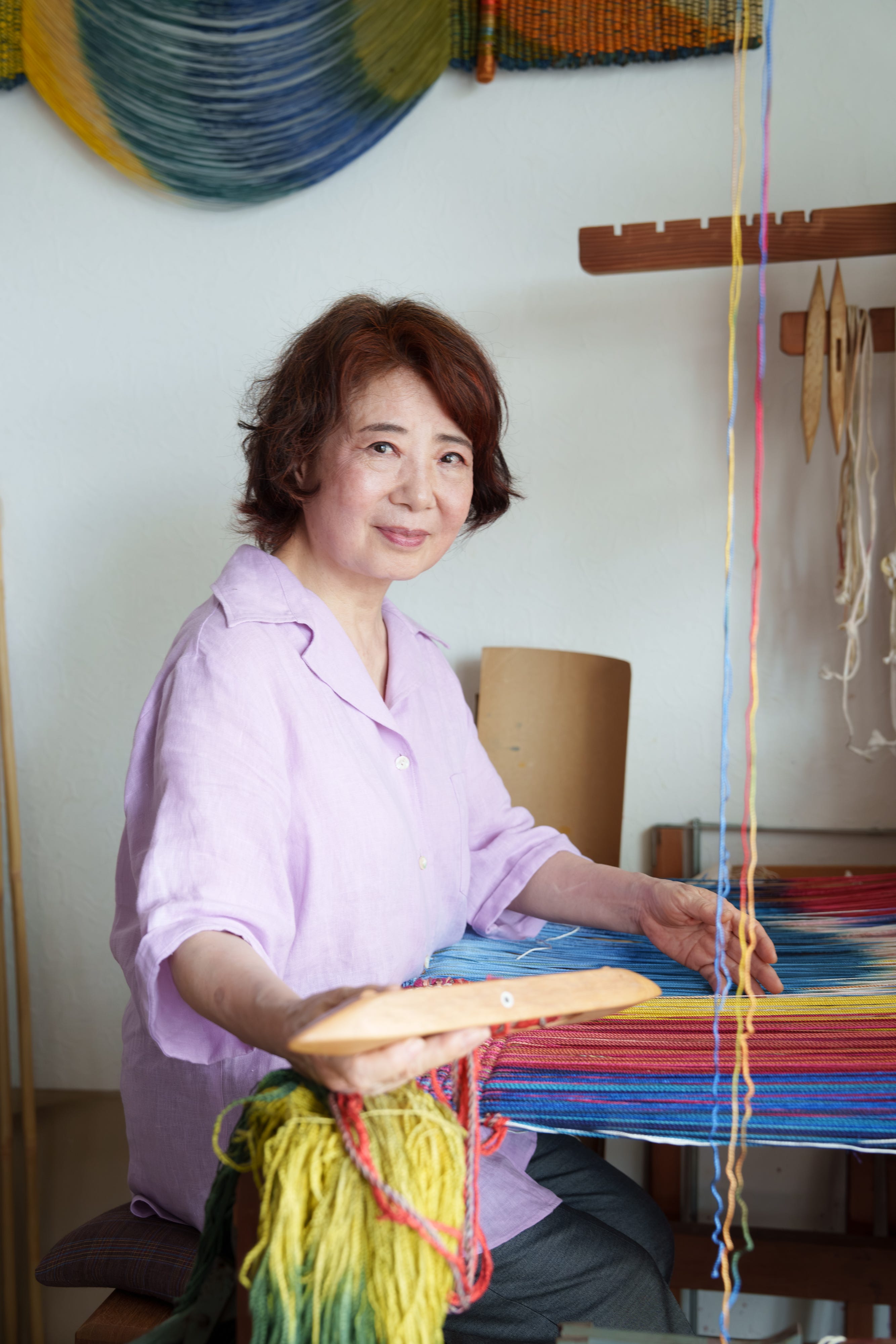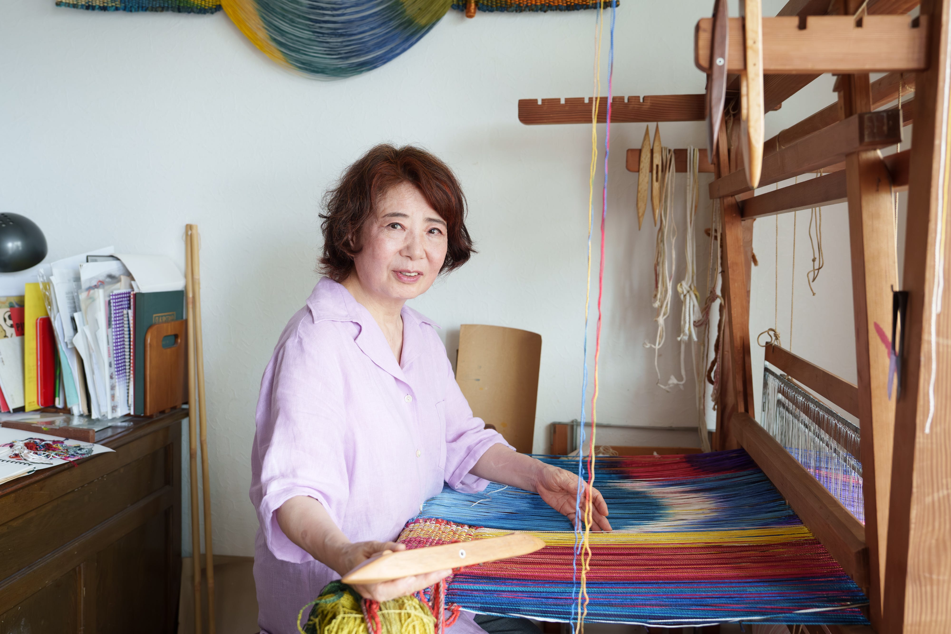 To award-winning textile artist Asakura Mitsuko, tapestries are a form of architecture, much like their roles in the Middle Ages, when they were used to insulate cold castles and churches and to bring artistic sensibilities to the interiors. Her colorful tapestries, she told me, are meant to introduce a new spirit to spaces, to add a personality, and to bring a sense of warmth and intimacy. In her studio at home in Kyoto, Asakura has worked as a visual artist for decades, and her oeuvre continues to grow and shift dynamically, becoming more energetic, more colorful. In recent years, she has introduced a new and innovative technique, where she leaves part of the warp unwoven and has it painted in her personal voice.