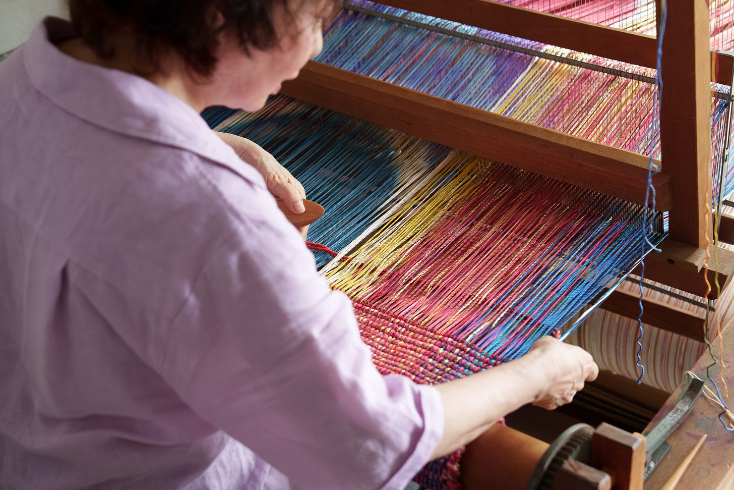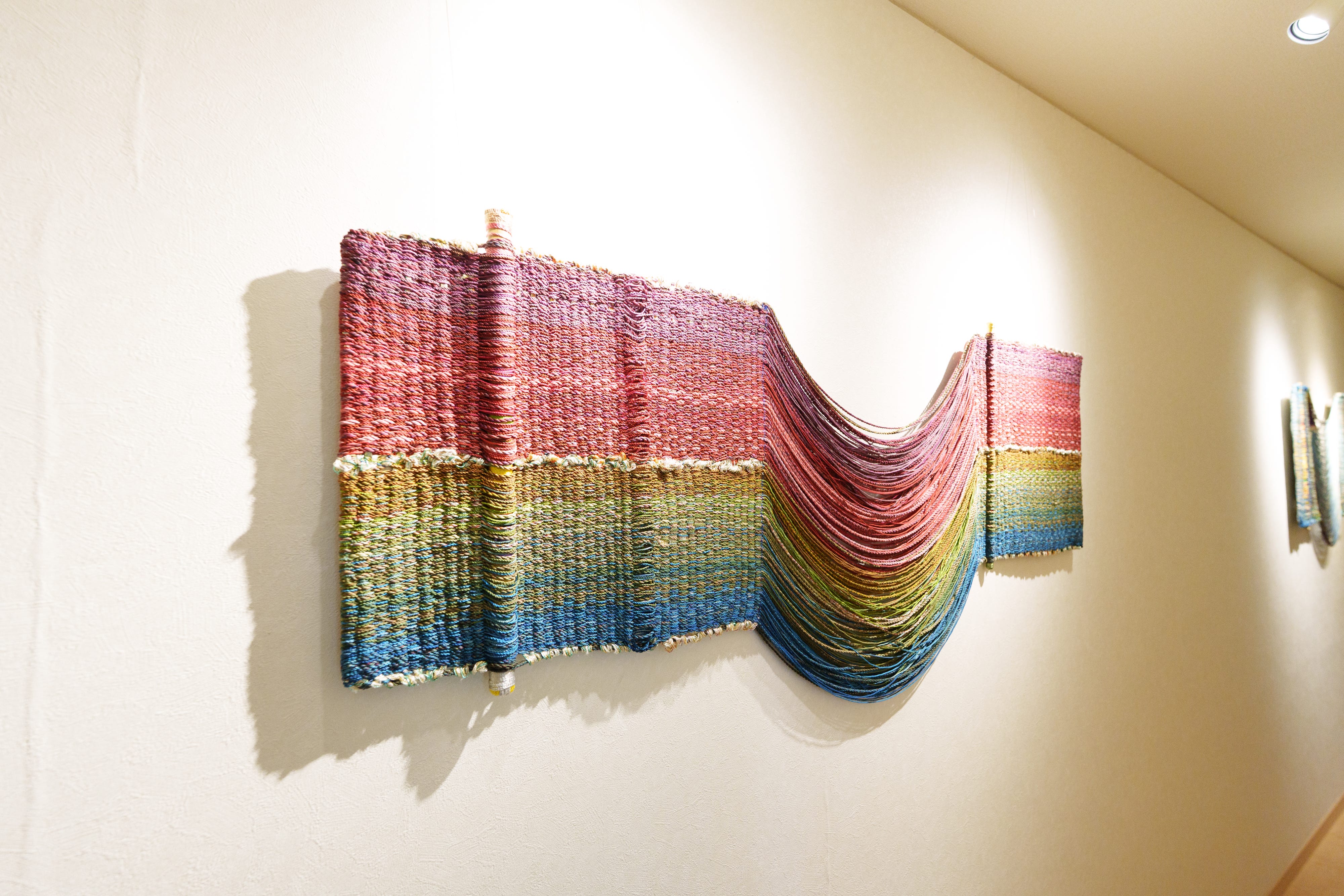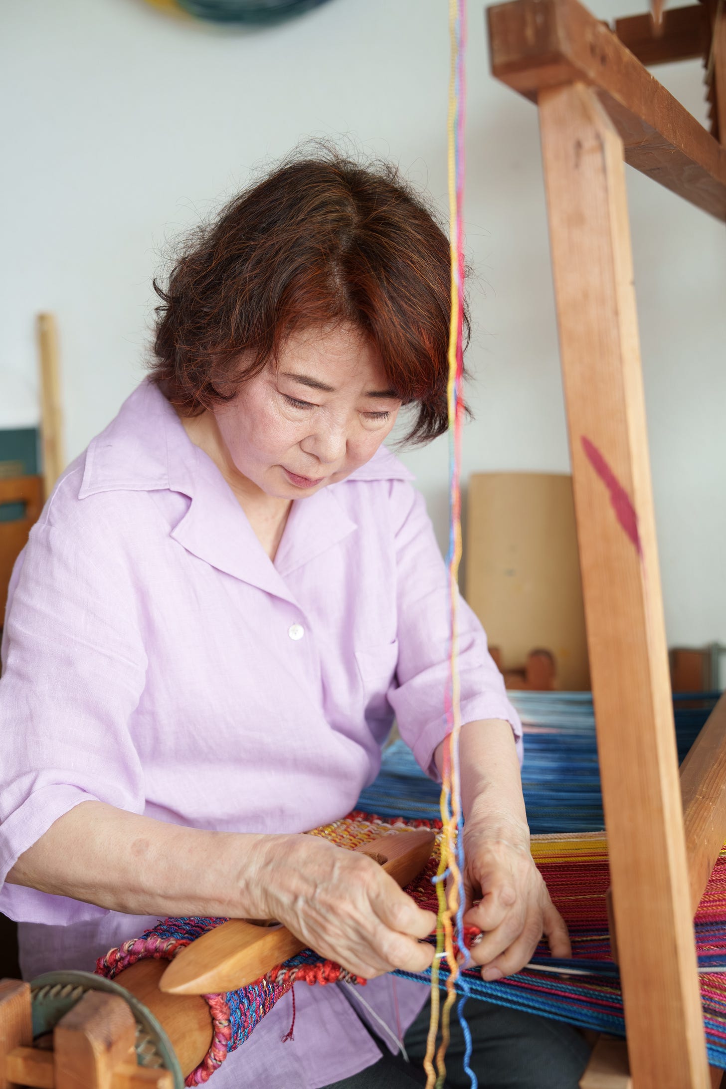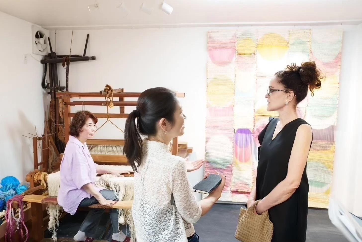 To award-winning textile artist Asakura Mitsuko, tapestries are a form of architecture, much like their roles in the Middle Ages, when they were used to insulate cold castles and churches and to bring artistic sensibilities to the interiors. Her colorful tapestries, she told me, are meant to introduce a new spirit to spaces, to add a personality, and to bring a sense of warmth and intimacy. In her studio at home in Kyoto, Asakura has worked as a visual artist for decades, and her oeuvre continues to grow and shift dynamically, becoming more energetic, more colorful. In recent years, she has introduced a new and innovative technique, where she leaves part of the warp unwoven and has it painted in her personal voice.