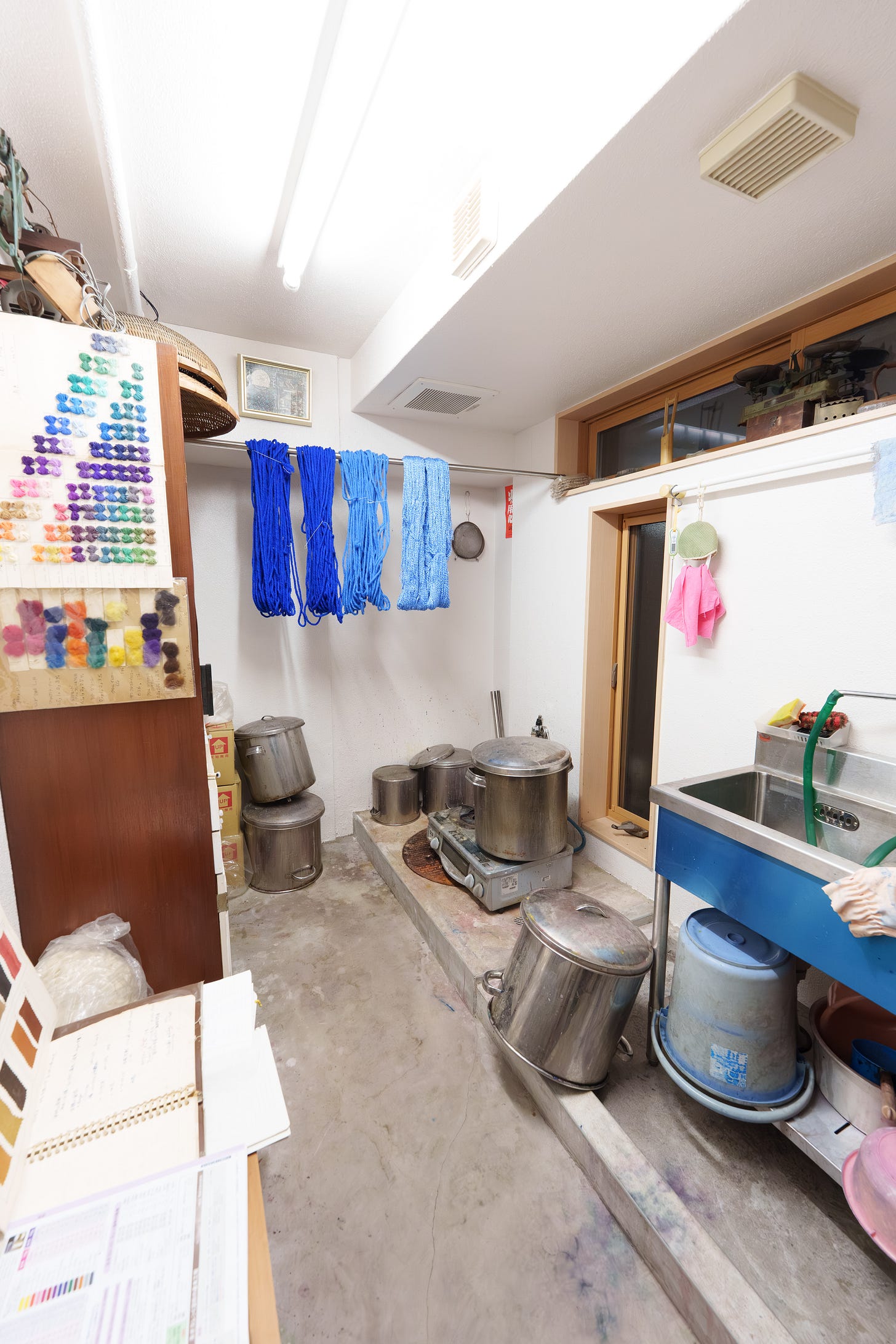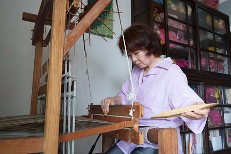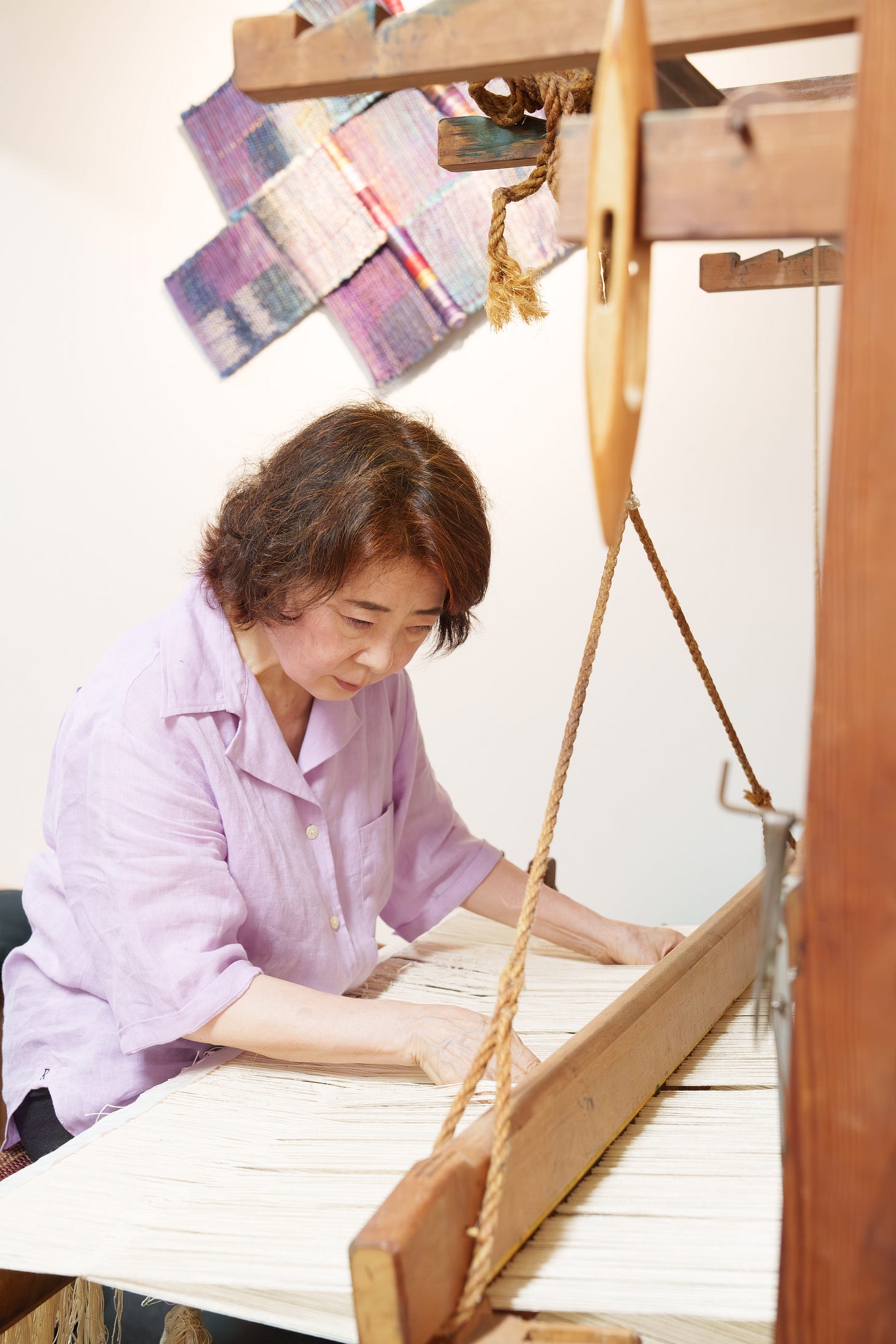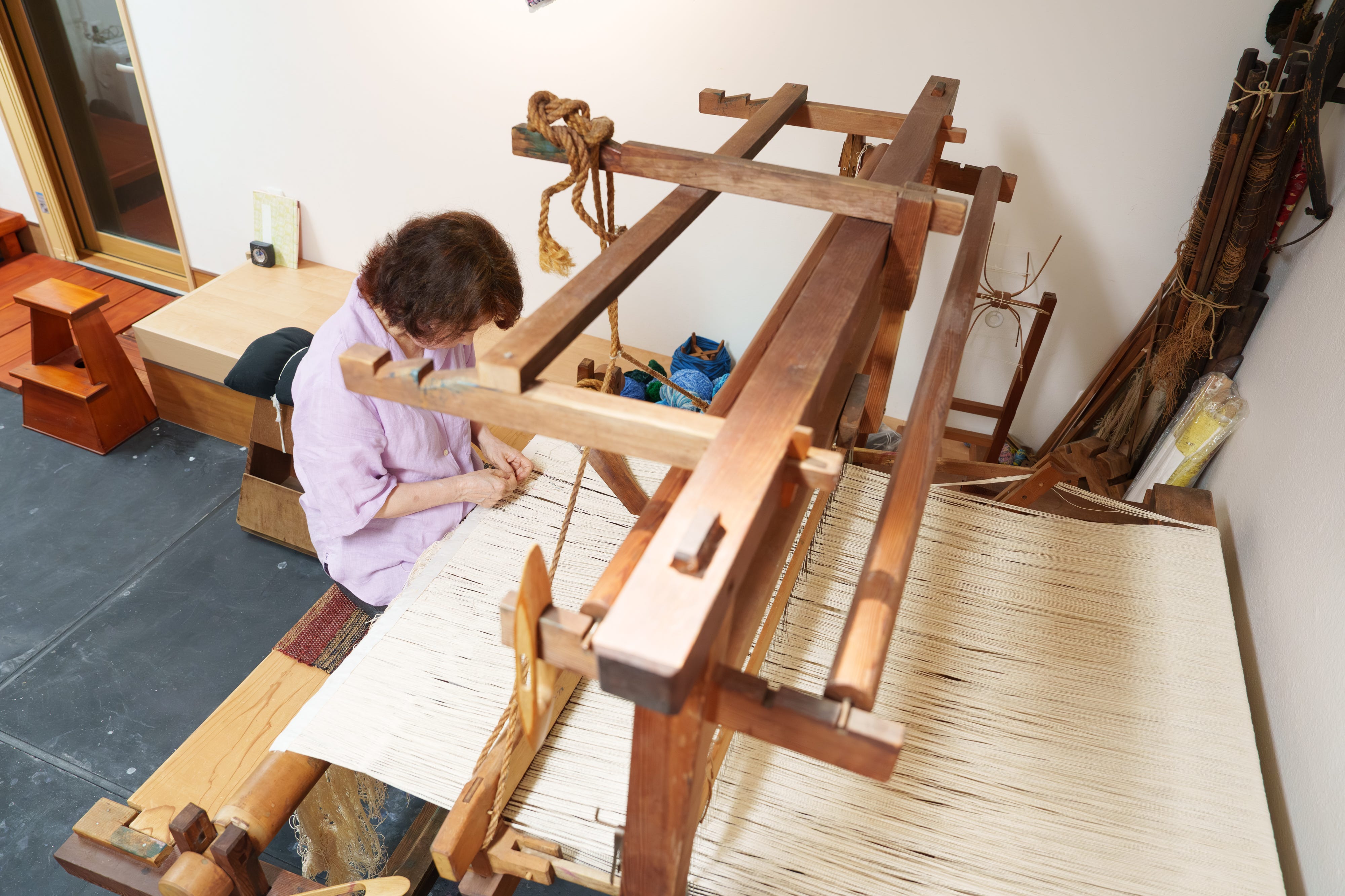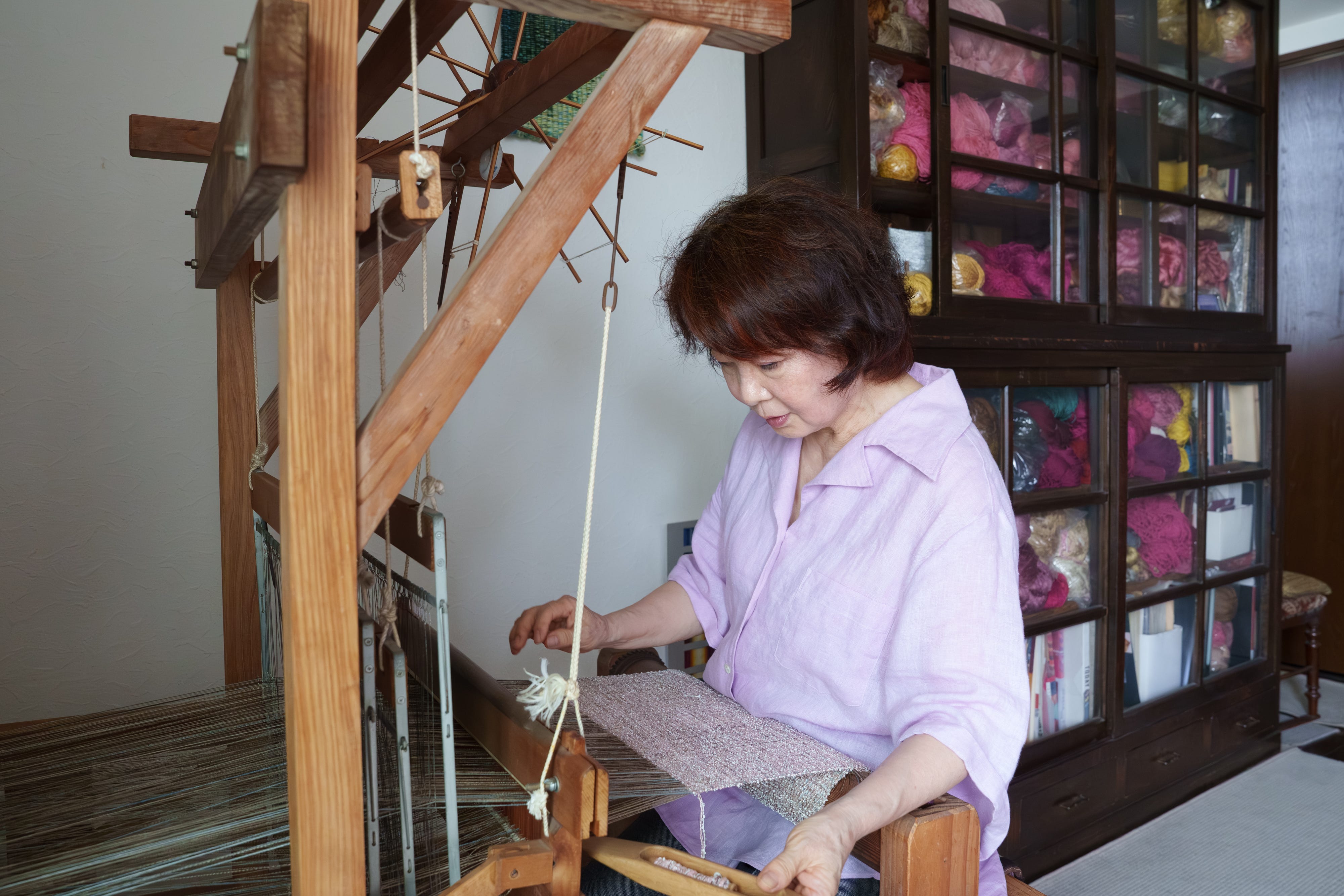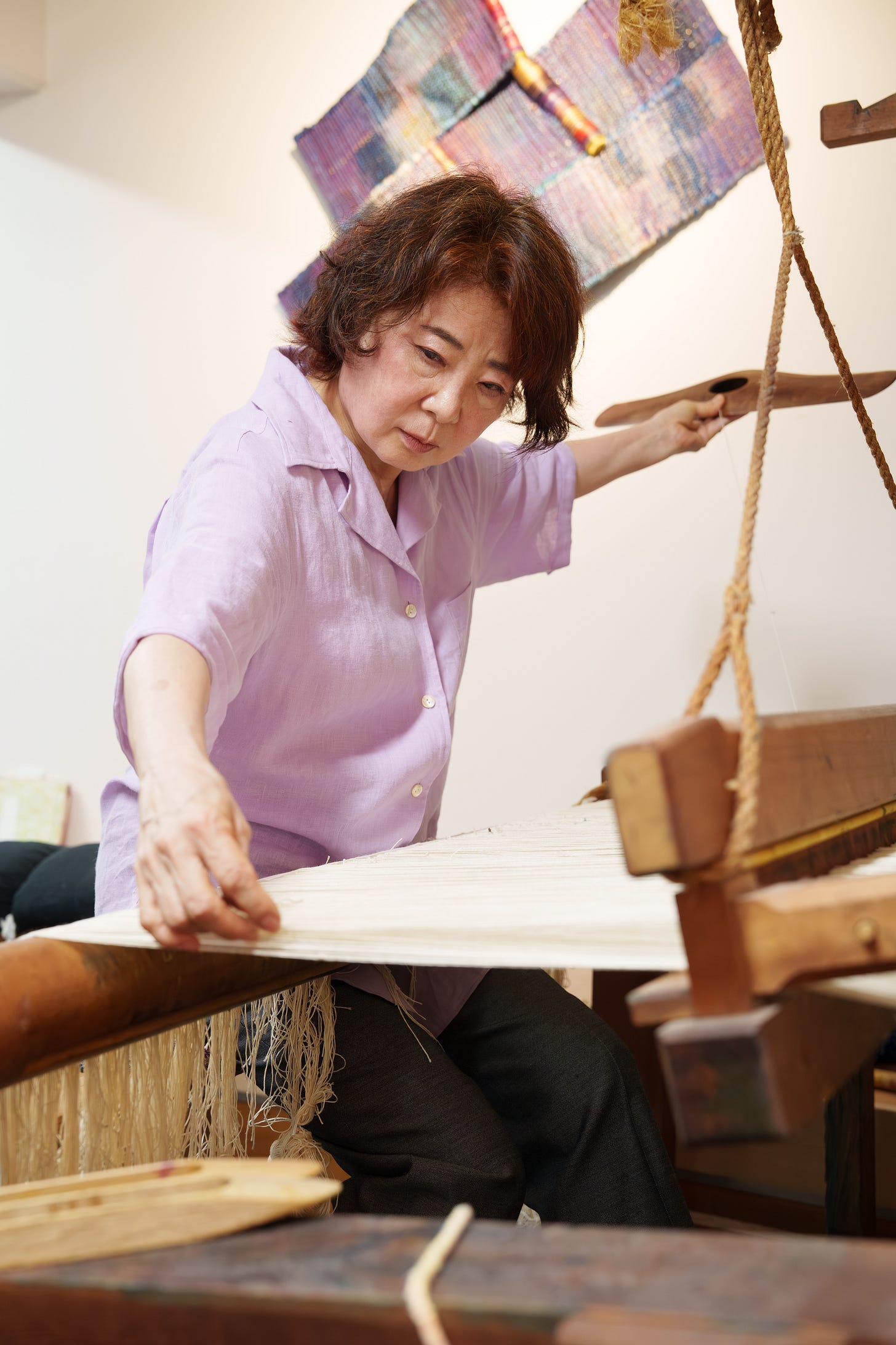 At her studio, set at her home in the Gosho-Minami neighborhood of Kyoto, Asakura has created tapestries for decades, bringing a contemporary allure to the world of Japanese fiber art. The basement of the house is set for dyeing. Here, she dyes silk fibers using leaves, bark, wood, roots, flowers, nuts, minerals, and insects, which she collects in the open fields of Kyoto. On the second floor, she has created her private sanctuary for weaving, filled with antique looms, a traditional spinning wheel, and an endless array of vibrant yarn boxes.
