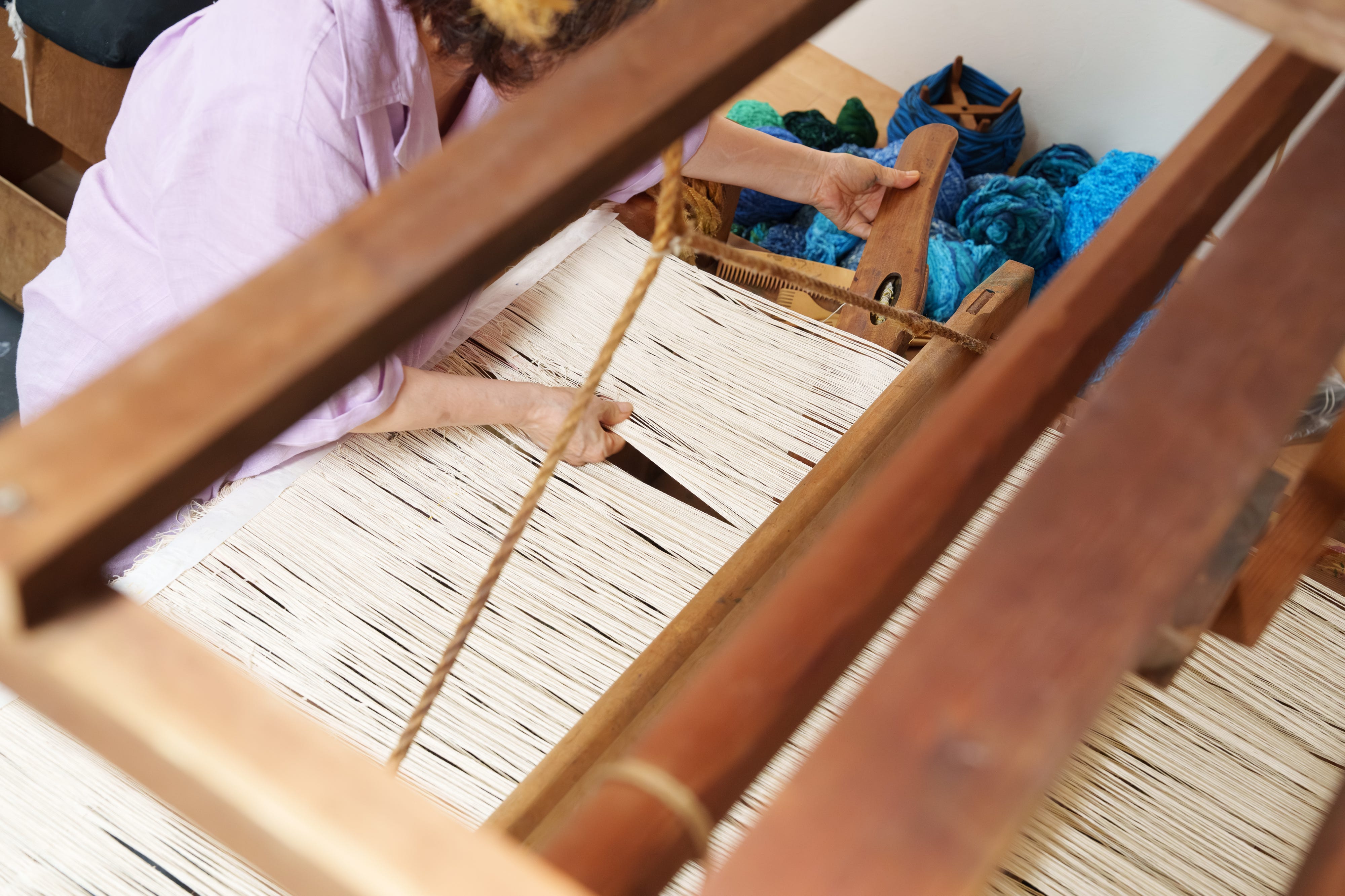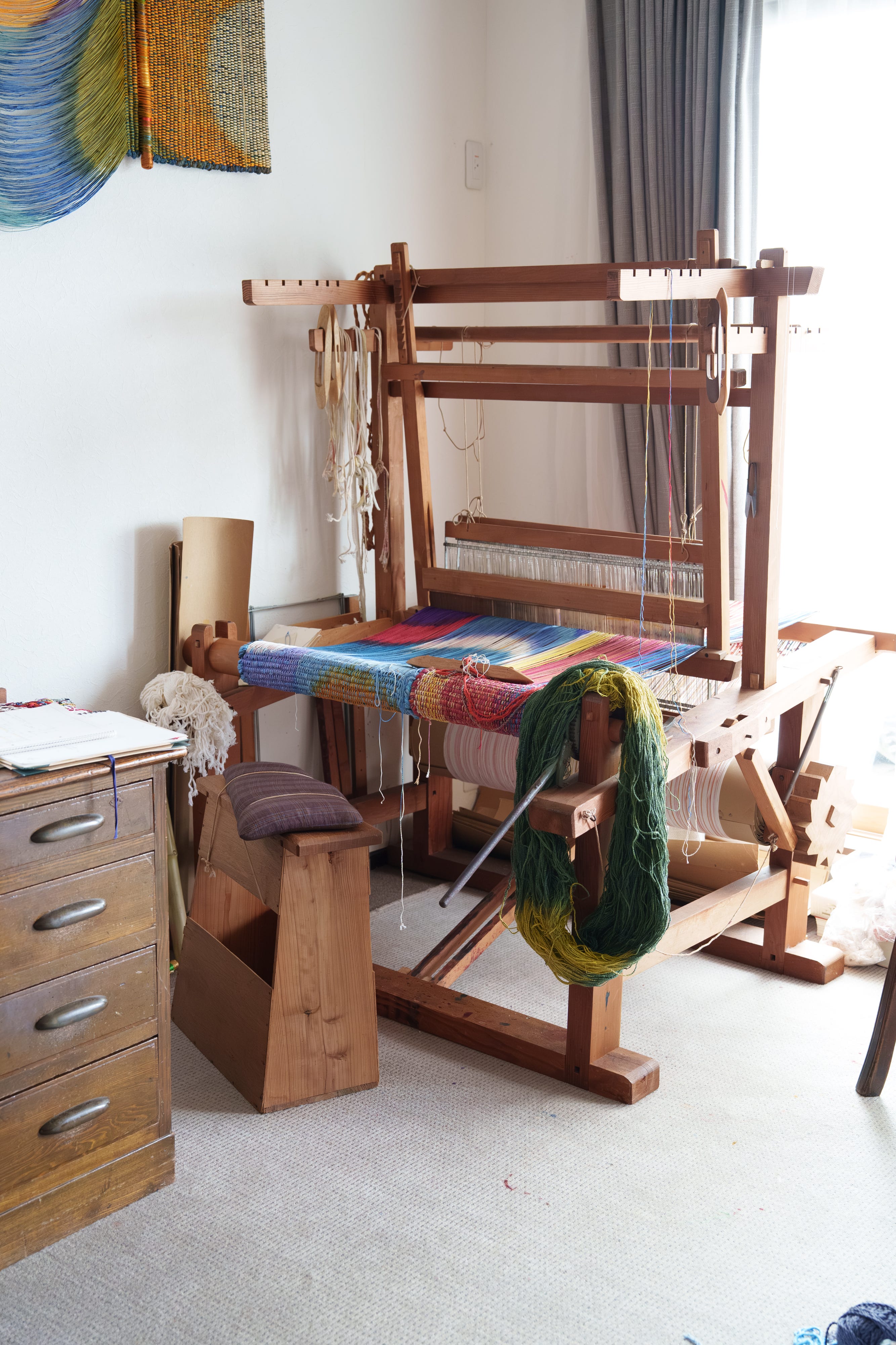For Asakura, the act of dyeing and weaving is spiritual; she believes these processes bridge the old and the new. She sees textile art as “feminine” and tapestry making as a kind of childbirth. While spinning on the old wooden wheel, she explained to me that each tapestry is influenced by everything that surrounds its creation: the season, temperature fluctuations, thread quality, and dye quality. There is nothing generic about her work, and each production presents its own unique conditions and challenges; therefore, no two tapestries are alike. “I listen to the voice of the threads,” she told me, “to devise each step of the process.”