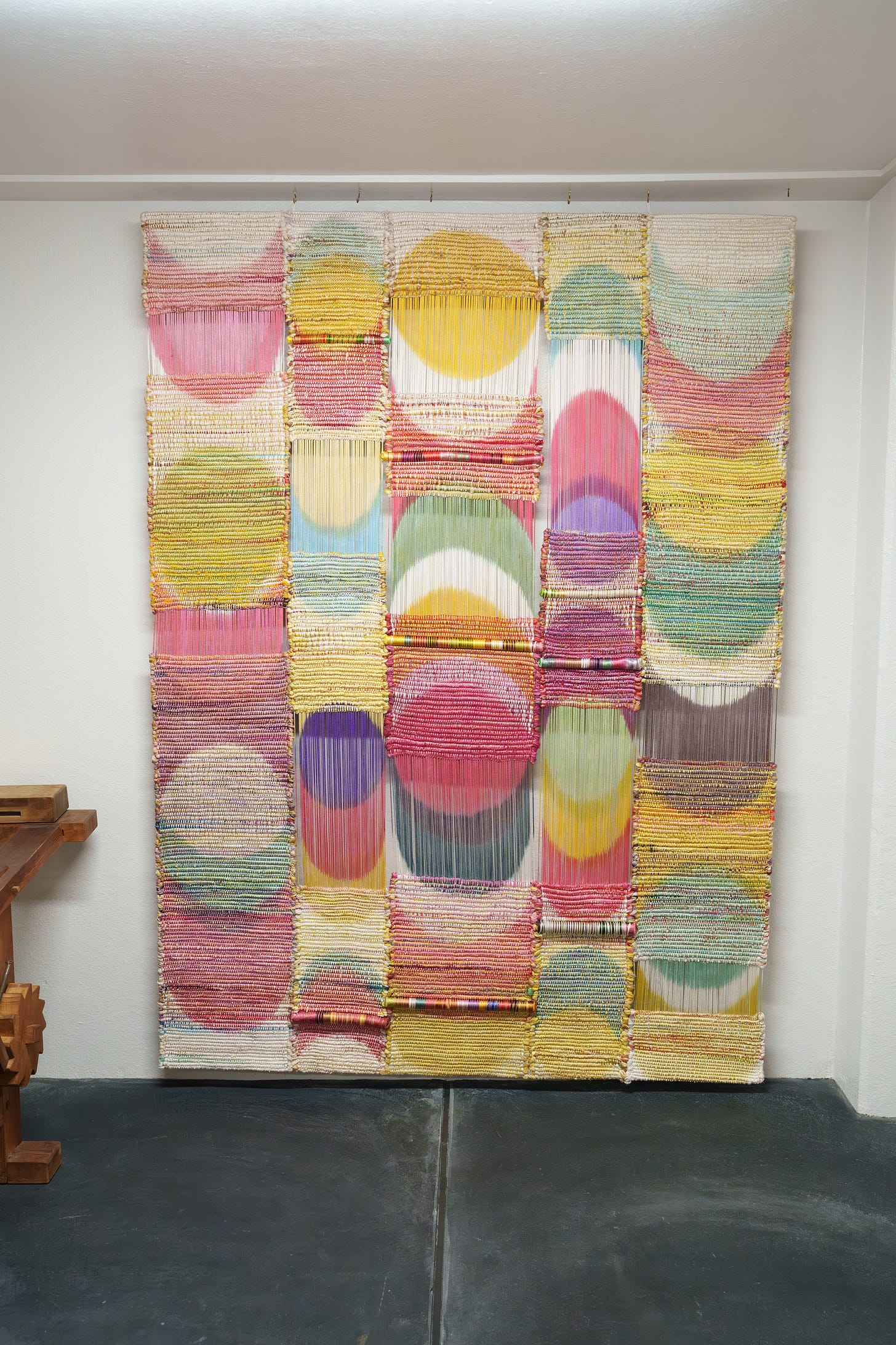 Around the turn of the millennium, Asakura first developed her iconic Waltz series. Composed of small, discrete dots of color, these novel, Pointillism-inspired tapestries feature brilliantly hued patterns that seemingly dance before your eyes. This body of work generated tremendous interest and attention from interior designers and collectors when recently shown in New York and in Palm Beach by collector Lisa Perry’s Onna House, an art space in East Hampton dedicated to supporting women artists, designers, and makers.