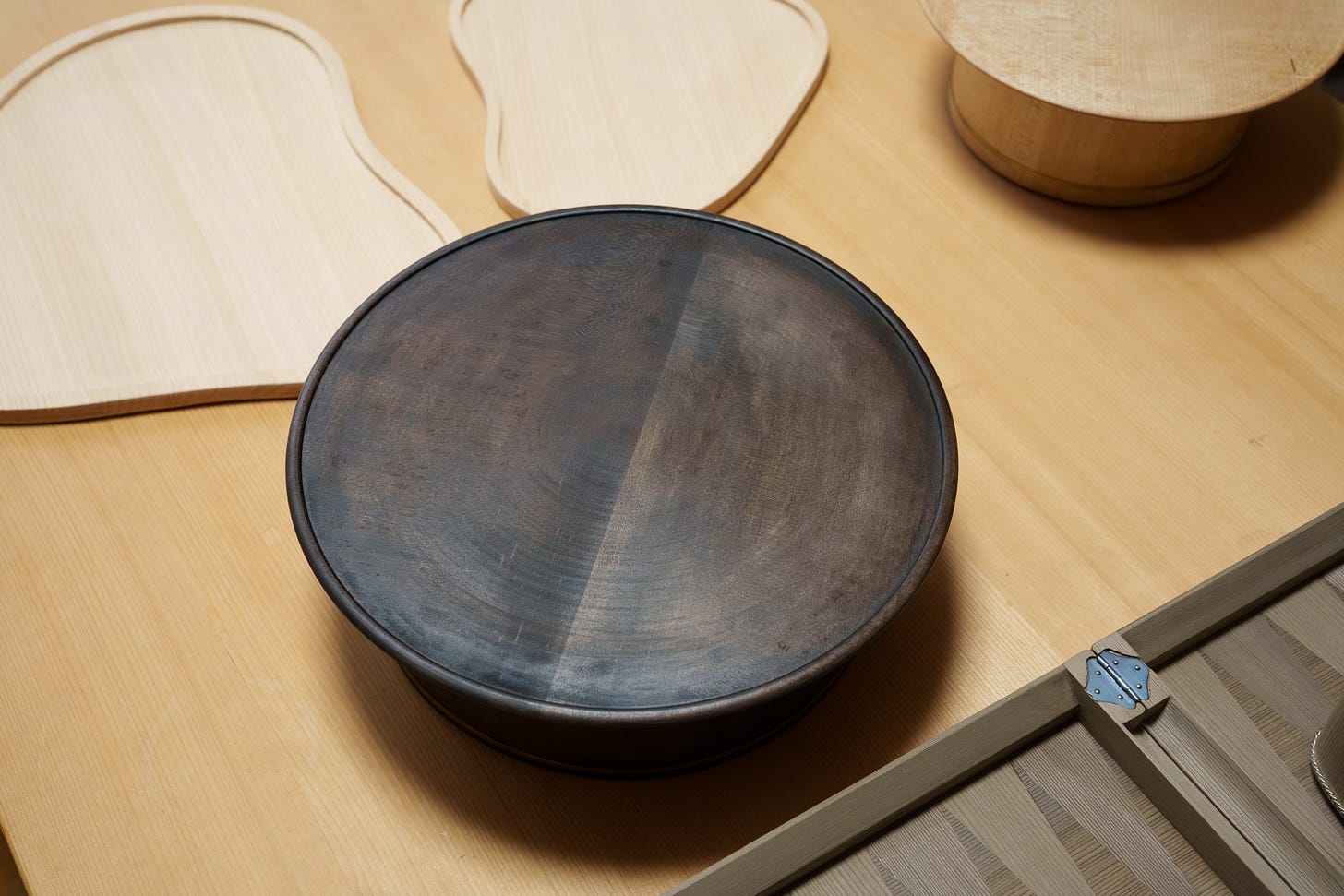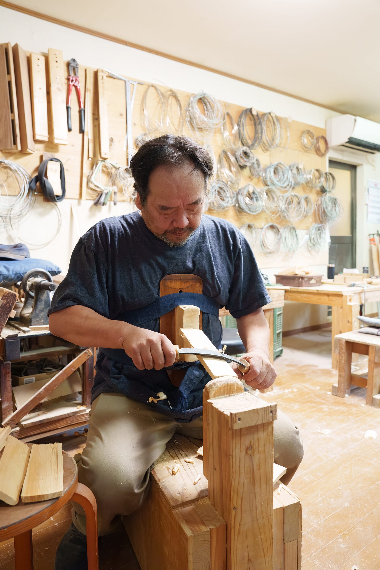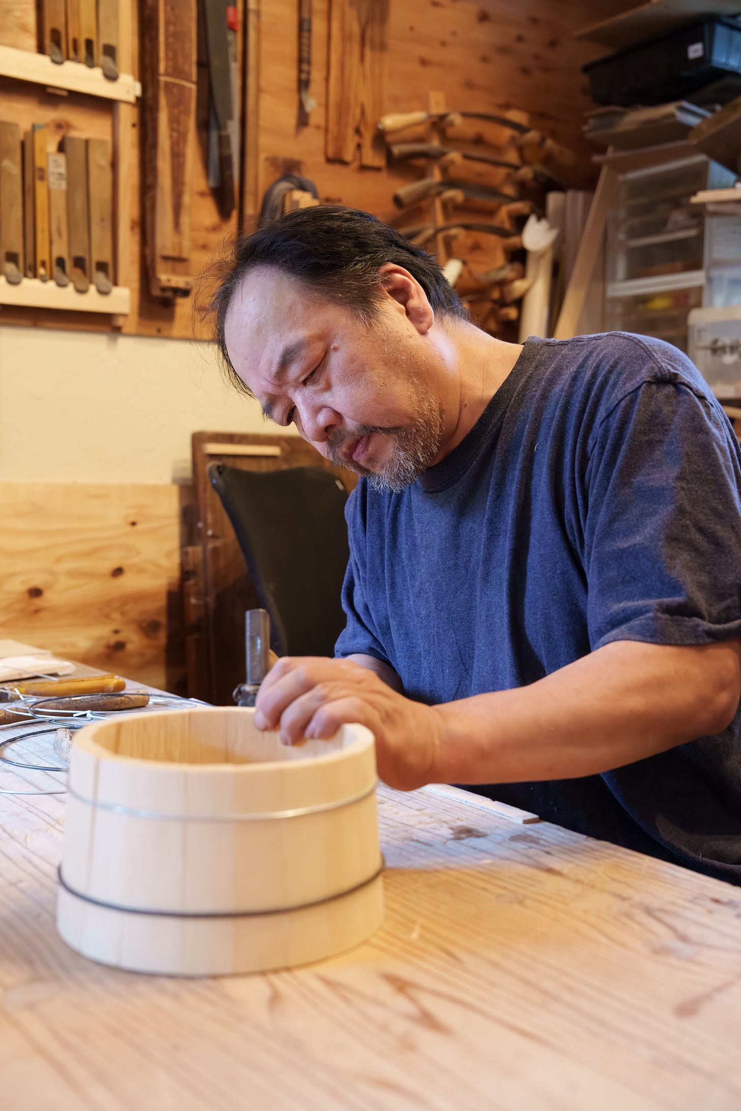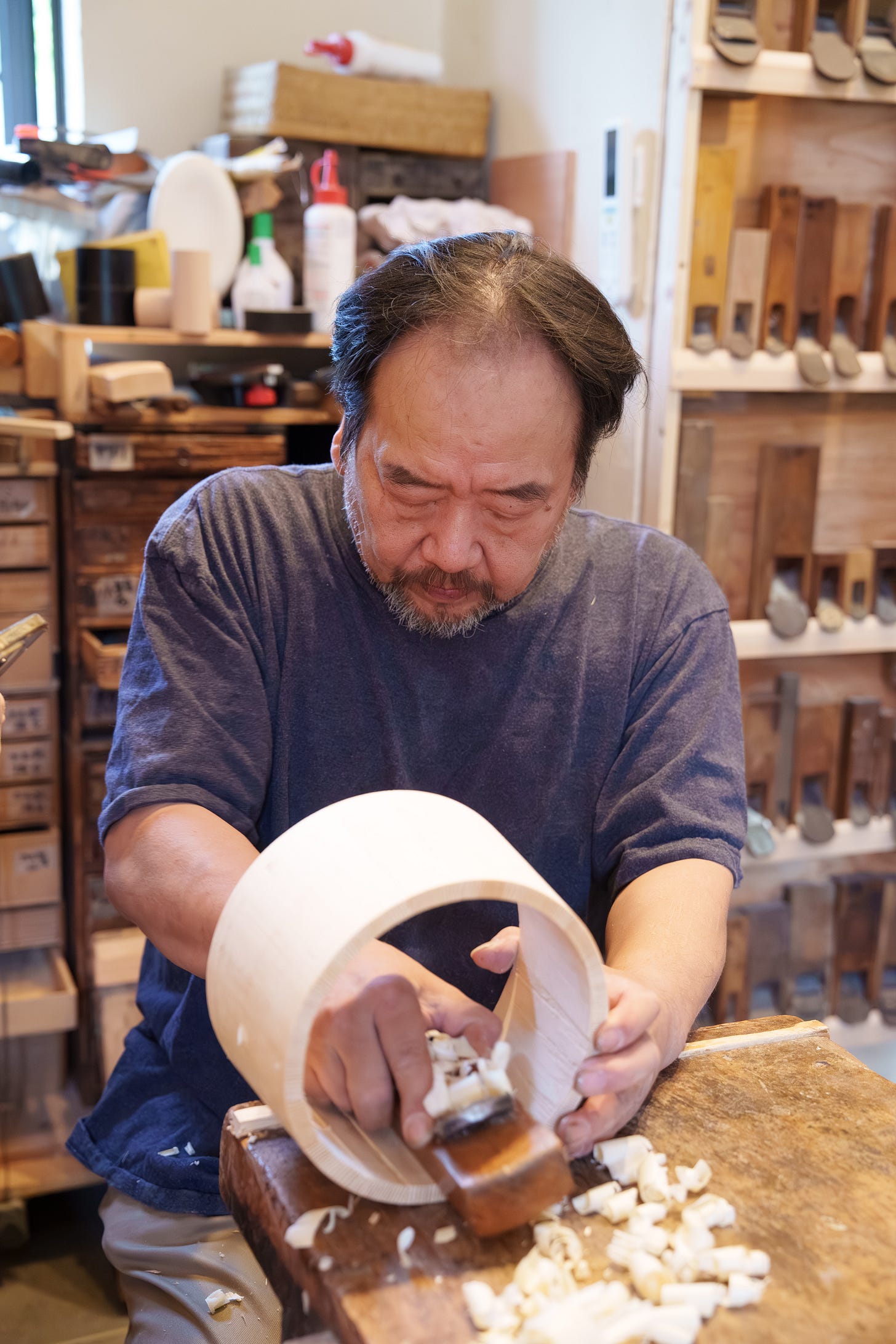 Born and raised in Kyoto, Shuji’s grandfather began making Oke when it was essential for daily life, found in every household in Japan. He learned the craft as a young apprentice, but with the growth of industrialization following the Second World War, and Oke being mass-produced in plastic and other industrial materials, the wooden, handmade objects had lost their traditional place in the Japanese household, and the heritage had nearly disappeared. His son, Shuji’s father, Seiji Nakagawa, a second-generation master craftsman, kept the craft alive, thanks to the loyal clientele of the upscale ryokans and hotels in Kyoto. He offered private hot spring baths equipped with Oke to his guests, allowing them to experience authenticity when visiting the ancient town. He was designated a Living National Treasure for preserving the vanishing craft.