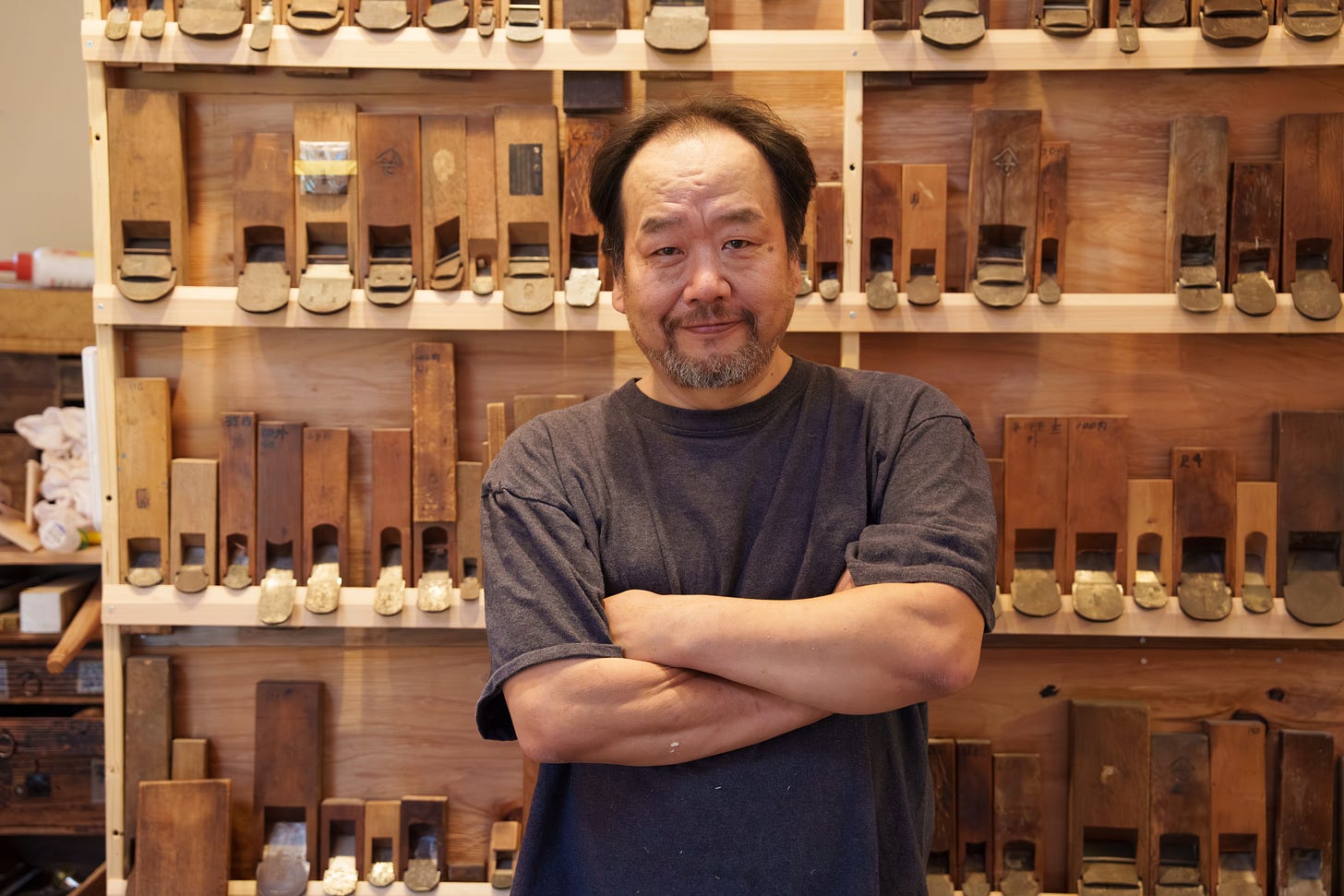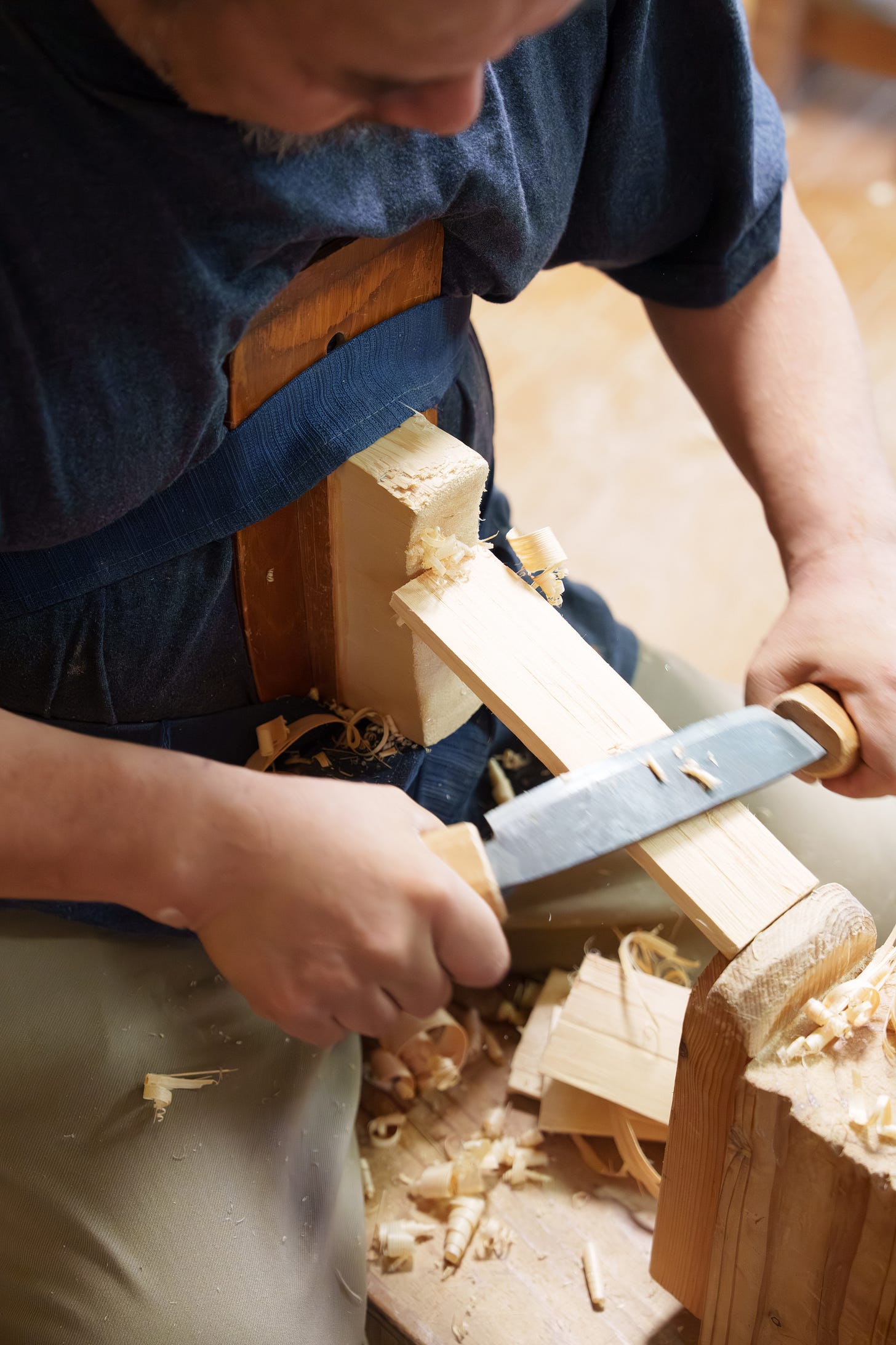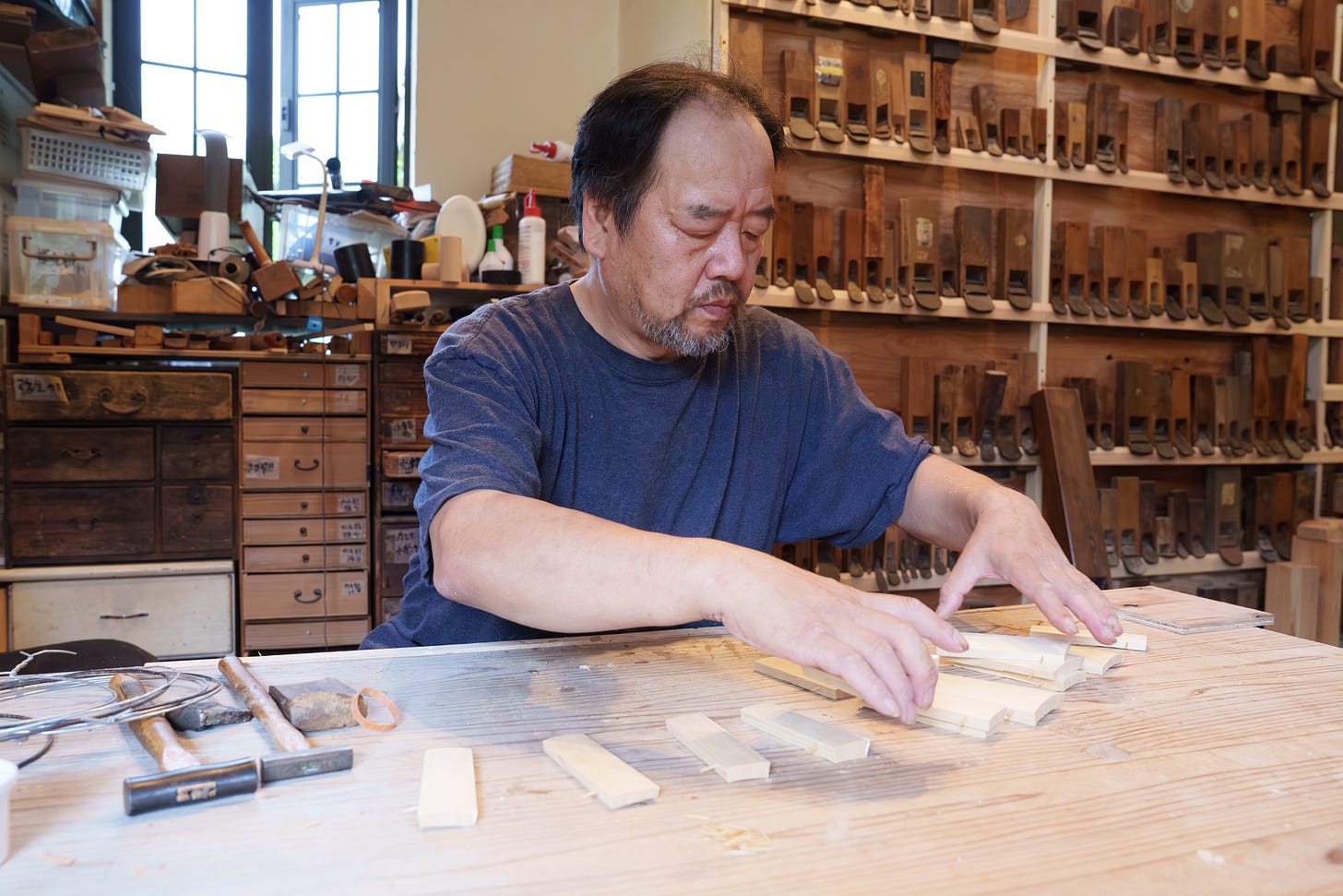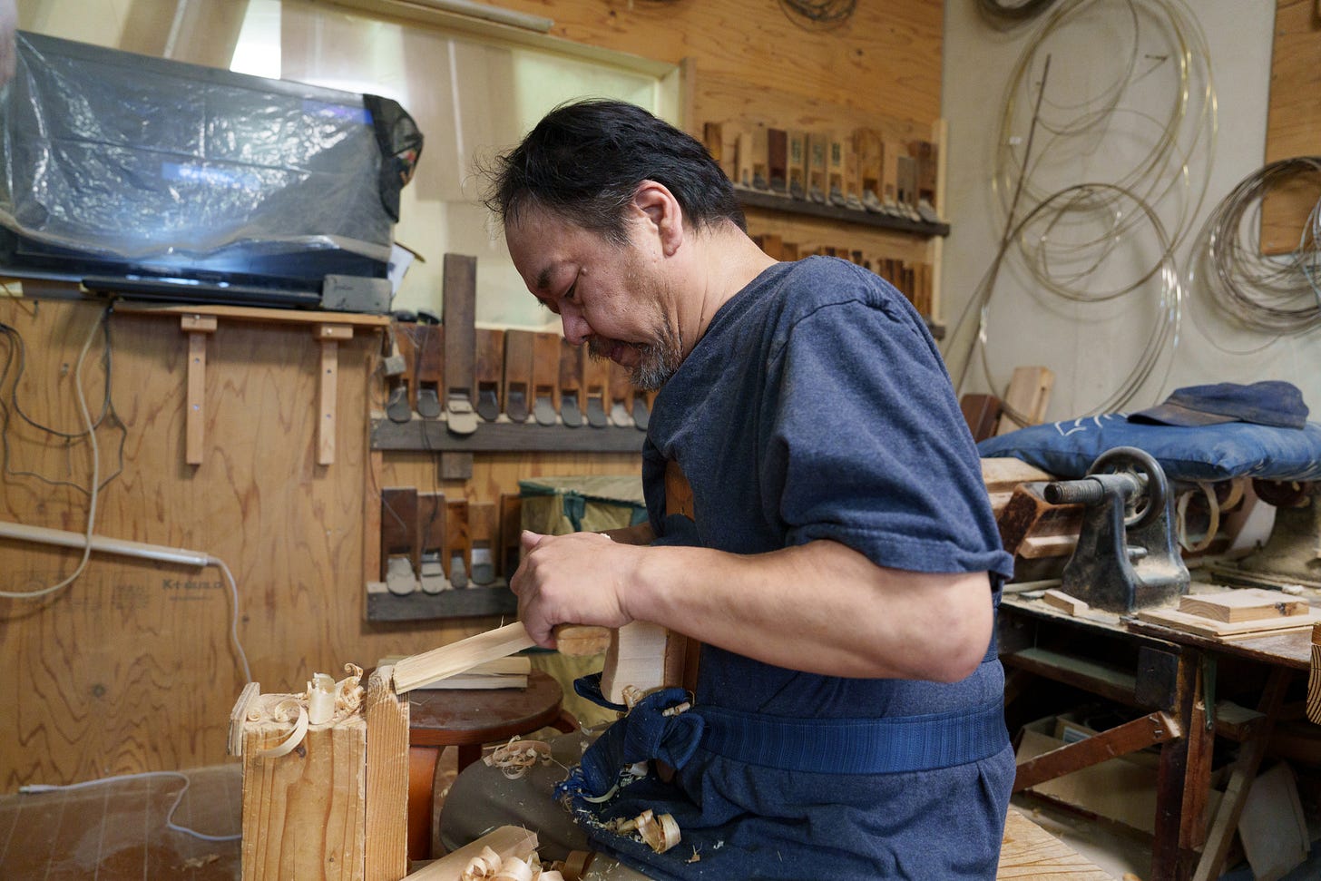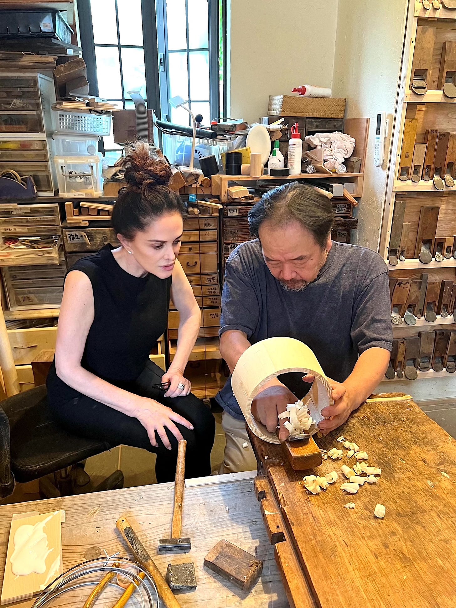 Shuji graduated from Kyoto Seika University with a degree in sculpting art, while simultaneously learning woodworking under his father. Contemporary art has always been his passion, and he began by exhibiting his paintings as a young artist. Today, he combines his skills as a woodworker with the creative vision of an artist, merging the techniques he inherited from his ancestors with art and architecture, while constantly revisiting traditions that are his source of innovation. From the beginning, he sought artistic independence, leaving his family's workshop in Kyoto to establish his own home and studio in Otsu, Shiga Prefecture, on the shores of Lake Biwa. Surrounded by open, unadulterated nature, he alters shapes, forms, and scales. He has devised new functions for centuries-old Japanese accessories, such as champagne coolers, side tables, and stools, as seen in the ‘Wooden Oke Tea Room,’ which was exhibited as Ateliers Courbet in New York last year, as he adapted his craft to architectural design. It was where I first met him, but seeing him again at his studio sanctuary was an excellent opportunity to experience the environment of his studio and witness a demonstration. His two-story workshop is filled with an enormous collection of old tools, all hung meticulously on the walls, at which I marveled, watching him at work.