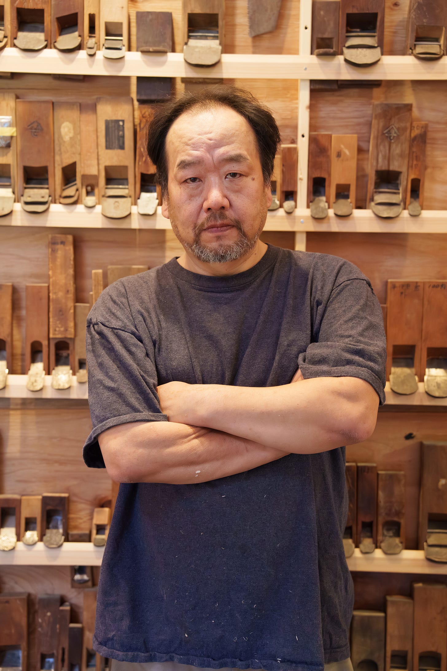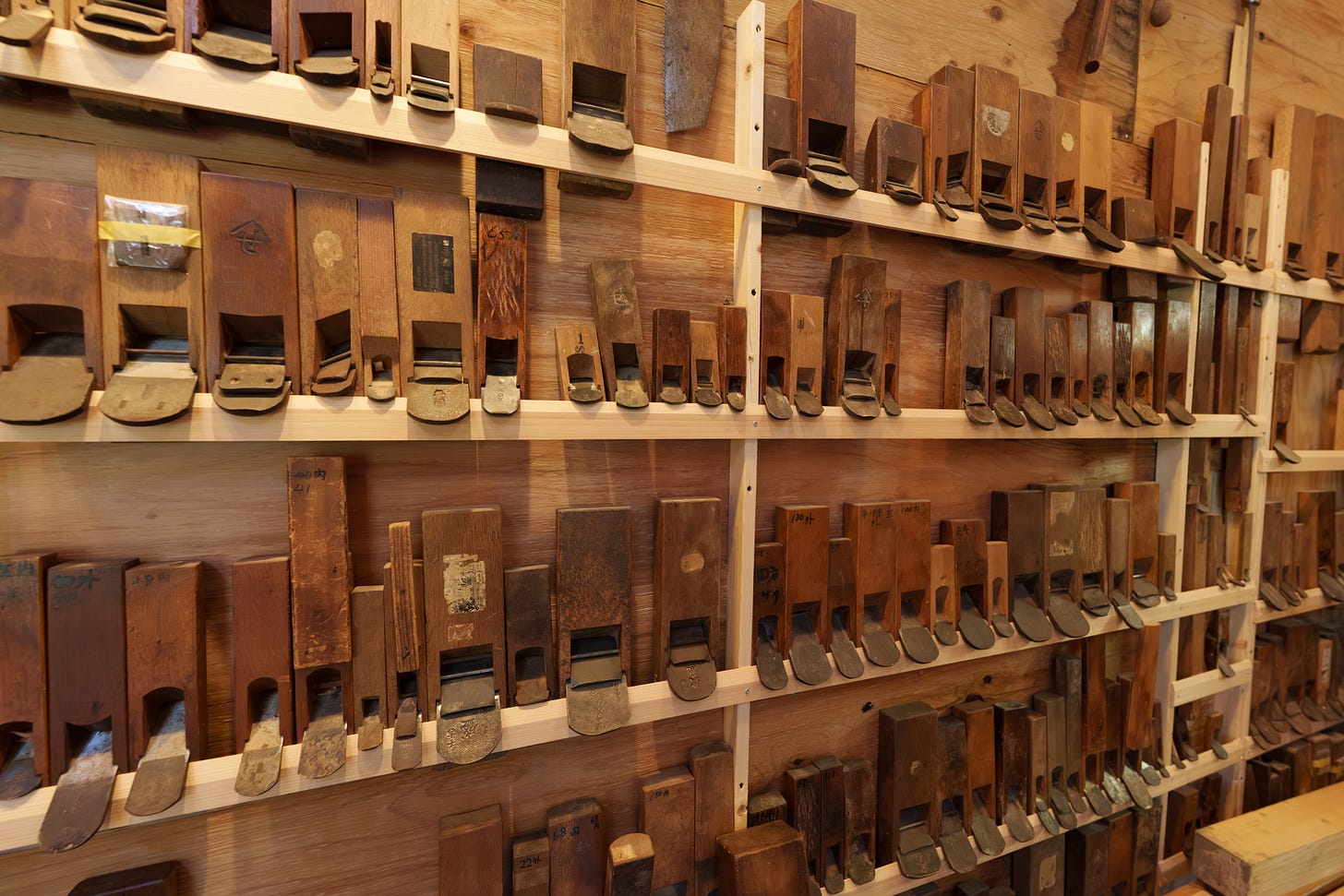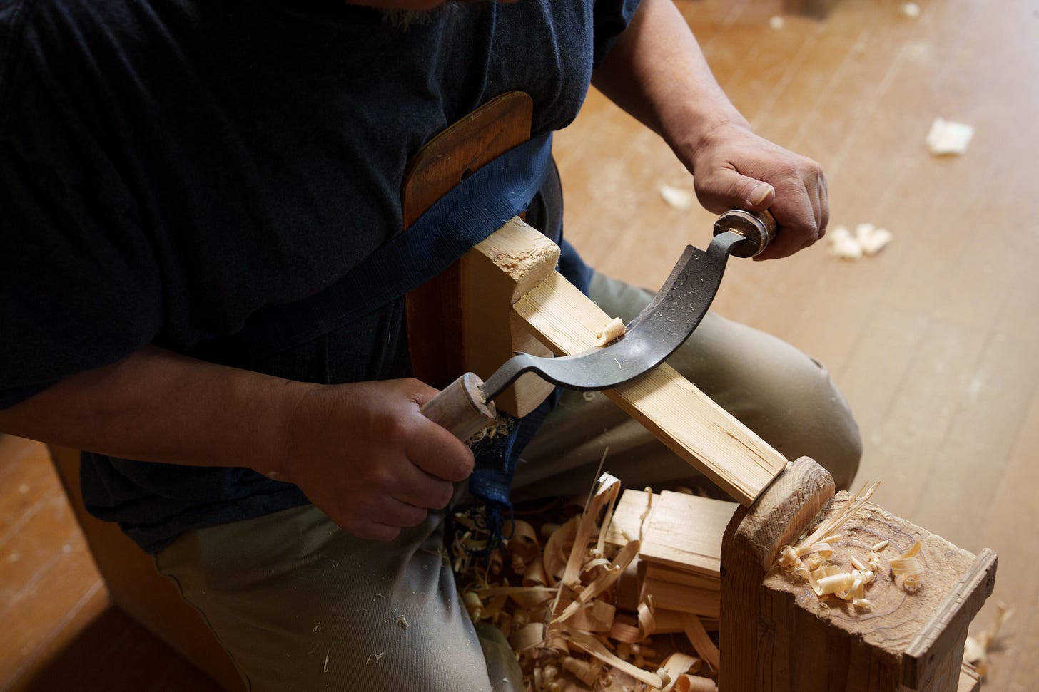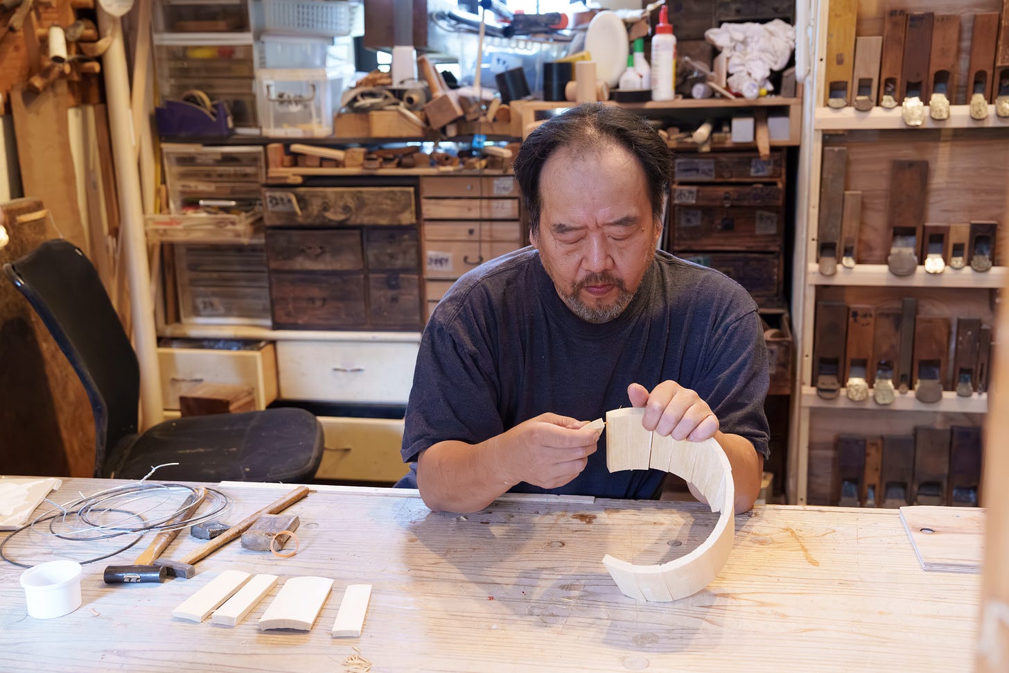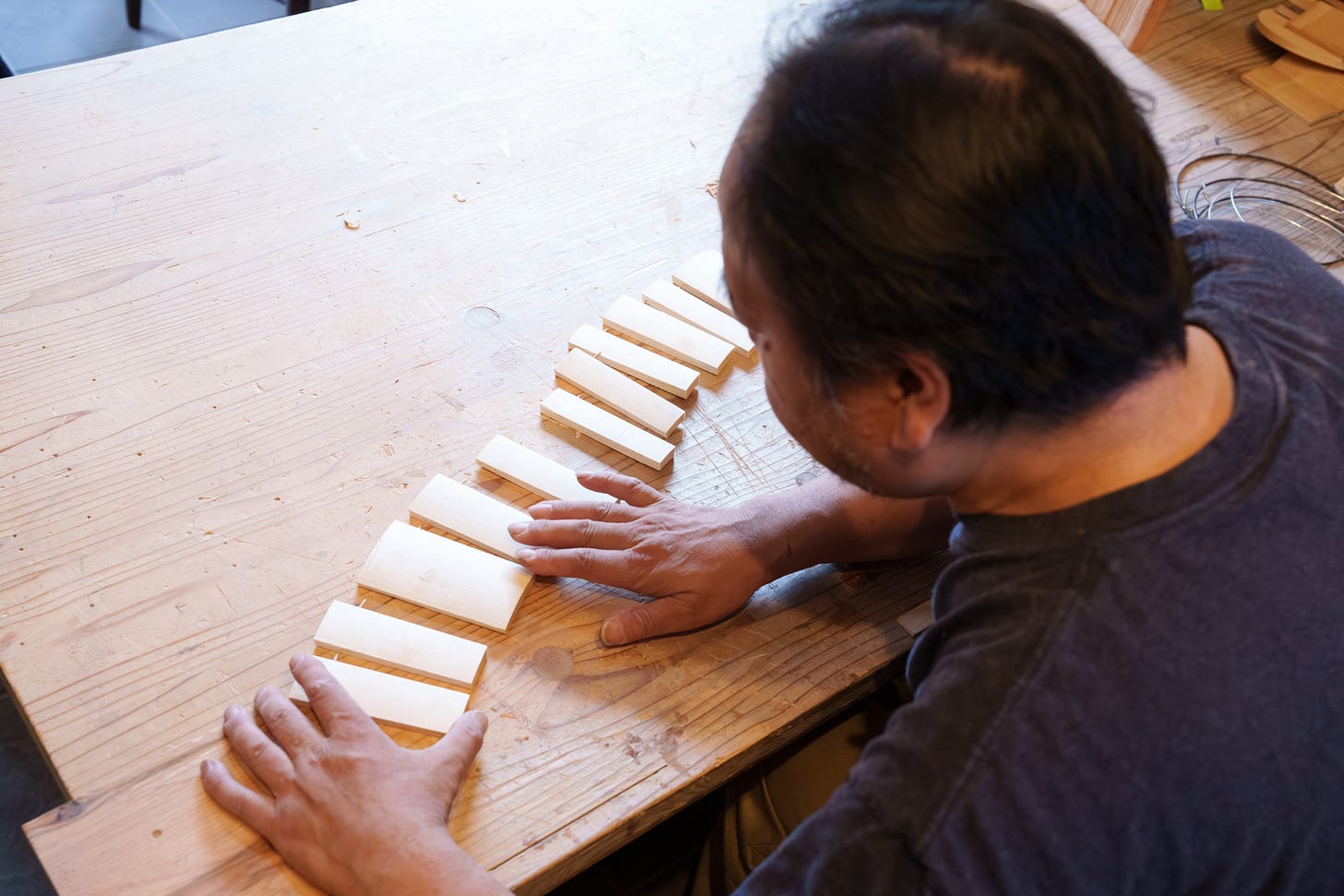 Shuji graduated from Kyoto Seika University with a degree in sculpting art, while simultaneously learning woodworking under his father. Contemporary art has always been his passion, and he began by exhibiting his paintings as a young artist. Today, he combines his skills as a woodworker with the creative vision of an artist, merging the techniques he inherited from his ancestors with art and architecture, while constantly revisiting traditions that are his source of innovation. From the beginning, he sought artistic independence, leaving his family's workshop in Kyoto to establish his own home and studio in Otsu, Shiga Prefecture, on the shores of Lake Biwa. Surrounded by open, unadulterated nature, he alters shapes, forms, and scales. He has devised new functions for centuries-old Japanese accessories, such as champagne coolers, side tables, and stools, as seen in the ‘Wooden Oke Tea Room,’ which was exhibited as Ateliers Courbet in New York last year, as he adapted his craft to architectural design. It was where I first met him, but seeing him again at his studio sanctuary was an excellent opportunity to experience the environment of his studio and witness a demonstration. His two-story workshop is filled with an enormous collection of old tools, all hung meticulously on the walls, at which I marveled, watching him at work.