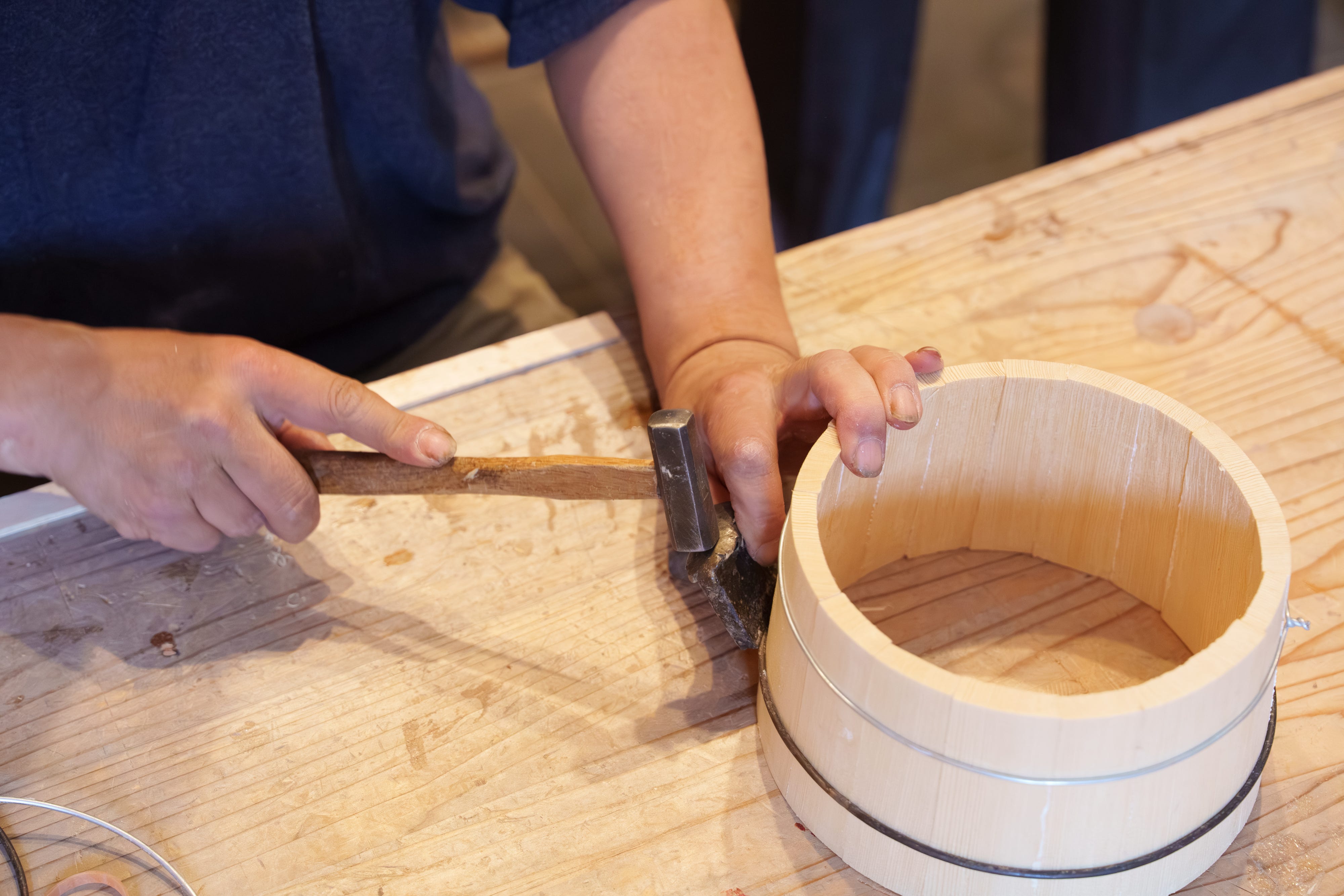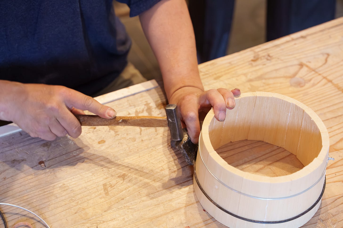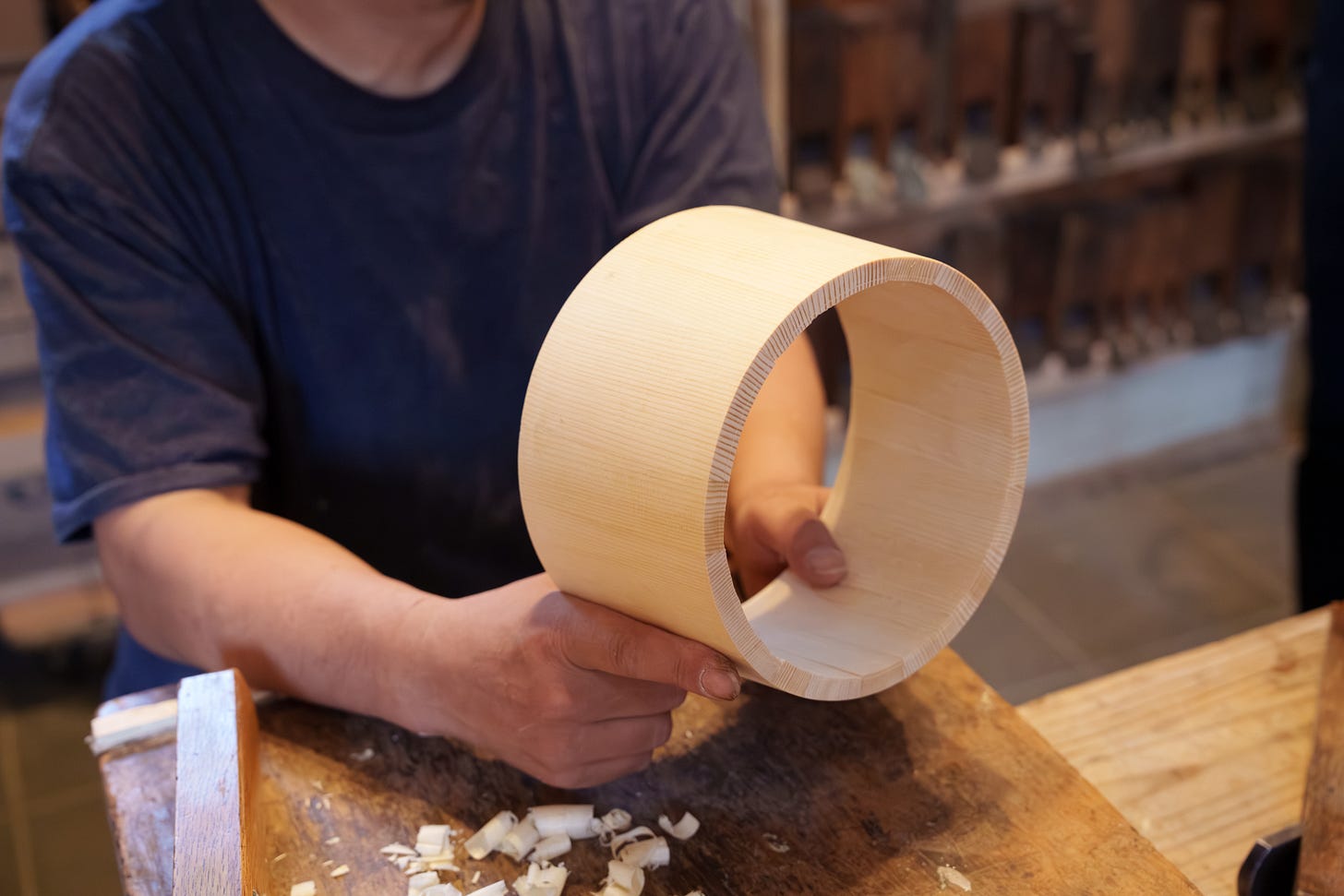 Shuji shaves the wooden slats using an old plane, then places them in a round configuration. The slats form the sides and bottoms of the buckets, and must fit together perfectly. He then connects them with bamboo nails and rice glue. As he was making an oke, he spoke about his memories of crafting pegs as a teenager at his father’s workshop. Every type of wood has its unique personality, look, consistency, and scent. The Jinai-Sugi, a variation of Japanese cedar that originates from northern Japan, symbolizes the interconnectedness of humanity and the natural world. Sawara cypress is renowned for its soft fragrance and exceptional water-absorbing properties, making it ideal for a rice container. In contrast, the Hinoki cypress is not suitable for food and drink due to its powerful scent, and instead is used for its health applications, making it a suitable species for wooden bathtubs and other bathroom elements.