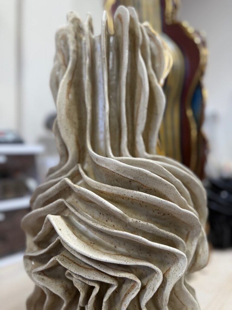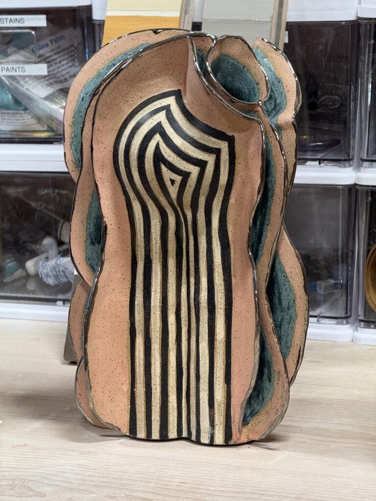 Every vessel begins its life on the wheel, where Anderson creates a variety of closed forms that he then combines into three-dimensional sculptures. He adds various elements that look like organic ribs, crafted in the coiling technique, and then rolled and stacked on the surface of the sculptures to add to the identity of these shapes, enriching them with textures and special dimensions. Painting and often lustering further enhanced his forms and served as the finishing touch. Anderson’s work is spontaneous, passionate, and surprising, as he is enriching the diverse, universal world of contemporary ceramics with his own voice. Each piece has its own unique character, each is one off. His next exhibition is particularly meaningful as it will take place in his hometown in Minneapolis, where he will be showing his work for the first time.